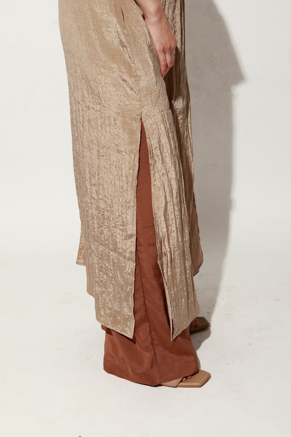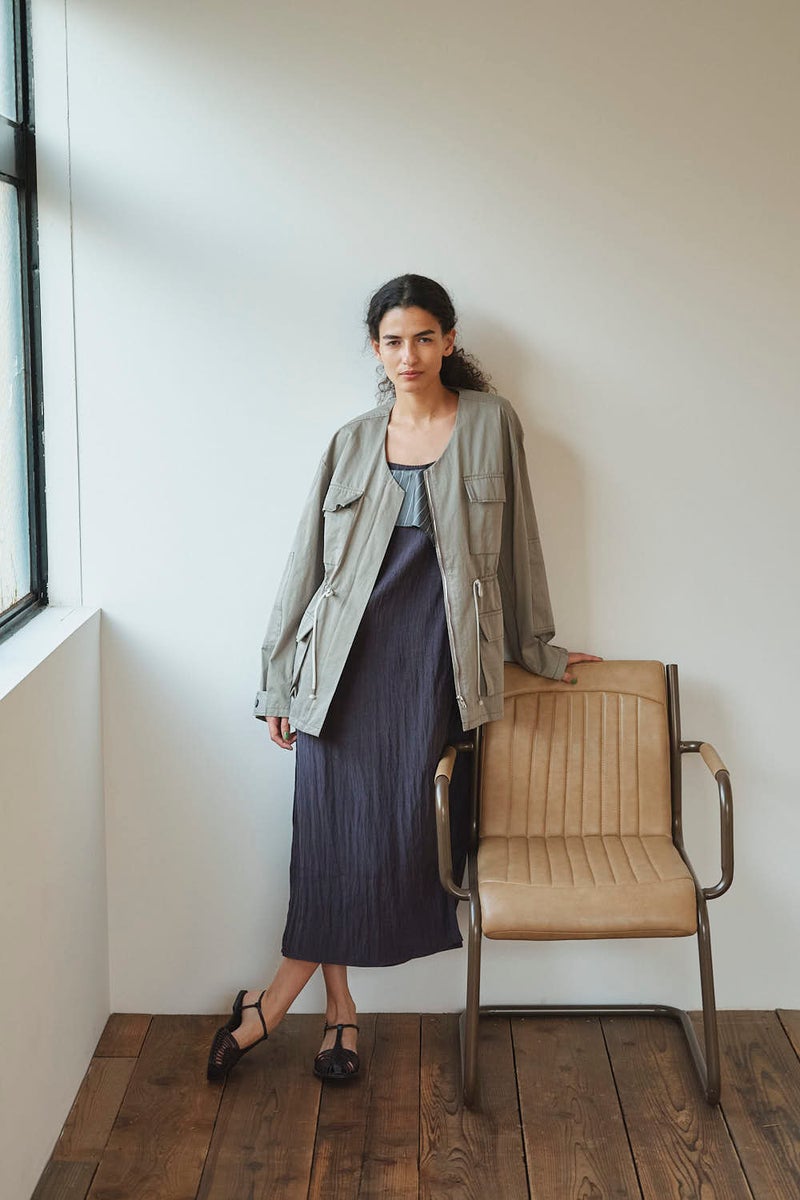 素材にはフィブリル加工を施し、ひんやりとしたタッチと上品な光沢感を実現。春夏の装いに映え、一枚でさらりと着るのはもちろん、Tシャツやシアートップスとのレイヤードでスタイルチェンジも自在です。