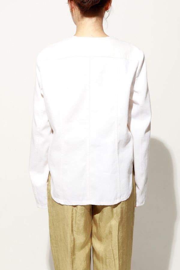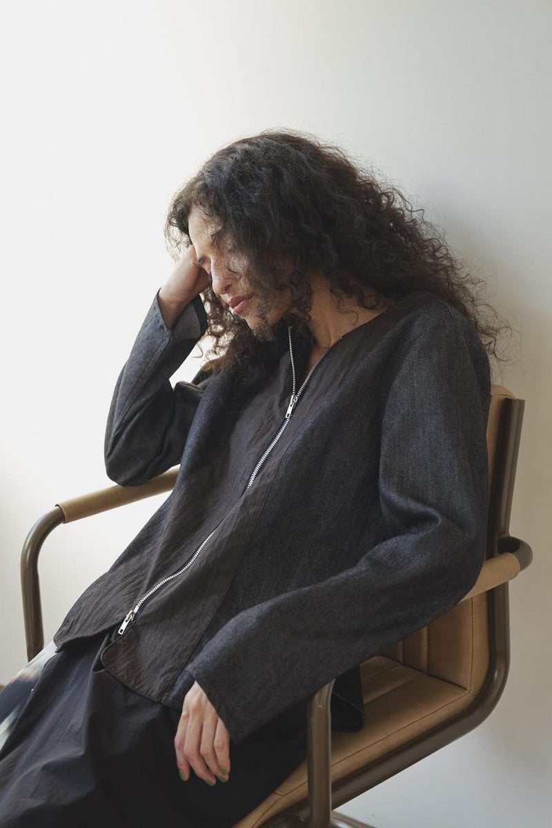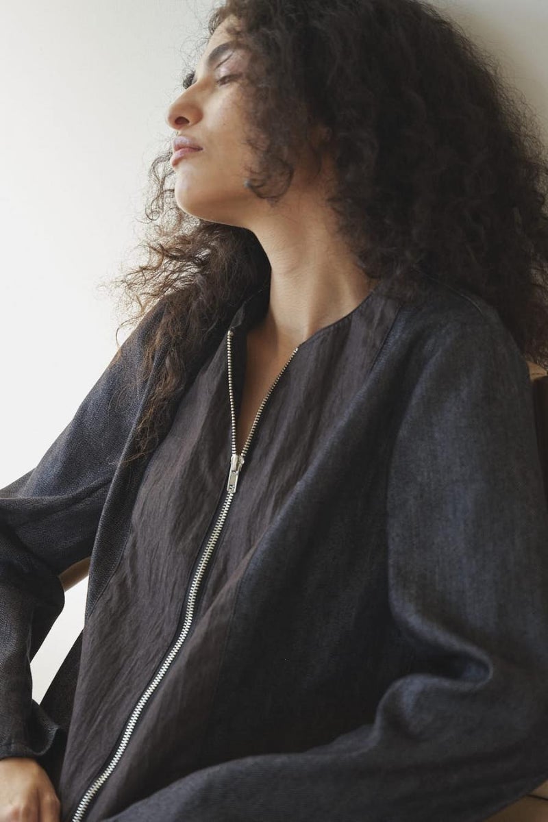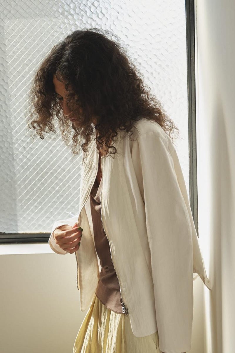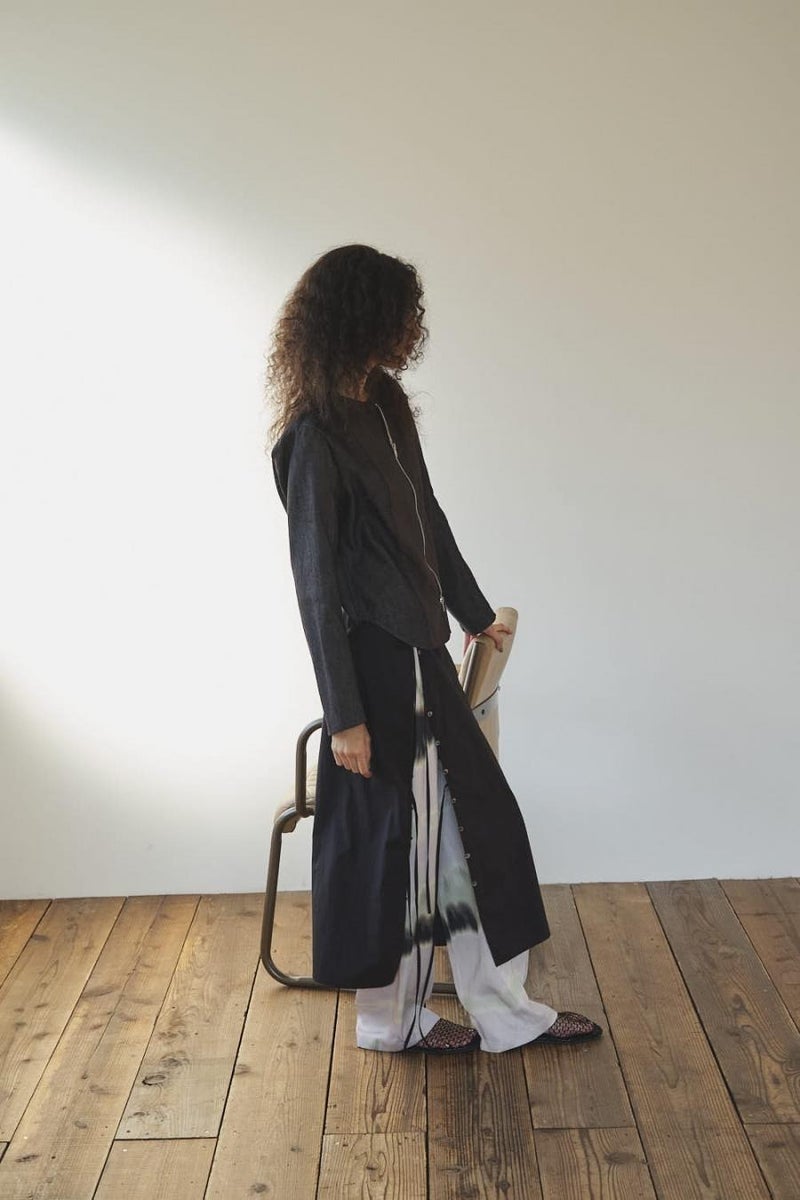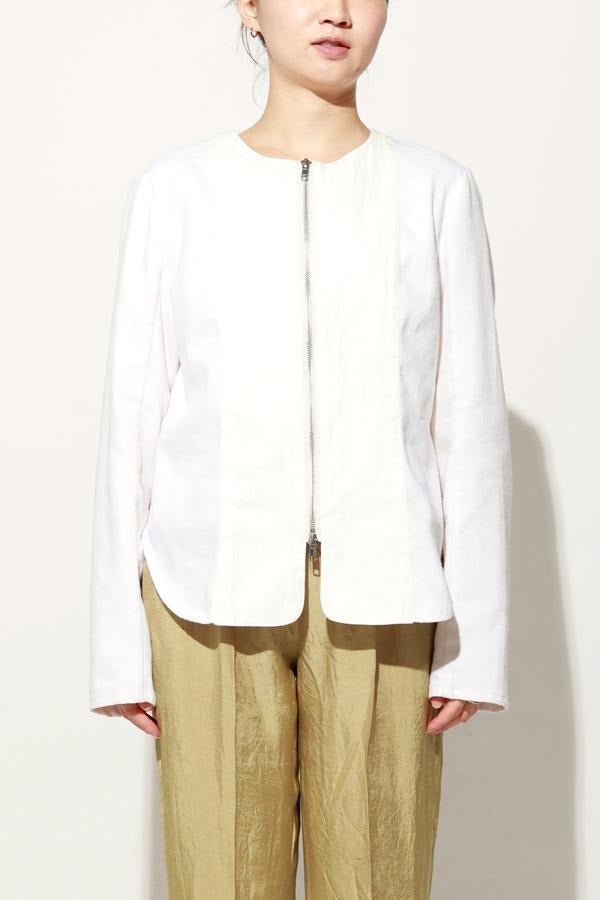 動きやすさと品格を両立する、異素材コンビが映えるブルゾン。 綿麻ならではのナチュラルな風合いに、異素材の切り替えを効かせたアイテム。 縦ラインを強調するデザインがシルエットをすっきり見せ、軽やかにスタイルアップを叶えます。 伸縮性のある生地が動きやすさを引き立て、見た目のシャープさに反して快適な着心地。さらに製品加工でバイオウォッシュを施し、ほどよいユーズド感と奥行きのある表情をプラスしました。 着るほどに風合いが増し、愛着の湧く一枚に仕上がっています。 デニムでラフにまとめれば洗練されたカジュアルに、タイトスカートやスラックスならオフィスカジュアルに早変わり。 コンパクトな丈感はワイドパンツやボリュームスカートとも好相性で、幅広いシーンで着回せます。