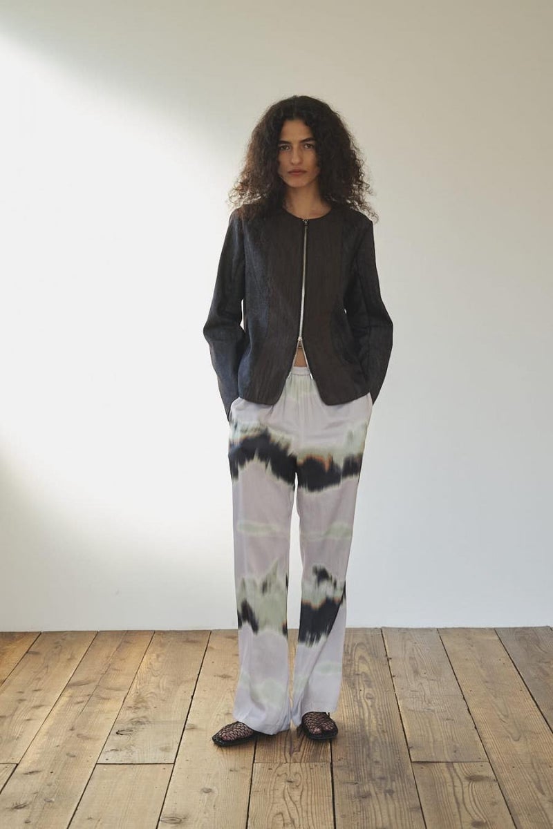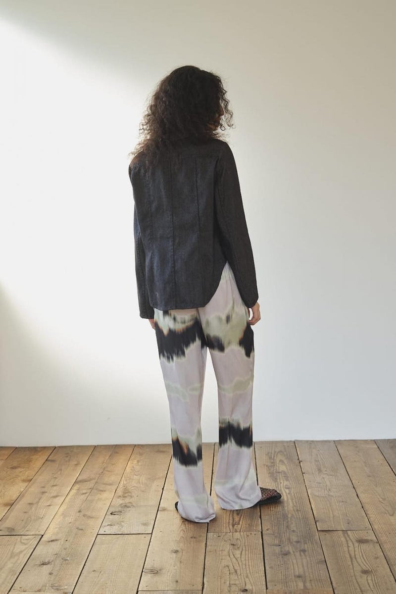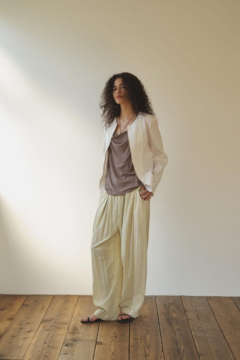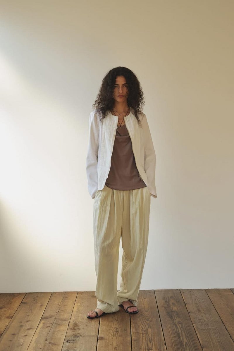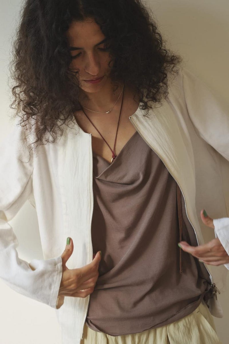 動きやすさと品格を両立する、異素材コンビが映えるブルゾン。 綿麻ならではのナチュラルな風合いに、異素材の切り替えを効かせたアイテム。 縦ラインを強調するデザインがシルエットをすっきり見せ、軽やかにスタイルアップを叶えます。 伸縮性のある生地が動きやすさを引き立て、見た目のシャープさに反して快適な着心地。さらに製品加工でバイオウォッシュを施し、ほどよいユーズド感と奥行きのある表情をプラスしました。 着るほどに風合いが増し、愛着の湧く一枚に仕上がっています。 デニムでラフにまとめれば洗練されたカジュアルに、タイトスカートやスラックスならオフィスカジュアルに早変わり。 コンパクトな丈感はワイドパンツやボリュームスカートとも好相性で、幅広いシーンで着回せます。
