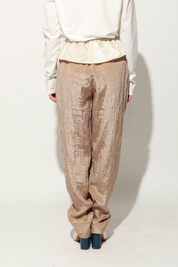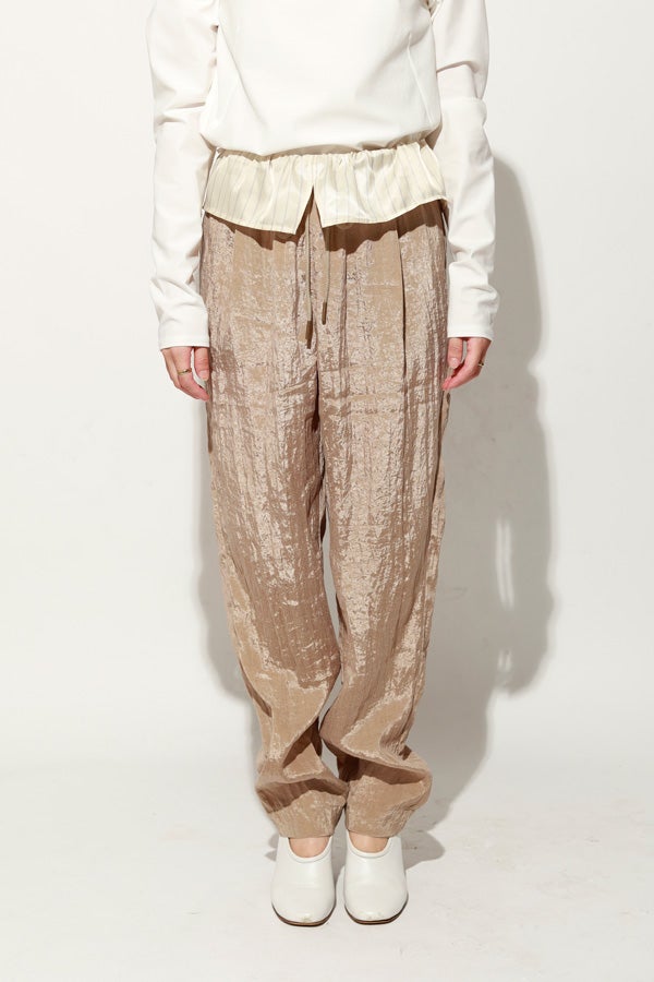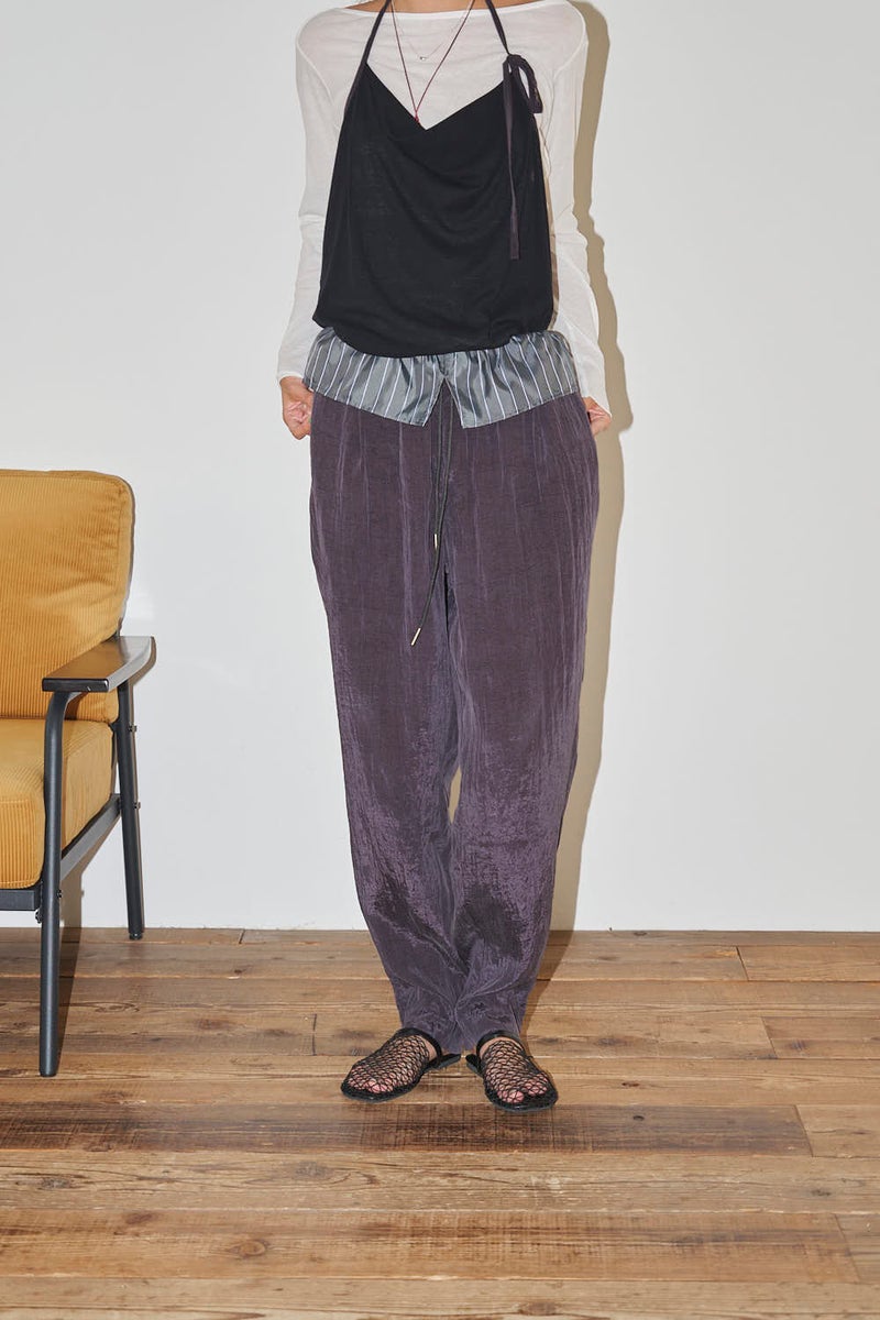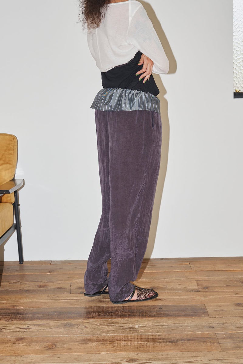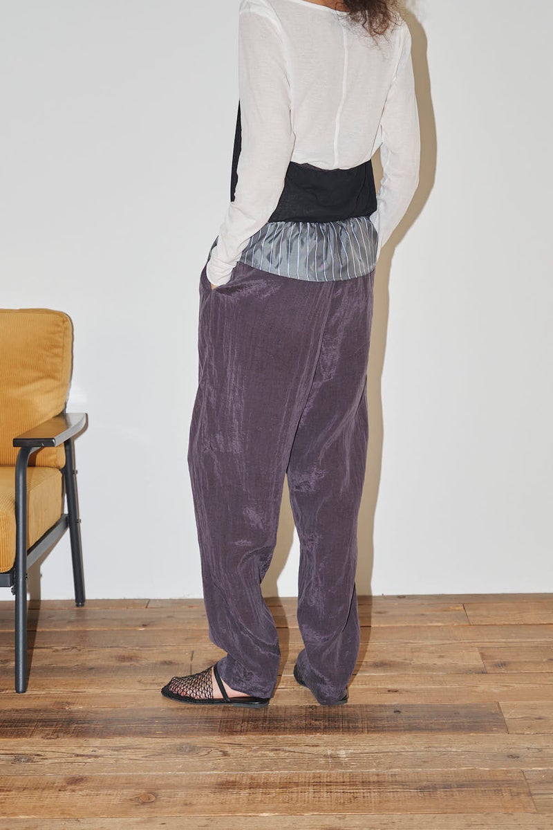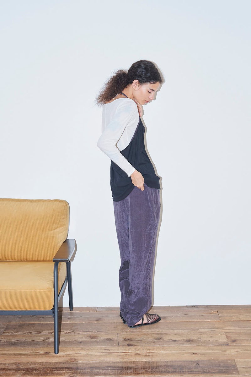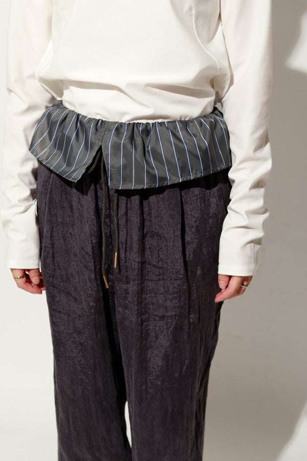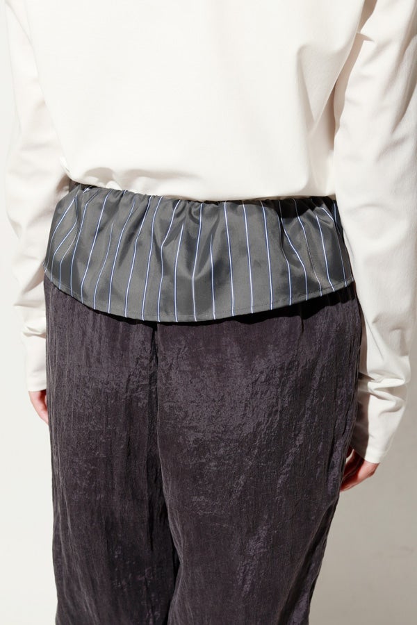 ウエストで魅せる、2WAYデザインテーパードパンツ。 美しいテーパードラインに、ウエスト部分の別布デザインがアクセントを効かせたアイテム。別布は内側に折り込むことで、シンプルなスタイルにも変化し、シーンや気分に合わせて2WAYで楽しめます。 素材にはフィブリル加工を施し、肌に触れるたびにひんやりと心地よいタッチを実現。さらに上品な光沢感が加わり、洗練された印象を演出します。 別布を見せてコンパクトなトップスをインすれば、ウエストデザインが主役のモードな着こなしに。内側に折り込んで白シャツやブラウスと合わせれば、オフィスにも映える上品スタイルに仕上がります。 ●フィブリル加工とは 繊維に物理的な力が加わることで、繊維を構成する微細な繊維(フィブリル)が毛羽立って表面に出る現象を利用した加工。 ●手洗い可