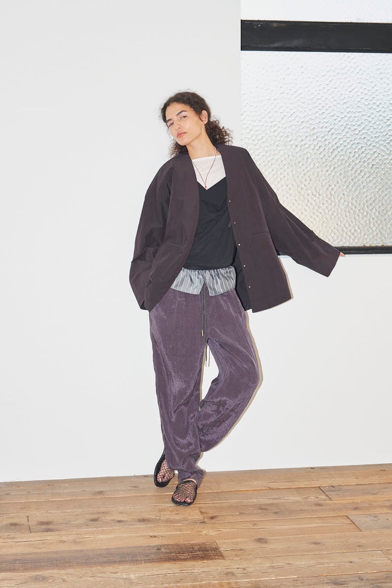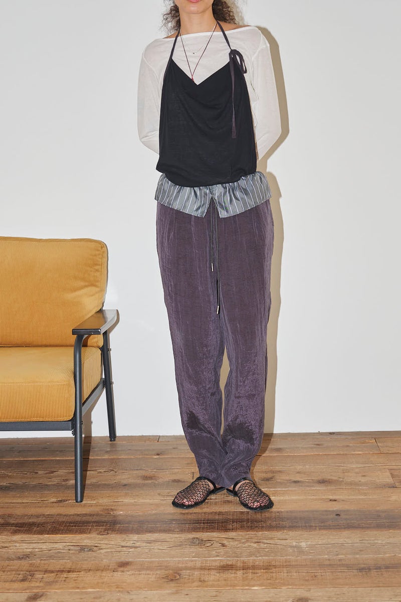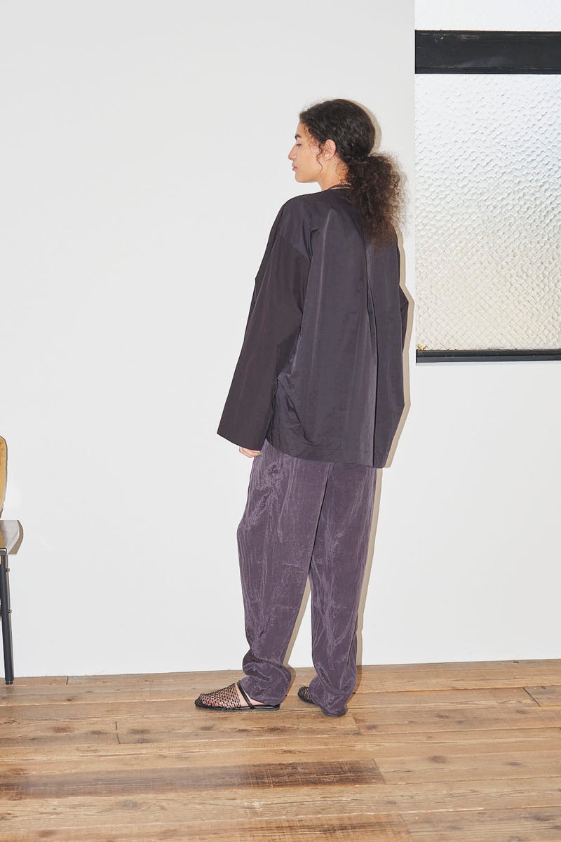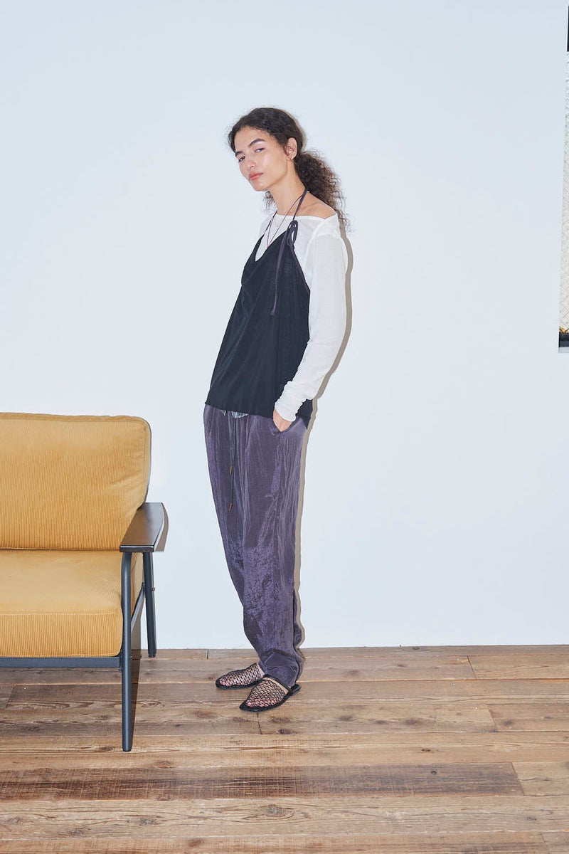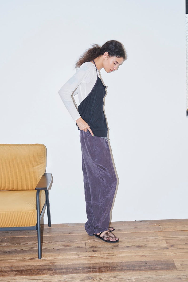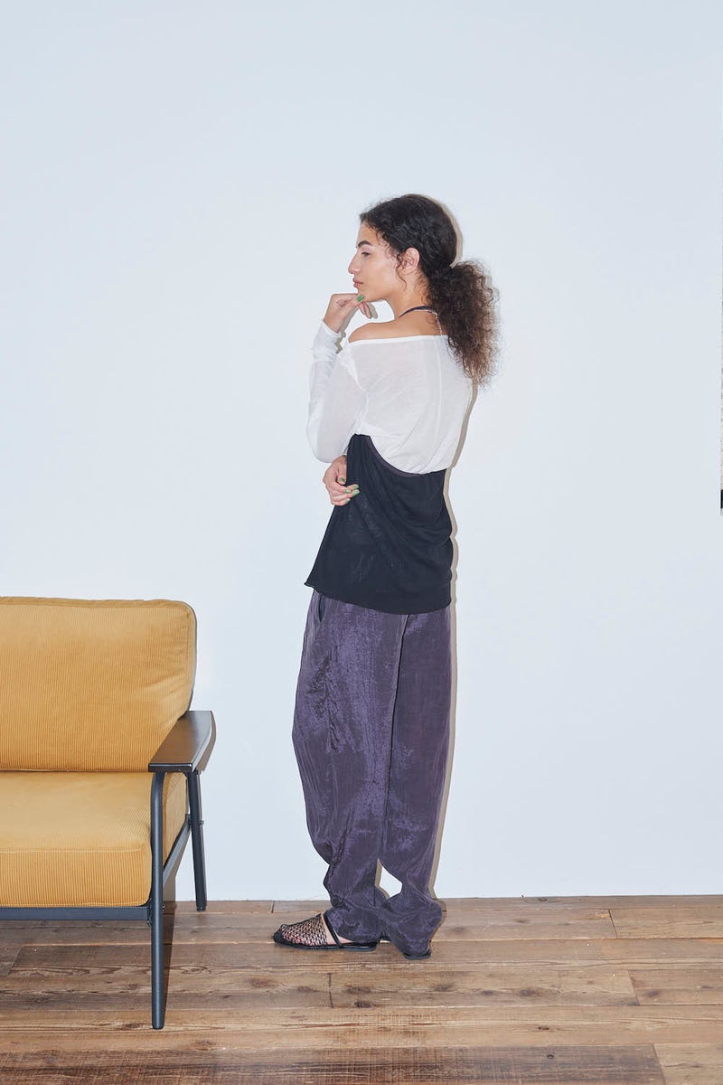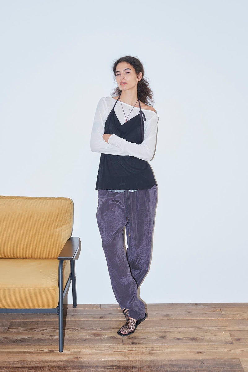 ウエストで魅せる、2WAYデザインテーパードパンツ。 美しいテーパードラインに、ウエスト部分の別布デザインがアクセントを効かせたアイテム。別布は内側に折り込むことで、シンプルなスタイルにも変化し、シーンや気分に合わせて2WAYで楽しめます。 素材にはフィブリル加工を施し、肌に触れるたびにひんやりと心地よいタッチを実現。さらに上品な光沢感が加わり、洗練された印象を演出します。 別布を見せてコンパクトなトップスをインすれば、ウエストデザインが主役のモードな着こなしに。内側に折り込んで白シャツやブラウスと合わせれば、オフィスにも映える上品スタイルに仕上がります。 ●フィブリル加工とは 繊維に物理的な力が加わることで、繊維を構成する微細な繊維(フィブリル)が毛羽立って表面に出る現象を利用した加工。 ●手洗い可