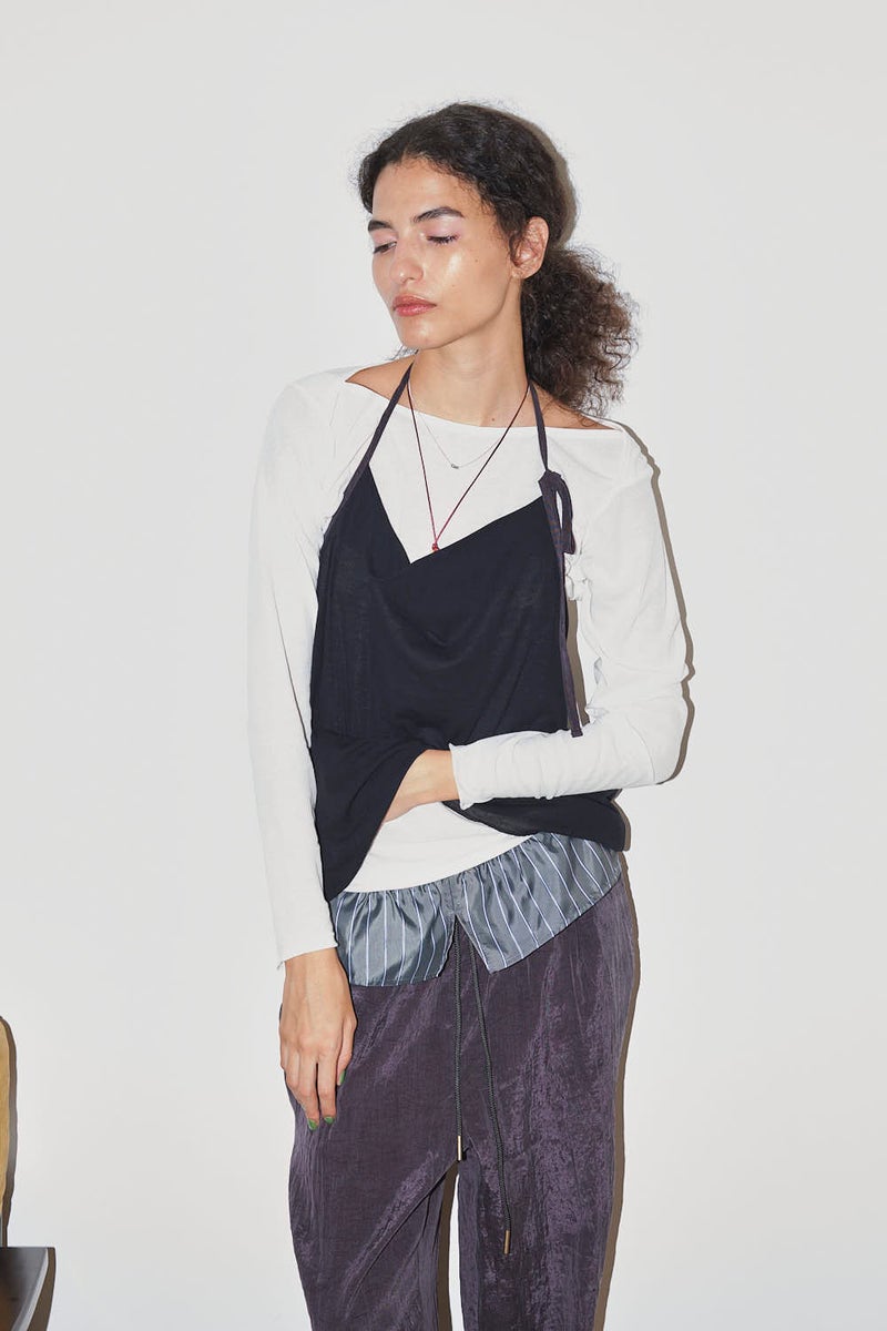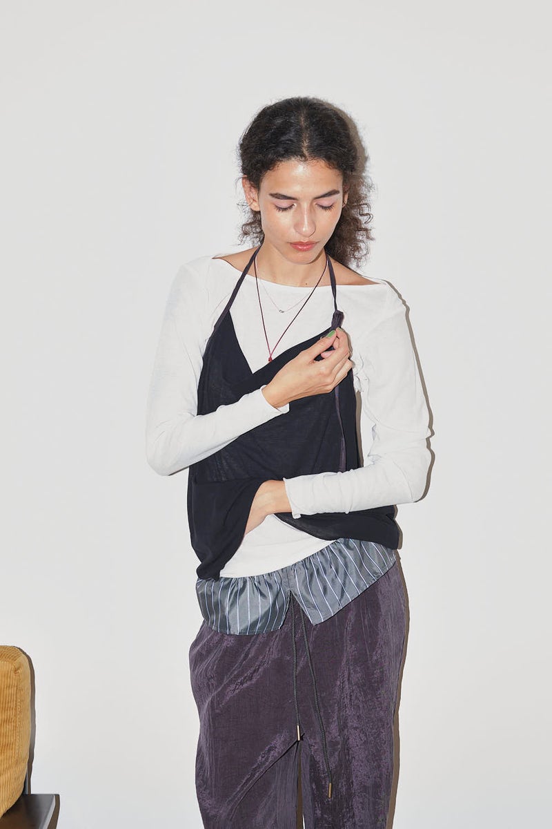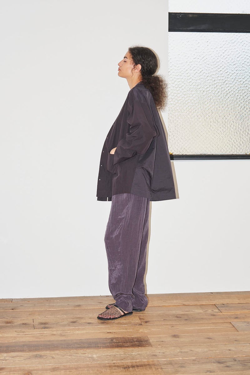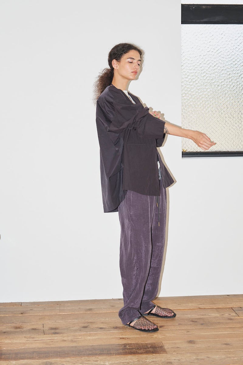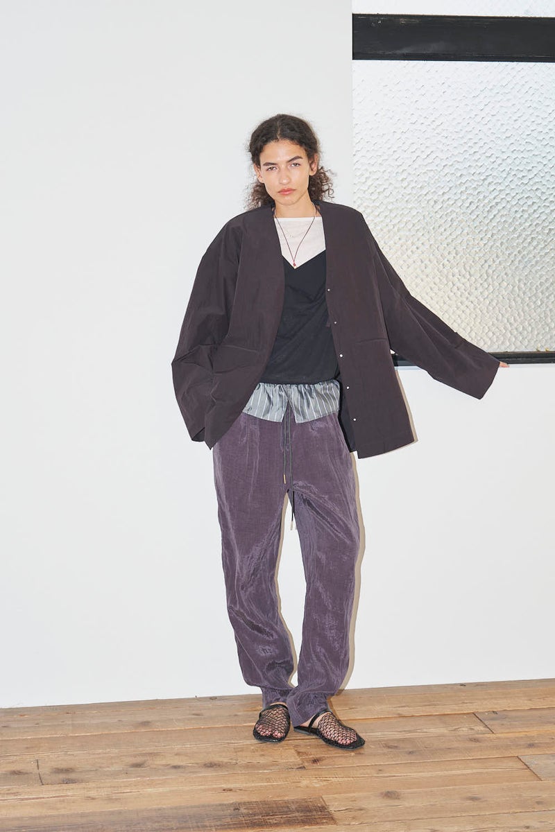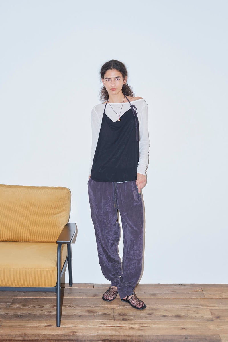 ウエストで魅せる、2WAYデザインテーパードパンツ。 美しいテーパードラインに、ウエスト部分の別布デザインがアクセントを効かせたアイテム。別布は内側に折り込むことで、シンプルなスタイルにも変化し、シーンや気分に合わせて2WAYで楽しめます。 素材にはフィブリル加工を施し、肌に触れるたびにひんやりと心地よいタッチを実現。さらに上品な光沢感が加わり、洗練された印象を演出します。 別布を見せてコンパクトなトップスをインすれば、ウエストデザインが主役のモードな着こなしに。内側に折り込んで白シャツやブラウスと合わせれば、オフィスにも映える上品スタイルに仕上がります。 ●フィブリル加工とは 繊維に物理的な力が加わることで、繊維を構成する微細な繊維(フィブリル)が毛羽立って表面に出る現象を利用した加工。 ●手洗い可