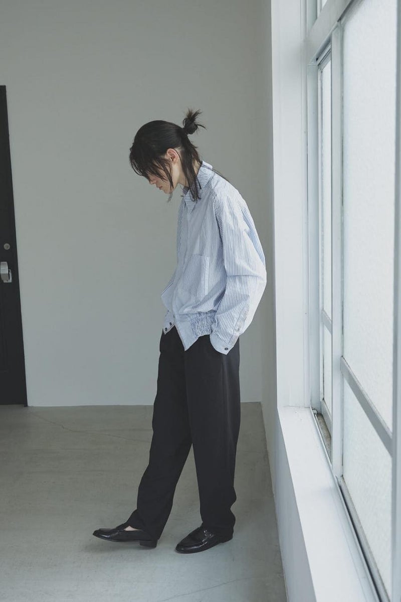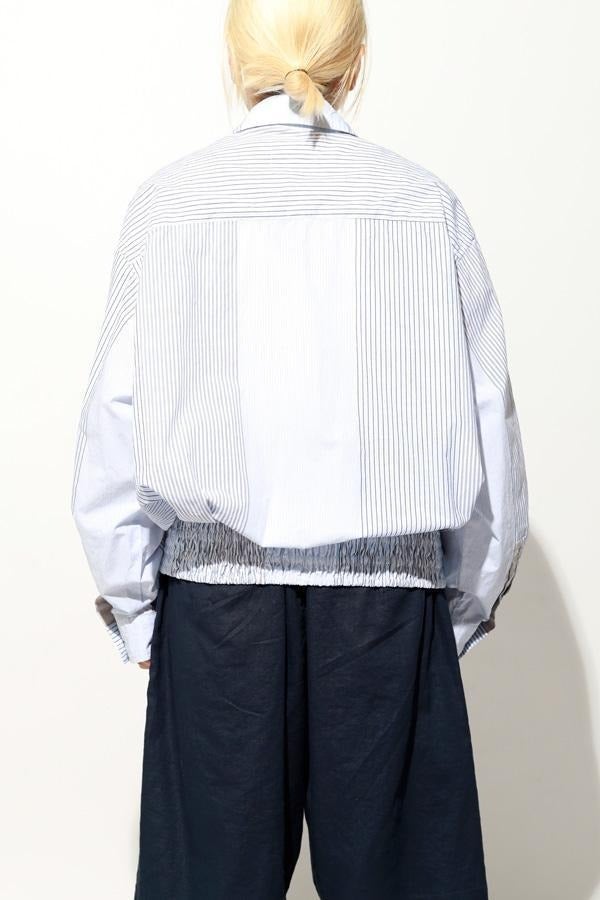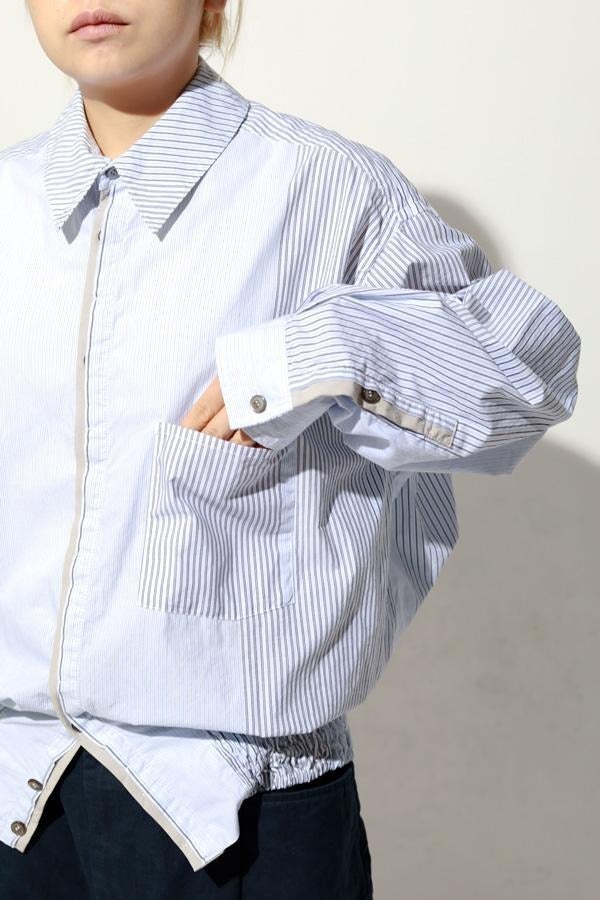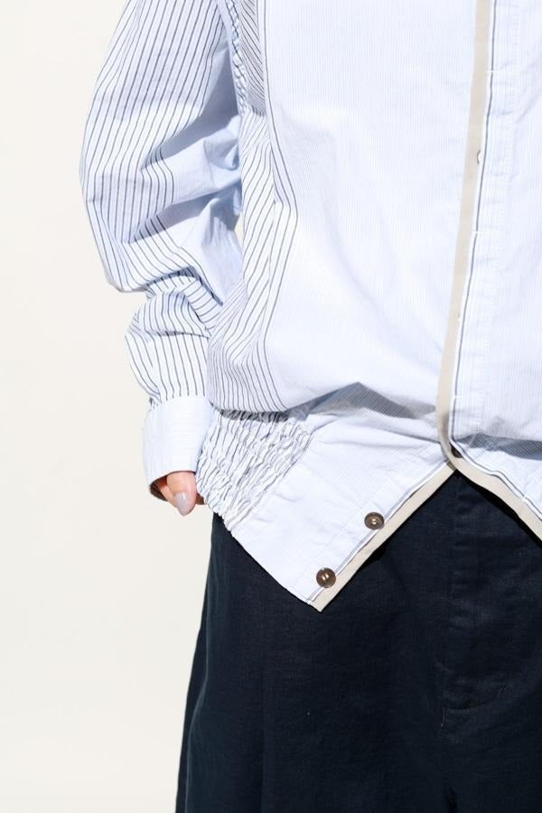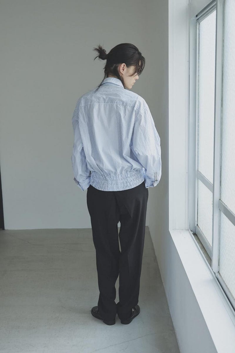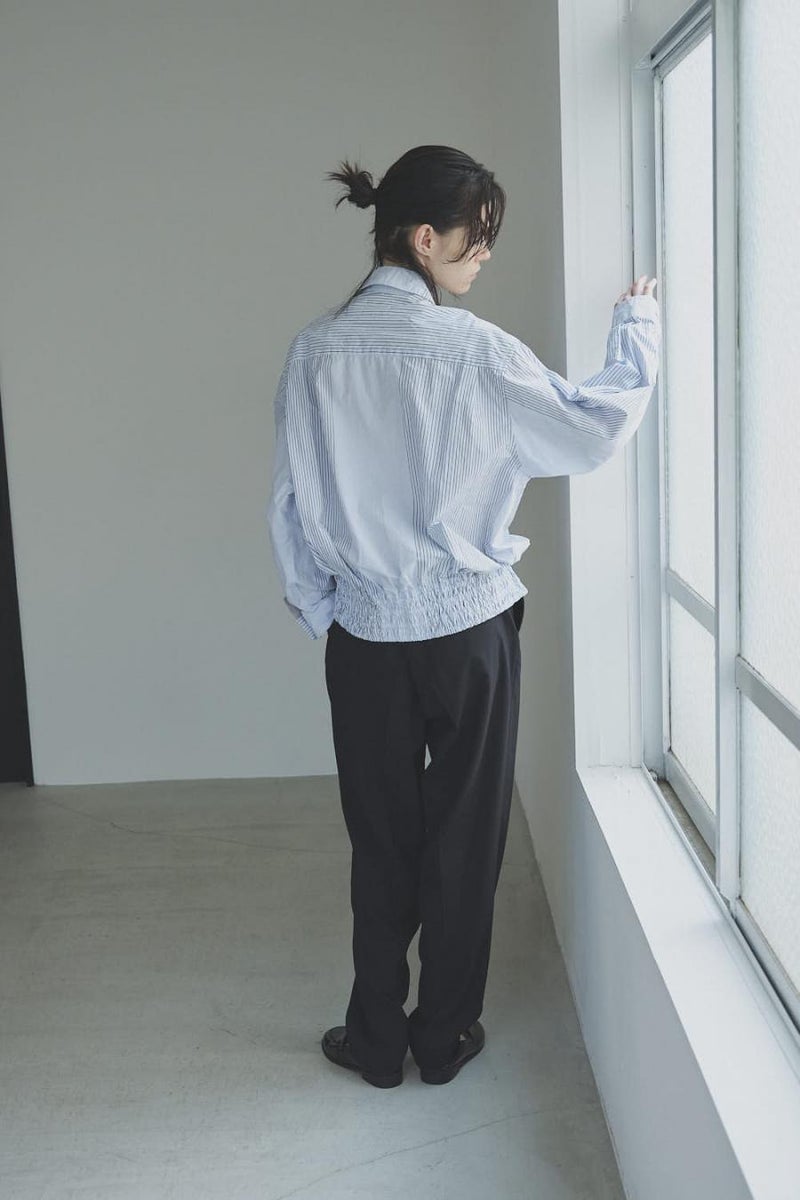 1枚で印象チェンジ。着回し力抜群のストライプシャツブルゾン。 ゆとりのあるシルエットは、1枚でさらりとリラックスして着こなせる心地よさ。 裾にはブルゾンのリブのようなギャザーを施し、ボタンを留めればブルゾン風に、開ければシャツのように羽織れる、表情豊かなアイテムです。 裾のみ横穴仕様のボタンホールにすることで、ボタンへの負荷を軽減し、長く愛用できる仕様にしています。 ランダムストライプ柄は、太さやカラーの異なるラインが組み合わさり、奥行きのある表情を演出。 フロントと剣ボロ(袖口の短冊状の部分)には配色比翼デザインを採用し、ボタンを半分見せることでラフさをプラス。 ボタンを表に出すことも、隠すことも自在に楽しめるので、その日の気分で印象を変えられます。 さらに下前には別布を用い、フロントにアクセントラインを加えるなど細部に拘りが光ります。