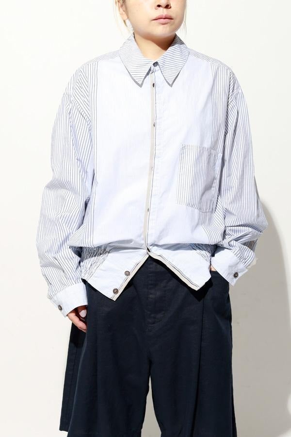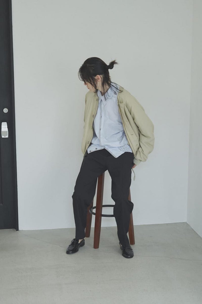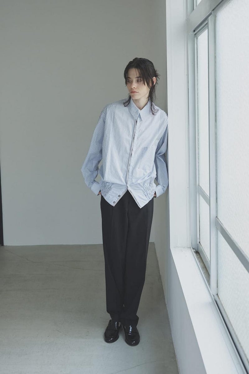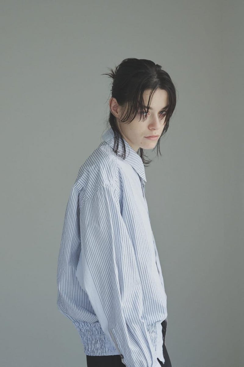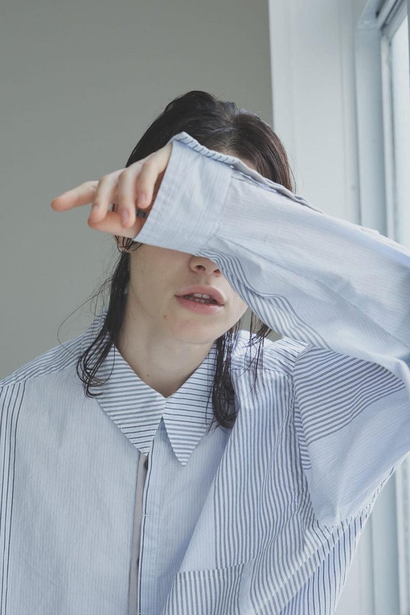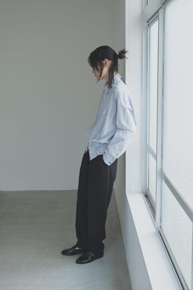 1枚で印象チェンジ。着回し力抜群のストライプシャツブルゾン。 ゆとりのあるシルエットは、1枚でさらりとリラックスして着こなせる心地よさ。 裾にはブルゾンのリブのようなギャザーを施し、ボタンを留めればブルゾン風に、開ければシャツのように羽織れる、表情豊かなアイテムです。 裾のみ横穴仕様のボタンホールにすることで、ボタンへの負荷を軽減し、長く愛用できる仕様にしています。 ランダムストライプ柄は、太さやカラーの異なるラインが組み合わさり、奥行きのある表情を演出。 フロントと剣ボロ(袖口の短冊状の部分)には配色比翼デザインを採用し、ボタンを半分見せることでラフさをプラス。 ボタンを表に出すことも、隠すことも自在に楽しめるので、その日の気分で印象を変えられます。 さらに下前には別布を用い、フロントにアクセントラインを加えるなど細部に拘りが光ります。