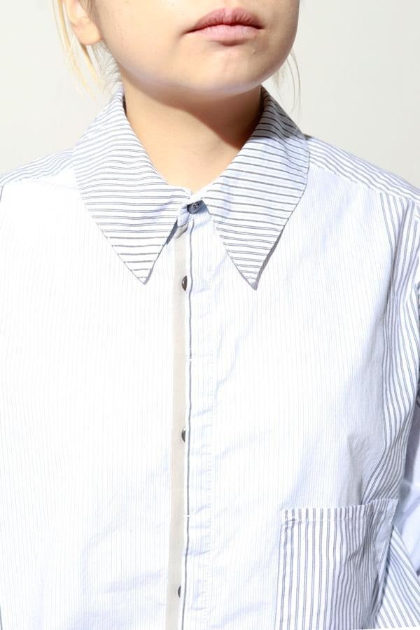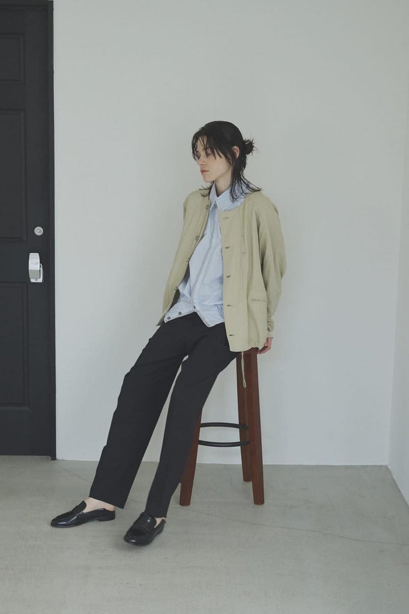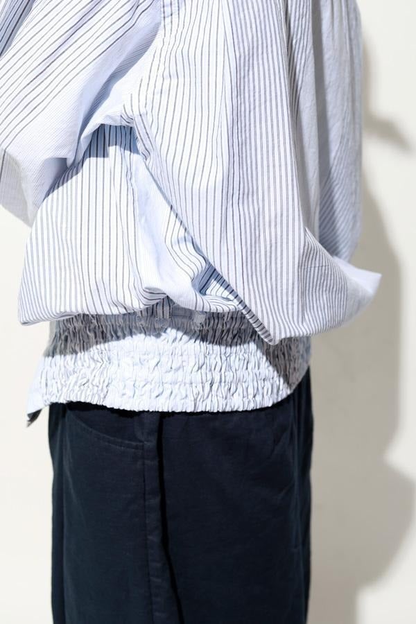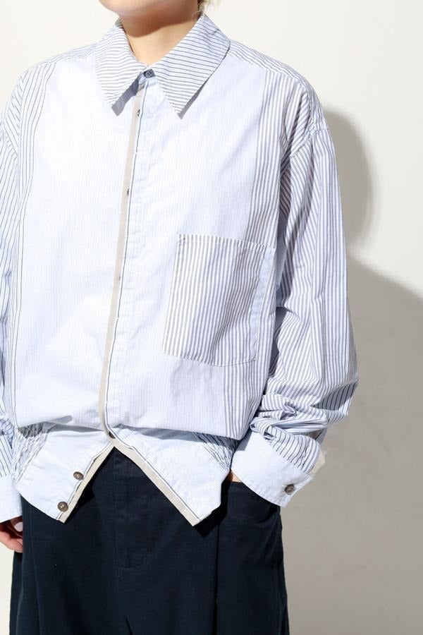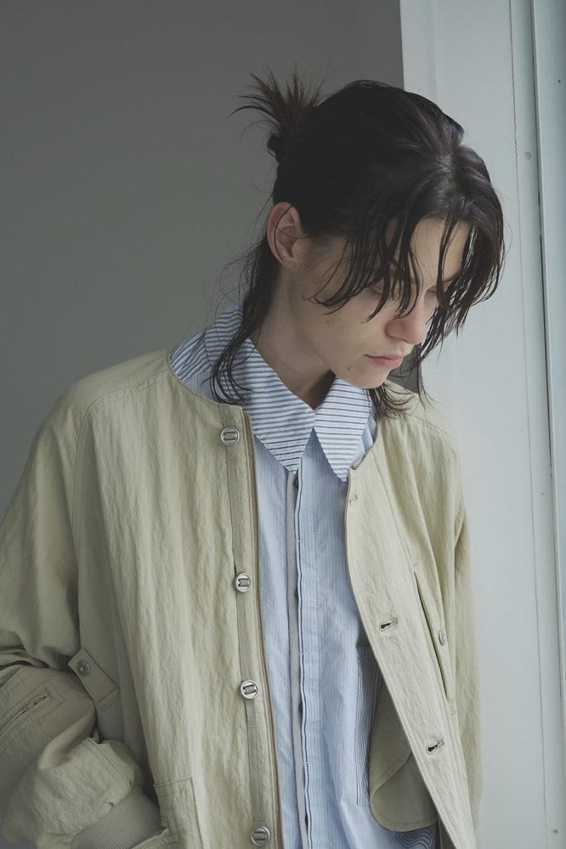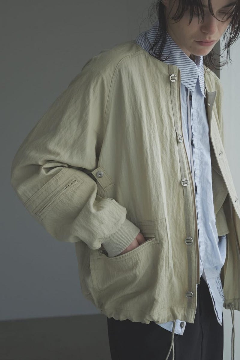 1枚で印象チェンジ。着回し力抜群のストライプシャツブルゾン。 ゆとりのあるシルエットは、1枚でさらりとリラックスして着こなせる心地よさ。 裾にはブルゾンのリブのようなギャザーを施し、ボタンを留めればブルゾン風に、開ければシャツのように羽織れる、表情豊かなアイテムです。 裾のみ横穴仕様のボタンホールにすることで、ボタンへの負荷を軽減し、長く愛用できる仕様にしています。 ランダムストライプ柄は、太さやカラーの異なるラインが組み合わさり、奥行きのある表情を演出。 フロントと剣ボロ(袖口の短冊状の部分)には配色比翼デザインを採用し、ボタンを半分見せることでラフさをプラス。 ボタンを表に出すことも、隠すことも自在に楽しめるので、その日の気分で印象を変えられます。 さらに下前には別布を用い、フロントにアクセントラインを加えるなど細部に拘りが光ります。