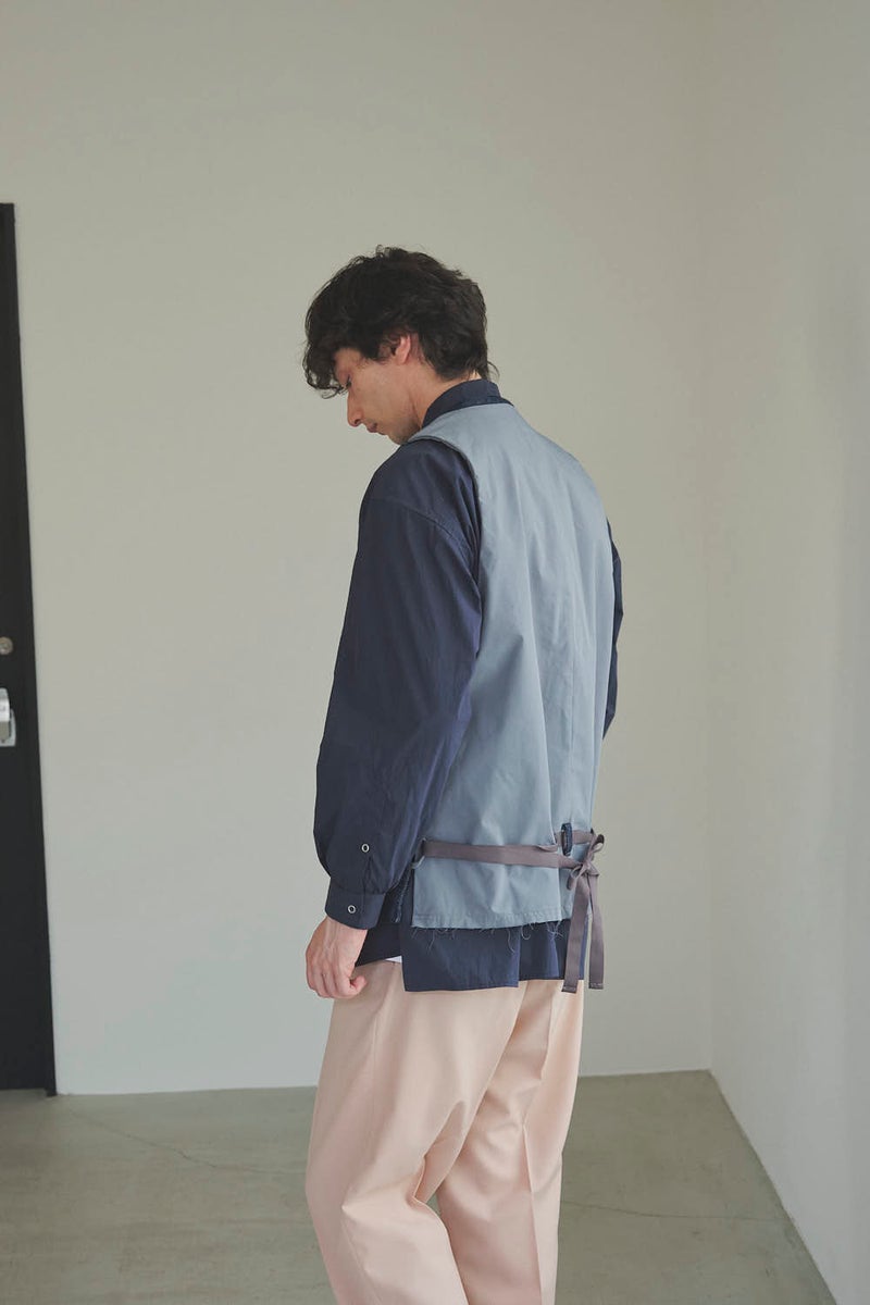 カバーオールをベースにした存在感たっぷりのデザイン。ゆったりとしたサイズ感に、雰囲気のある小ポケットや脇の深いスリット、後ろのテープ尾錠でシルエット調整ができる仕様など、実用性とデザイン性を両立。