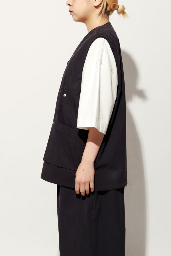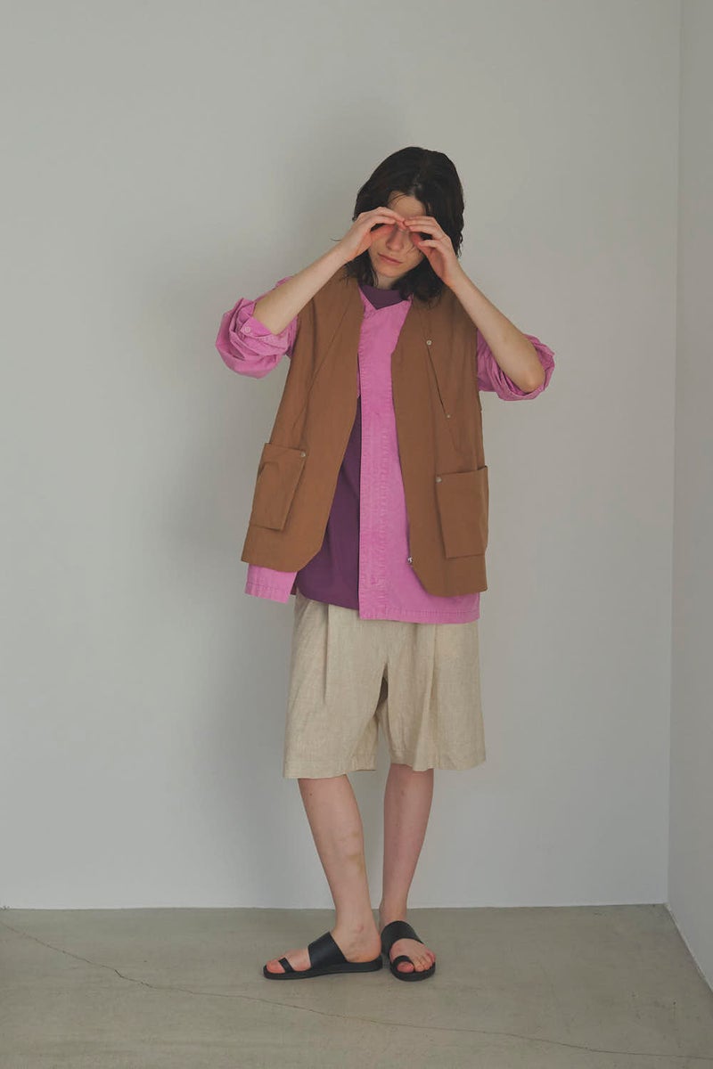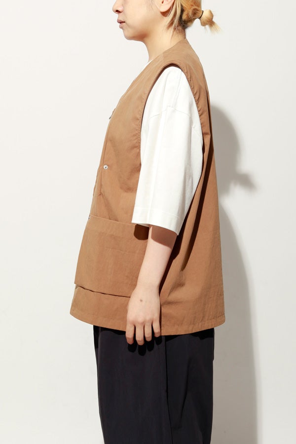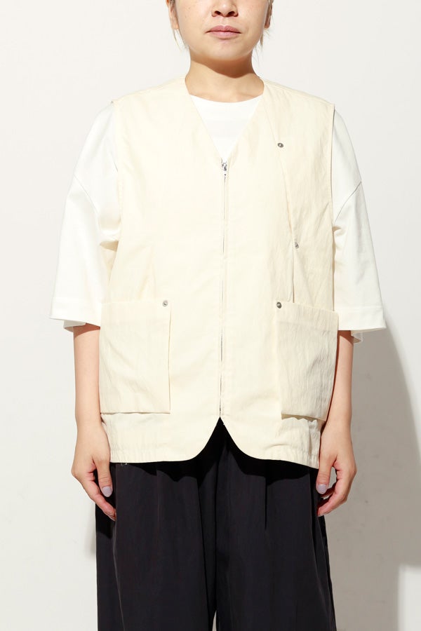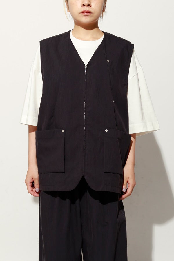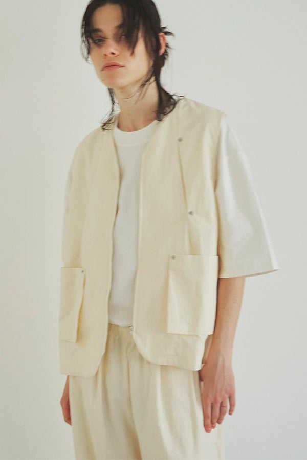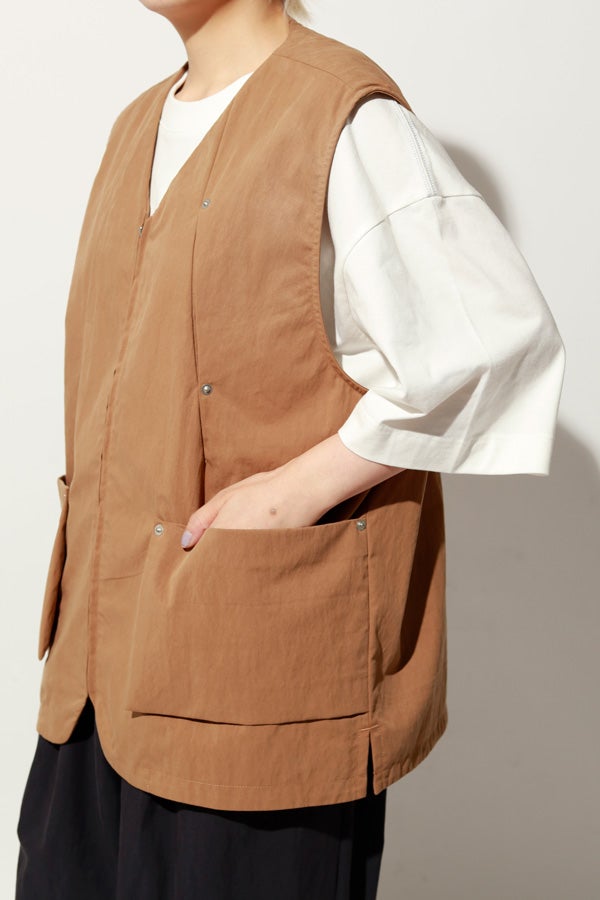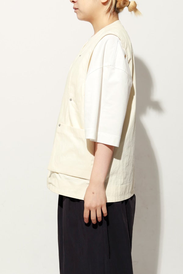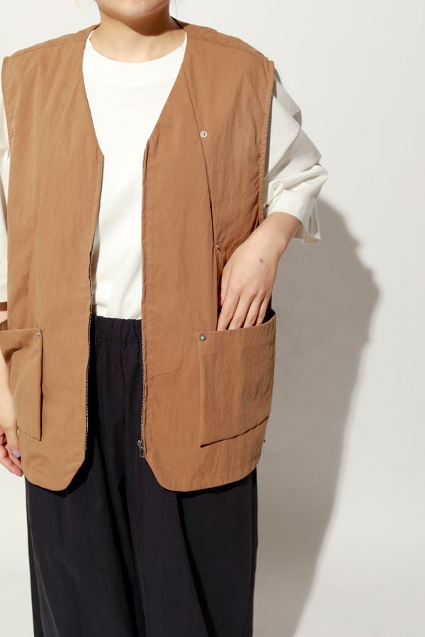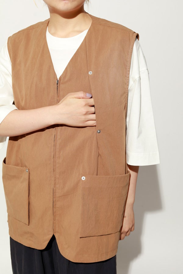 シンプルに見えて高機能。大人のためのワークベスト。 見た目はシンプルなのに、実は機能的ポケットでしっかり収納できるアイテム。 程よいゆとりのあるシルエットで、羽織るだけでこなれた印象に。 素材には、コットンナイロンのウェザー生地を使用。洗いをかけることで白けた風合いを出し、糸に毛羽感を持たせることでほんのり起毛感のある、味わい深い表情に仕上げています。しなやかな肌触りがあり、上品さを感じる質感です。 スーツベストのきちんと感に、ワークやミリタリーのテイストをプラス。胸ポケットや隠しマチポケットなど、機能性を備えたディテールで、大人カジュアルな着こなしに活躍する一着。 ●2サイズ展開 ●オーバーパンツ(26155-9919C)とセットアップ可