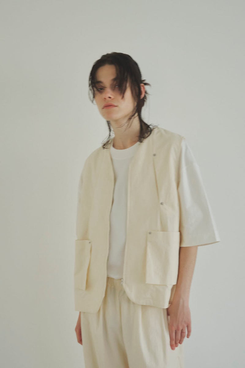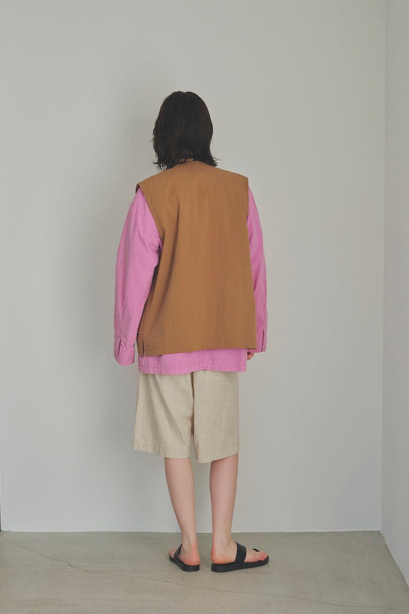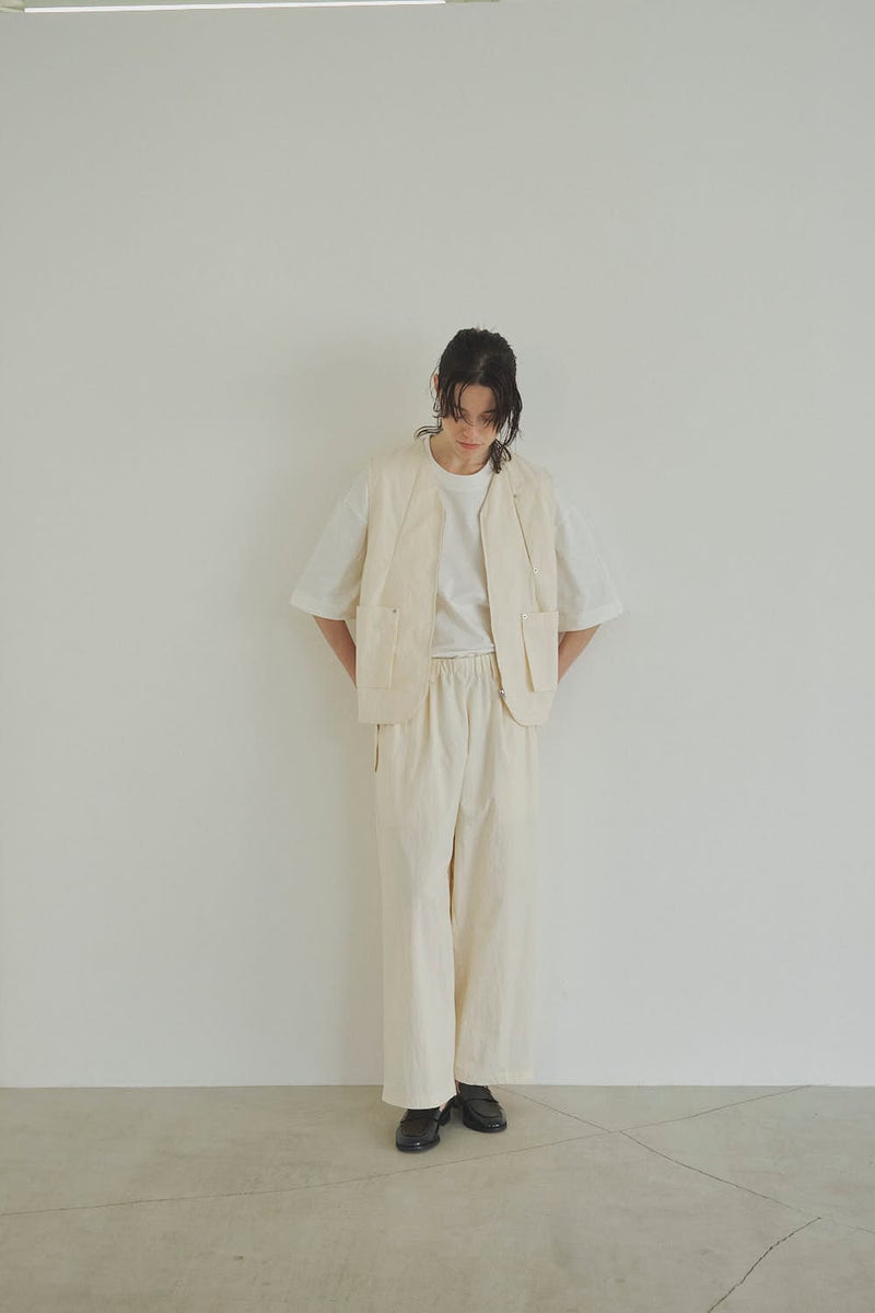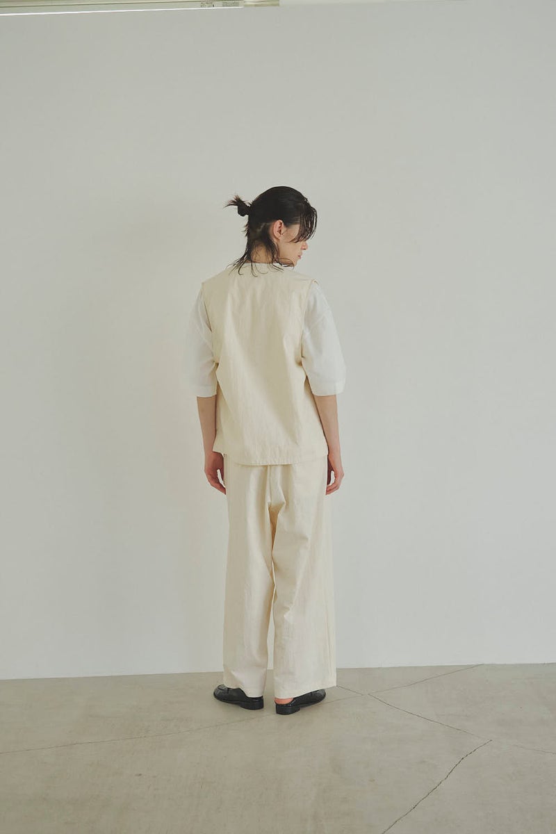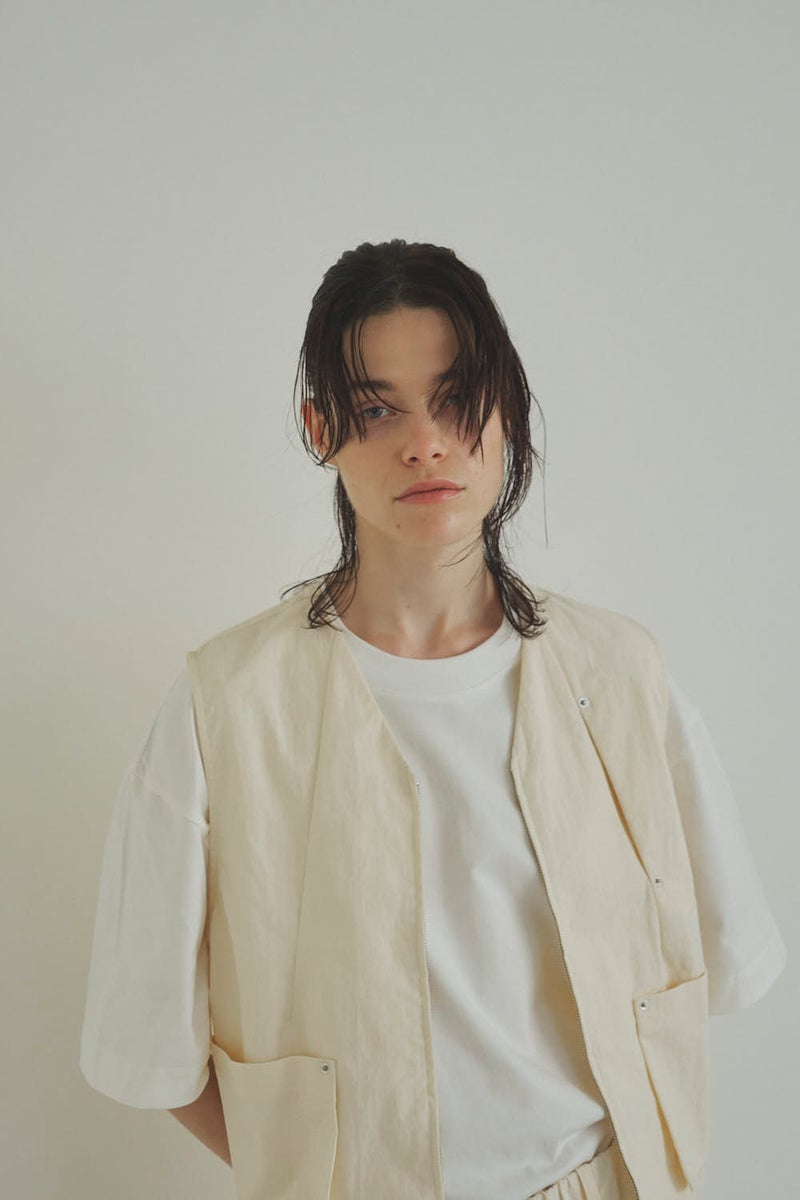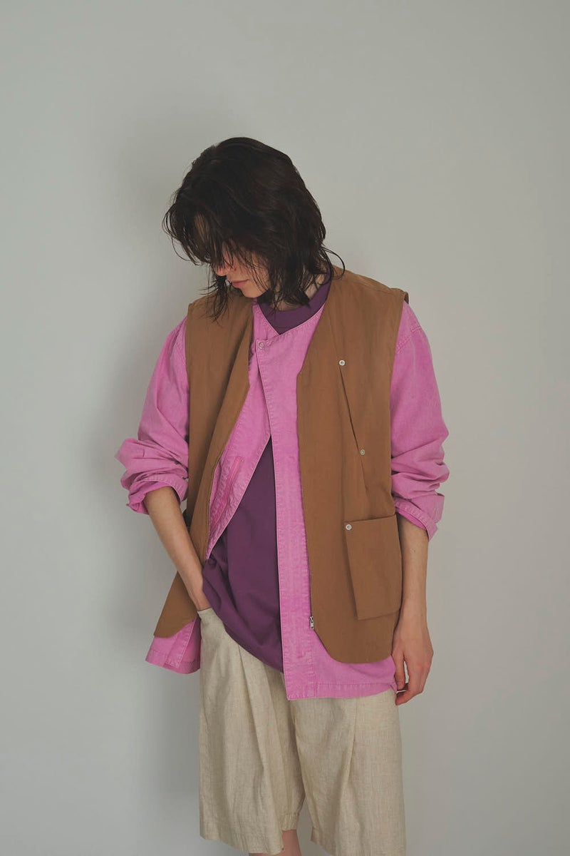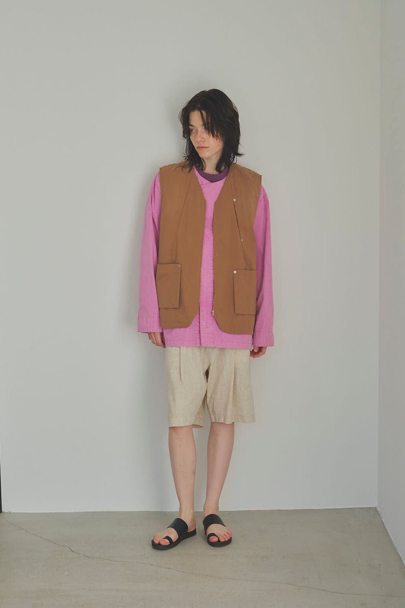 シンプルに見えて高機能。大人のためのワークベスト。 見た目はシンプルなのに、実は機能的ポケットでしっかり収納できるアイテム。 程よいゆとりのあるシルエットで、羽織るだけでこなれた印象に。 素材には、コットンナイロンのウェザー生地を使用。洗いをかけることで白けた風合いを出し、糸に毛羽感を持たせることでほんのり起毛感のある、味わい深い表情に仕上げています。しなやかな肌触りがあり、上品さを感じる質感です。 スーツベストのきちんと感に、ワークやミリタリーのテイストをプラス。胸ポケットや隠しマチポケットなど、機能性を備えたディテールで、大人カジュアルな着こなしに活躍する一着。 ●2サイズ展開 ●オーバーパンツ(26155-9919C)とセットアップ可