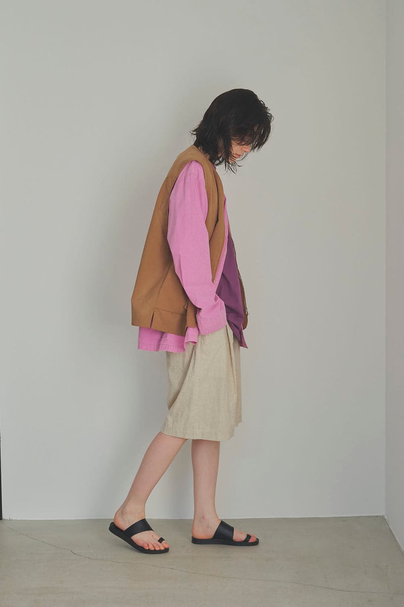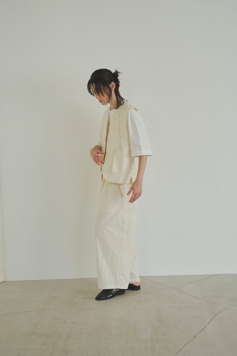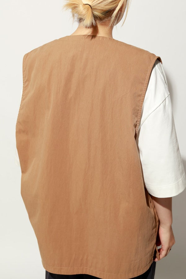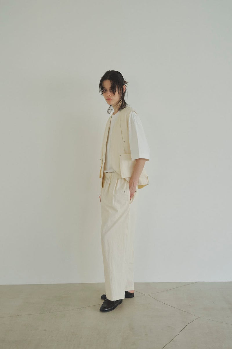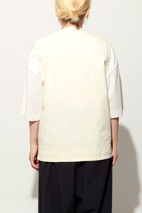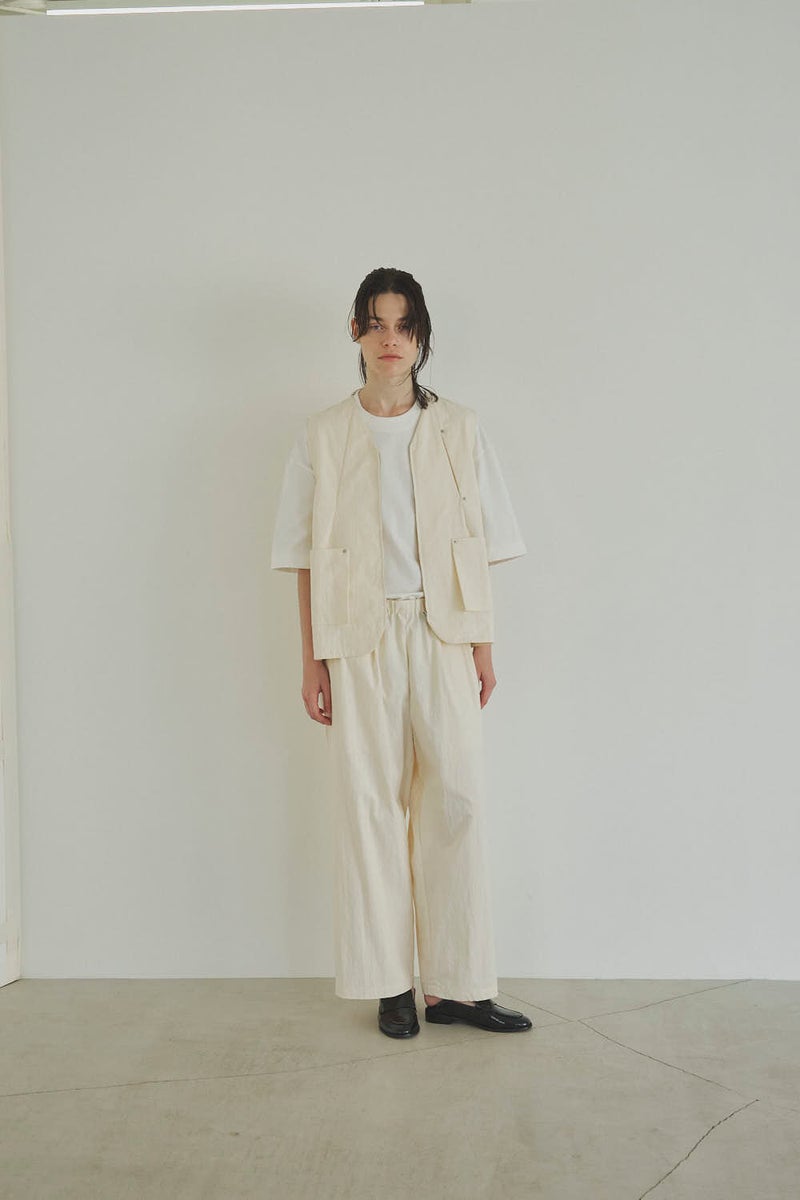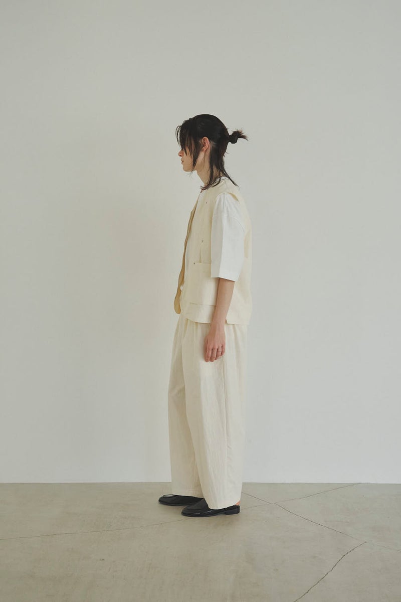 シンプルに見えて高機能。大人のためのワークベスト。 見た目はシンプルなのに、実は機能的ポケットでしっかり収納できるアイテム。 程よいゆとりのあるシルエットで、羽織るだけでこなれた印象に。 素材には、コットンナイロンのウェザー生地を使用。洗いをかけることで白けた風合いを出し、糸に毛羽感を持たせることでほんのり起毛感のある、味わい深い表情に仕上げています。しなやかな肌触りがあり、上品さを感じる質感です。 スーツベストのきちんと感に、ワークやミリタリーのテイストをプラス。胸ポケットや隠しマチポケットなど、機能性を備えたディテールで、大人カジュアルな着こなしに活躍する一着。 ●2サイズ展開 ●オーバーパンツ(26155-9919C)とセットアップ可