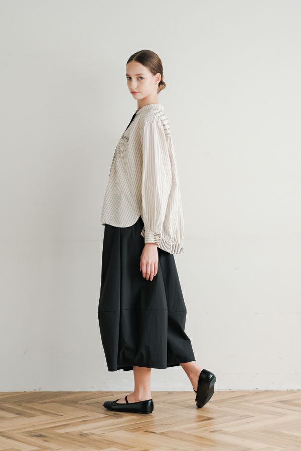 洗練と遊び心を纏う、ストライプシャツ。 4種類のストライプを巧みに切り替えた、存在感のあるデザインシャツ。コットンならではのナチュラルな風合いと、程よいハリ感が生み出す立体的なシルエットが魅力です。 シャツ以上ジャケット未満の絶妙なバランスで、羽織るだけで洗練された印象に。 太めのサテン無地の前立てが全体を引き締め、スタイリングにメリハリをプラス。 後ろ裾はヨーク下にたっぷりとギャザーを入れ、ヒップを自然にカバーしながら動きのあるラインを描きます。どの角度から見ても美しく、唯一無二の存在感を放つ一枚です。