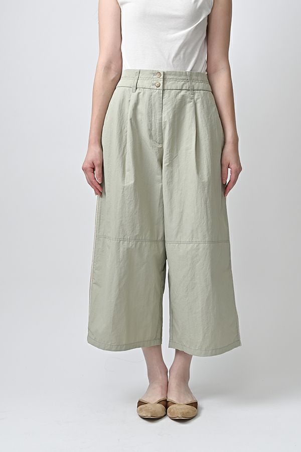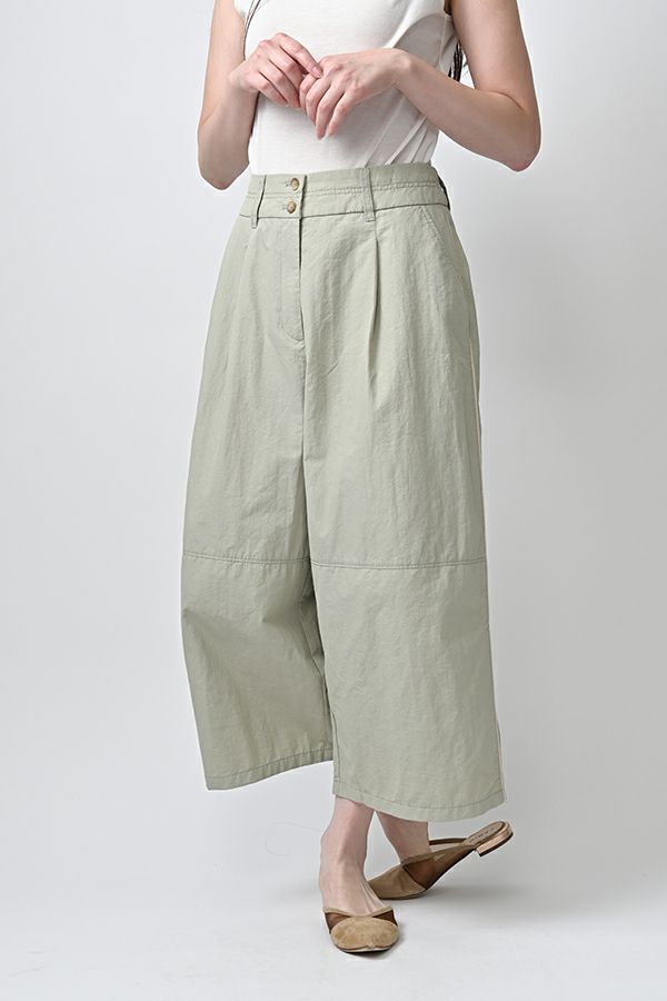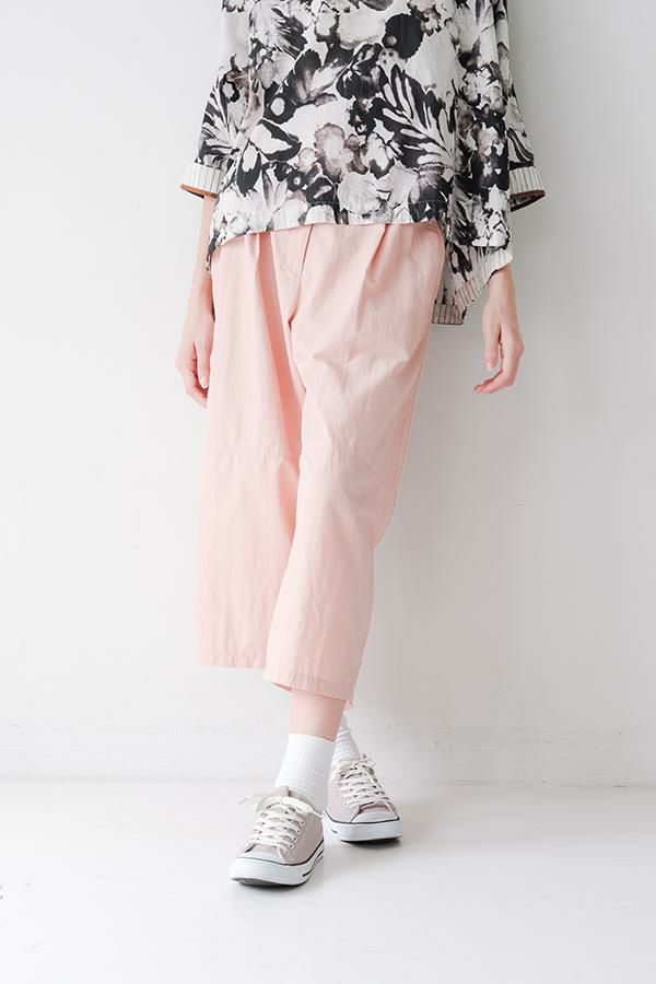 ハリと丸みが描く、ストレスフリーな美シルエットコクーンパンツ。 サラッとした細番手コットンに麻糸と光沢のあるナイロンを織り交ぜた素材。 ほどよいハリとふくらみがあり、シワになりにくく、美しい落ち感が魅力です。 akaneらしい丸みのあるカーブシルエットのコクーンパンツは、前身頃中央に接ぎを入れることで立体的なフォルムを表現。前開きの太めウエストベルトにはダブルステッチのアクセントを施し、後ろウエストはゴム仕様で体にフィットしながら快適な動きやすさを実現しました。 深めのフロントタックが腰周りに立体感を生み、太ももまでゆったりとしたストレスフリーな着心地。ショート丈やクロップド丈のカットソー、シャツなどのトップスとの相性もよく、足元はソックス+スニーカーでアクティブに楽しめます。