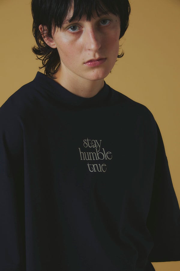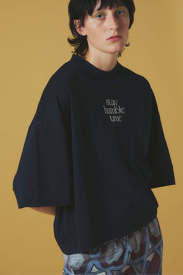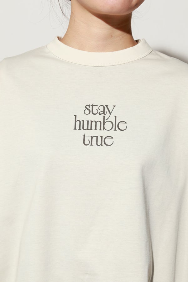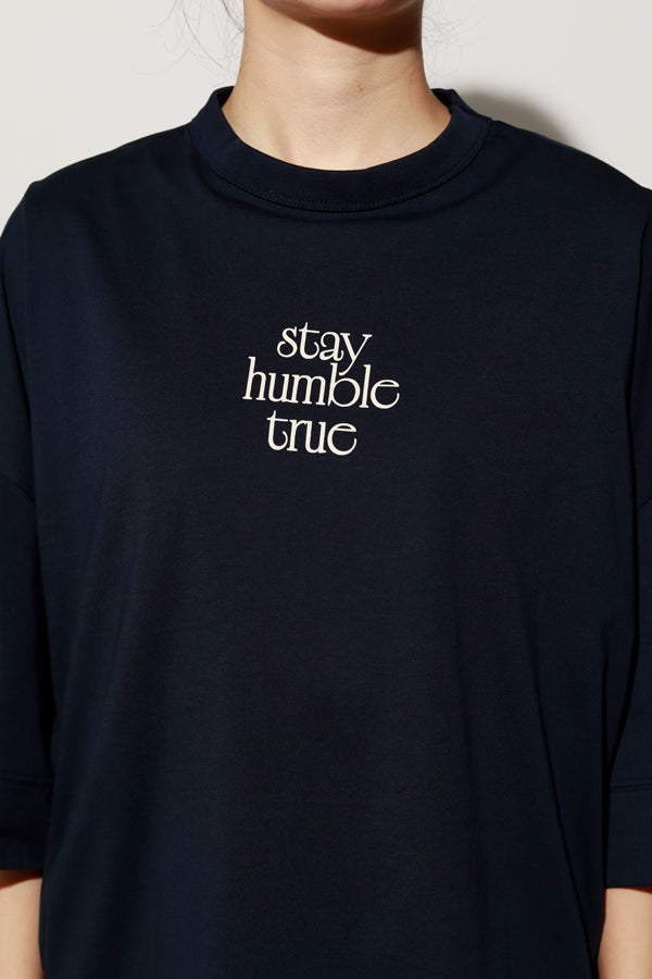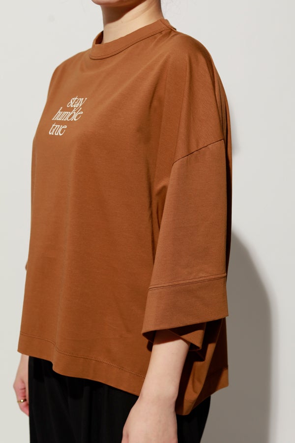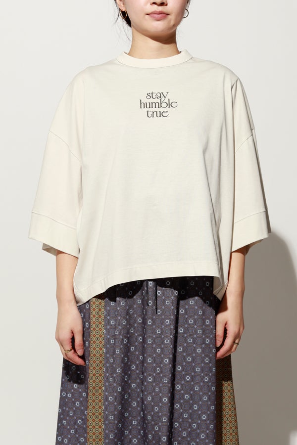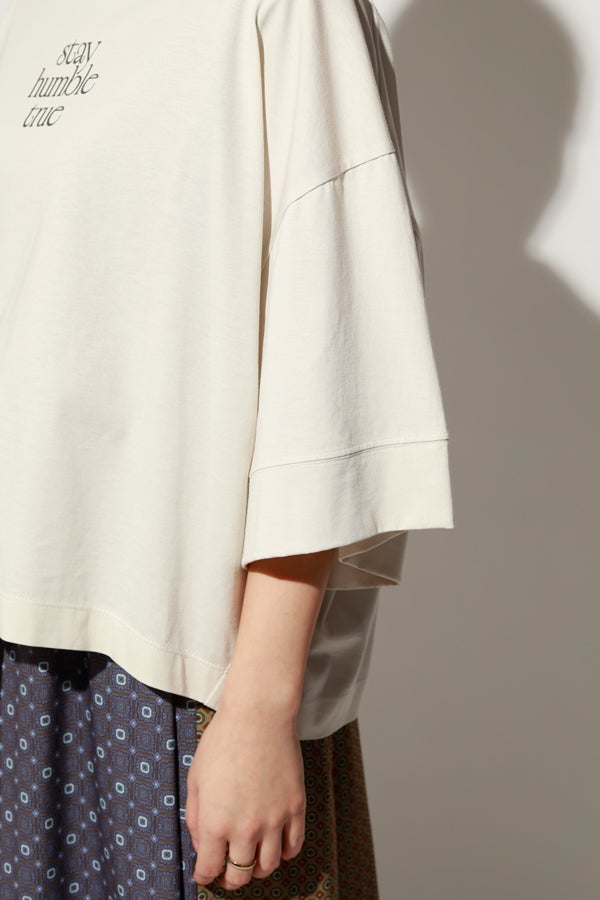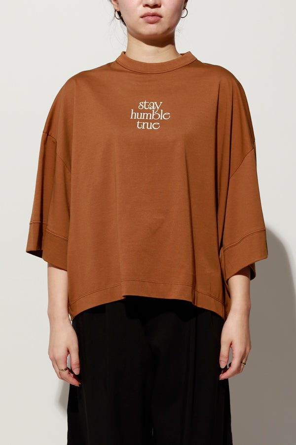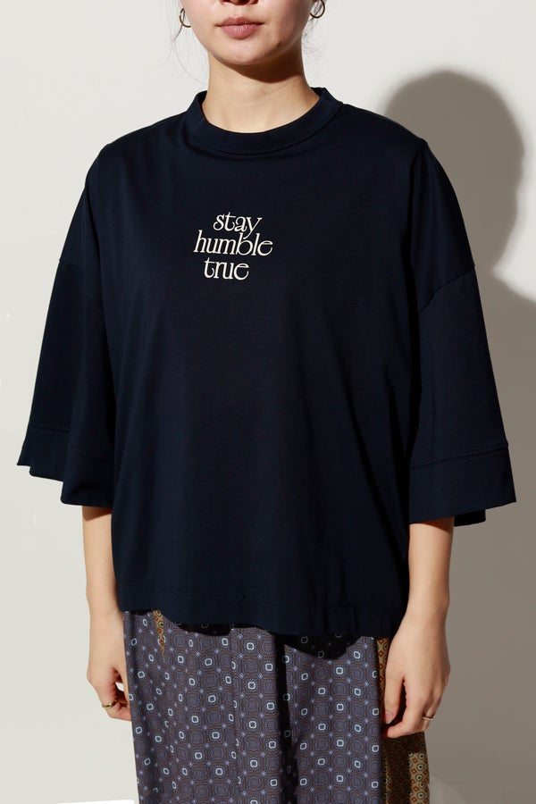 前向きな余韻をまとう、メッセージロゴプルオーバー。 毛羽の少ない強撚糸を使用したサイロコンパクトHG天竺は、さらりとした肌触りと清涼感のある表情が魅力。目の詰まった生地が透け感を抑え、上質な佇まいを叶えます。 どんなボトムともバランスが取りやすい着丈に、五分袖がさり気なく二の腕をカバー。ワイドパンツやフレアスカートと合わせると、クリーンで端正なシルエットが完成します。カジュアルなロゴも上品素材で大人見えするので、ゴールドアクセやレザー小物を添えるだけで洗練されたスタイルに仕上がる一枚です。 「Stay humble true」→ 謙虚に、そして自分らしくの意。 ●日本製