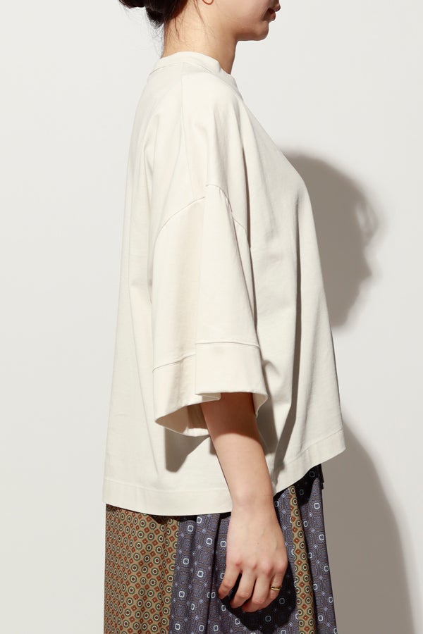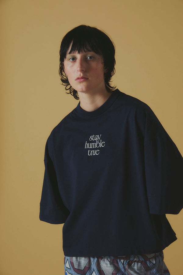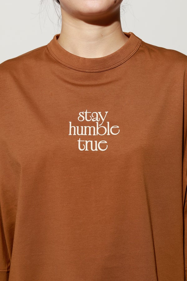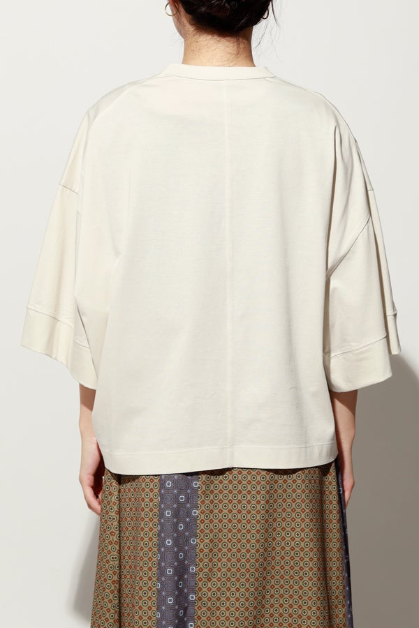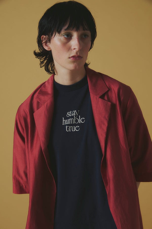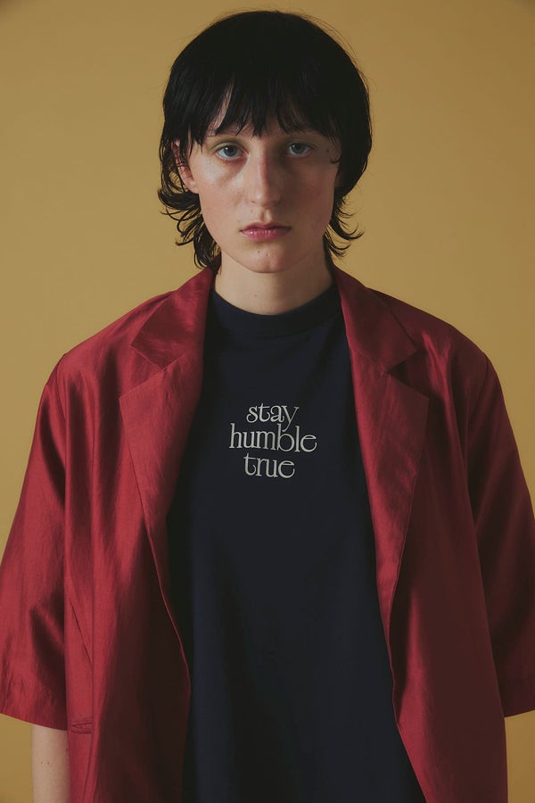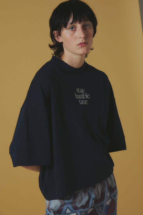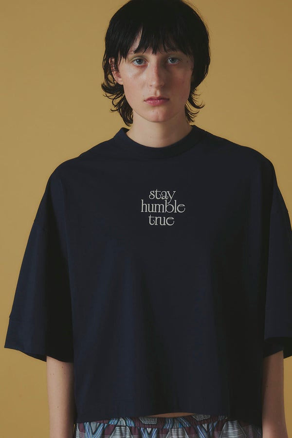 前向きな余韻をまとう、メッセージロゴプルオーバー。 毛羽の少ない強撚糸を使用したサイロコンパクトHG天竺は、さらりとした肌触りと清涼感のある表情が魅力。目の詰まった生地が透け感を抑え、上質な佇まいを叶えます。 どんなボトムともバランスが取りやすい着丈に、五分袖がさり気なく二の腕をカバー。ワイドパンツやフレアスカートと合わせると、クリーンで端正なシルエットが完成します。カジュアルなロゴも上品素材で大人見えするので、ゴールドアクセやレザー小物を添えるだけで洗練されたスタイルに仕上がる一枚です。 「Stay humble true」→ 謙虚に、そして自分らしくの意。 ●日本製
