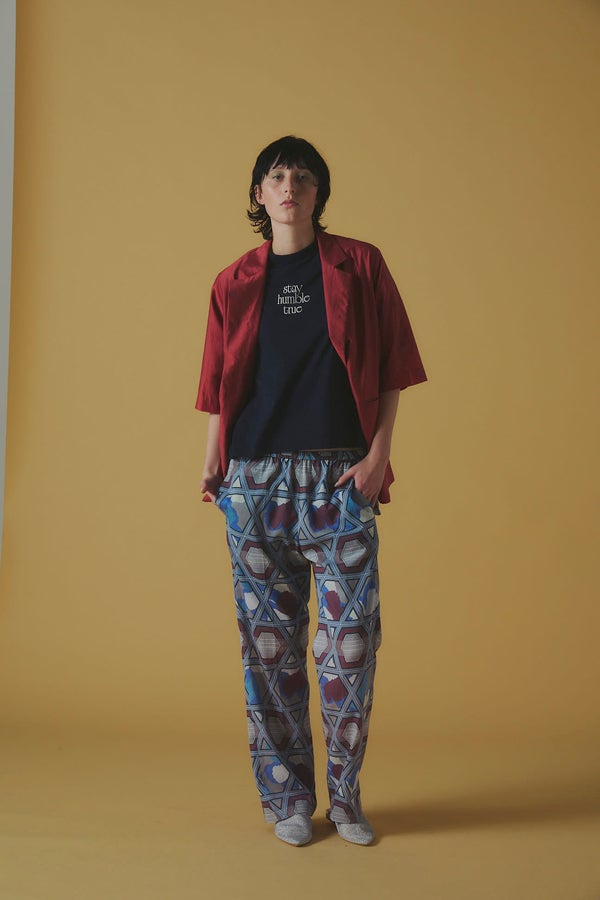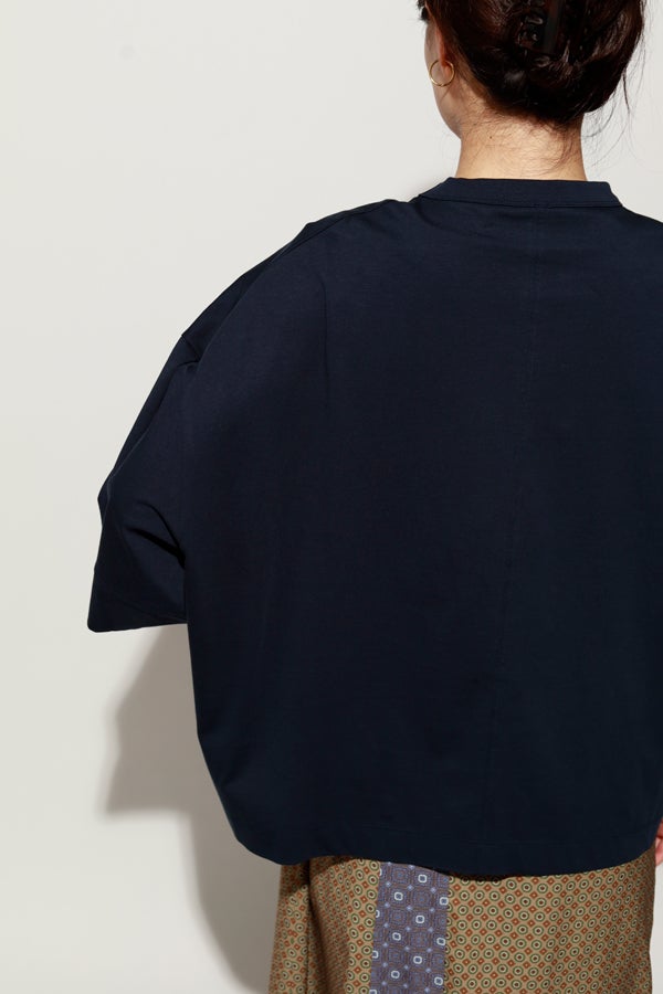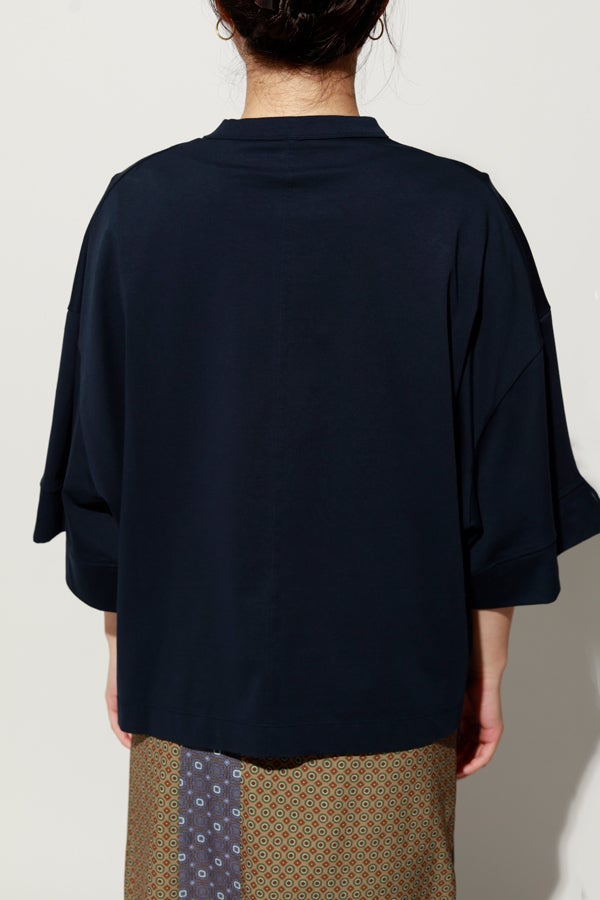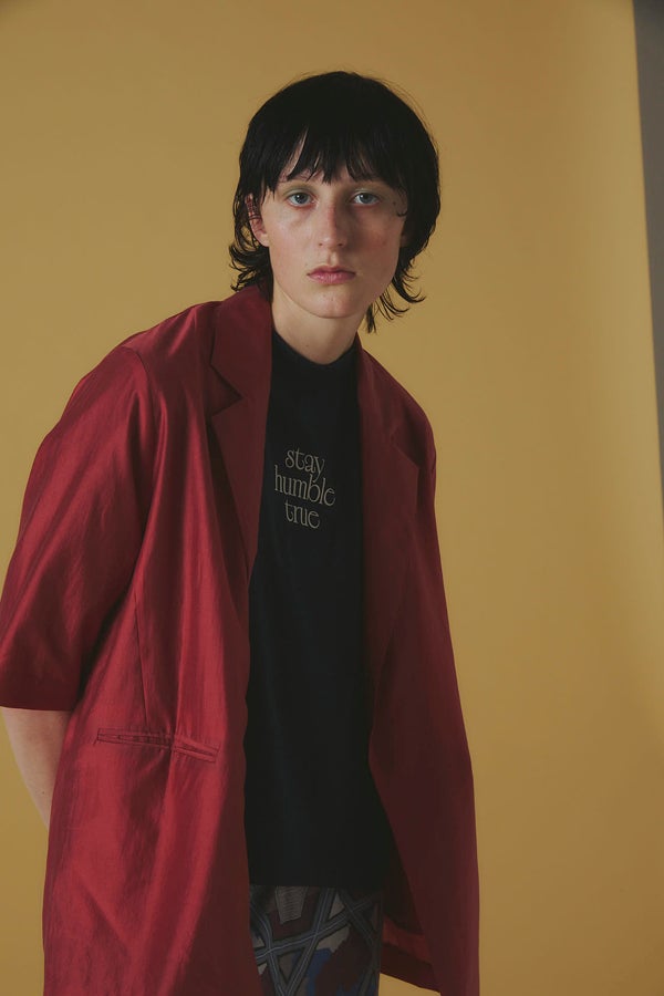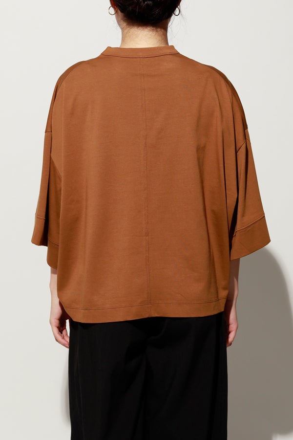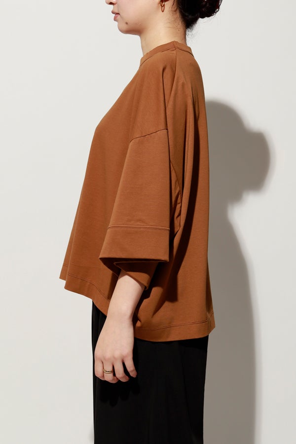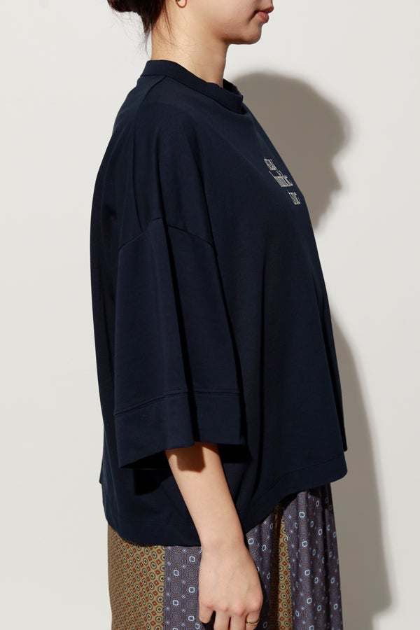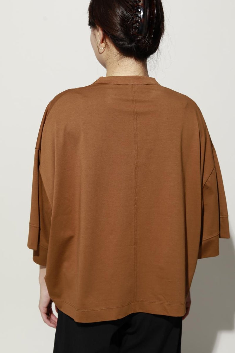前向きな余韻をまとう、メッセージロゴプルオーバー。 毛羽の少ない強撚糸を使用したサイロコンパクトHG天竺は、さらりとした肌触りと清涼感のある表情が魅力。目の詰まった生地が透け感を抑え、上質な佇まいを叶えます。 どんなボトムともバランスが取りやすい着丈に、五分袖がさり気なく二の腕をカバー。ワイドパンツやフレアスカートと合わせると、クリーンで端正なシルエットが完成します。カジュアルなロゴも上品素材で大人見えするので、ゴールドアクセやレザー小物を添えるだけで洗練されたスタイルに仕上がる一枚です。 「Stay humble true」→ 謙虚に、そして自分らしくの意。 ●日本製