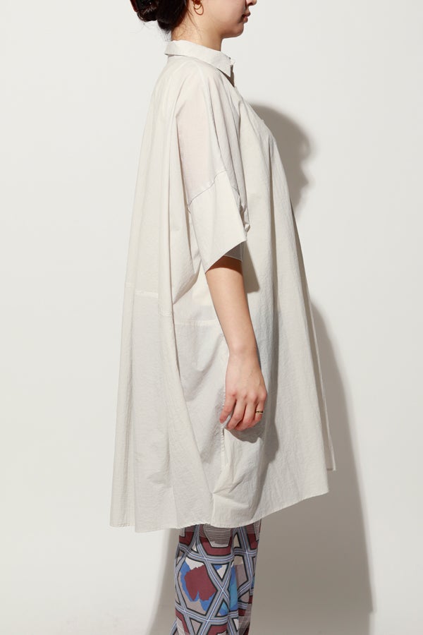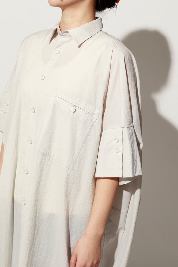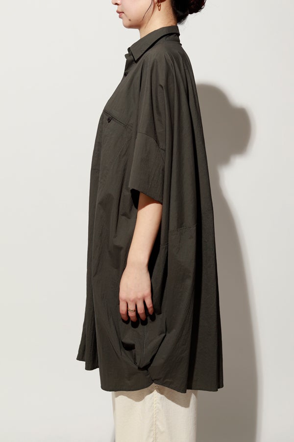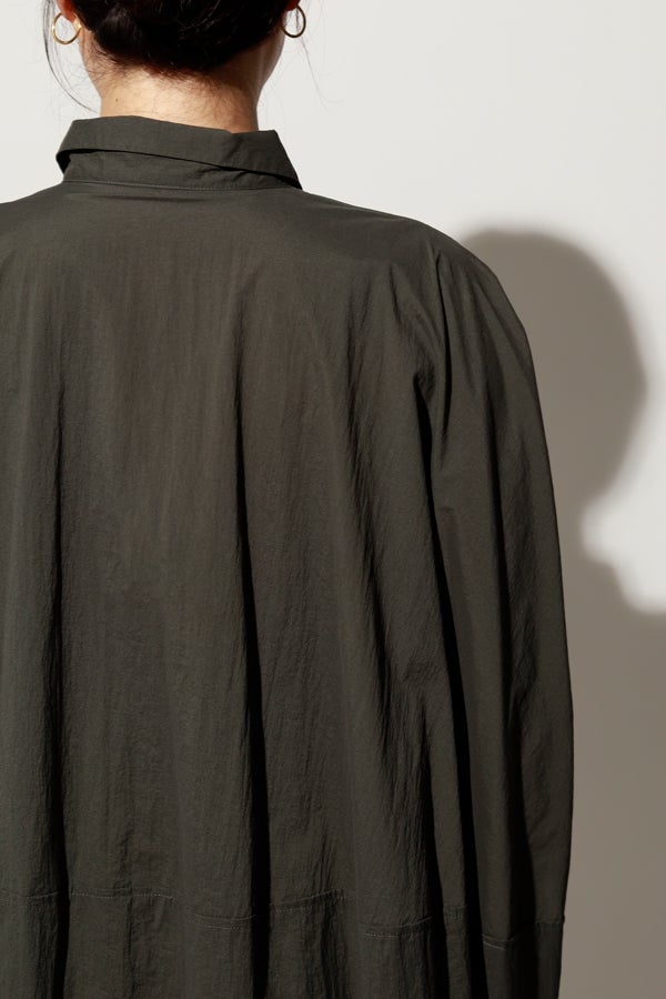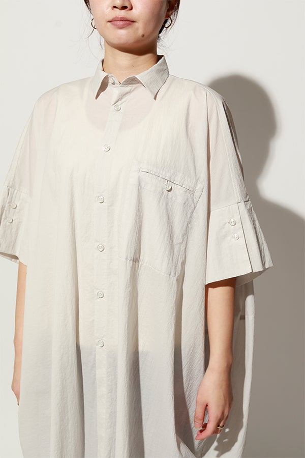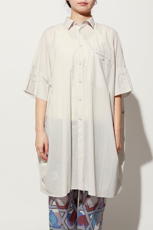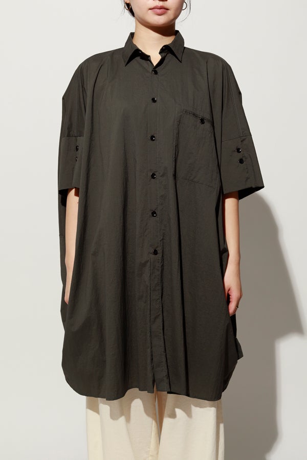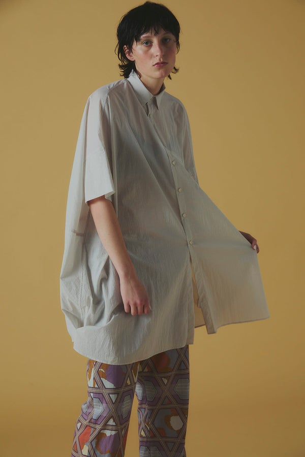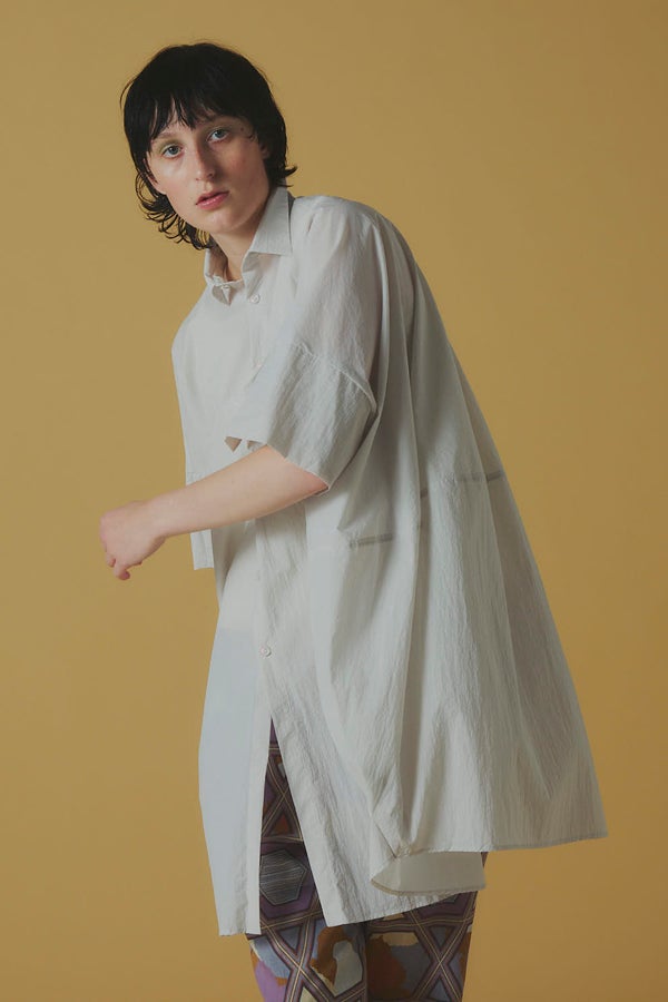 空気を纏う軽さが決め手、オーバーサイズチュニックシャツ。 綿ナイロンの軽やかな素材を使用したアイテム。空気を含んだようなふんわりとした軽さで、肌離れも良く快適な着心地です。体のラインを拾わない立体的なフォルムが、こだわりのパターンによって美しいシルエットをを実現。 体型をさりげなくカバーしつつ、洗練された抜け感をつくる大人の一枚です。 インナーを活かし細身のパンツで軽快に。風通しの良いワイドパンツでリラックス感をプラスしたりスタイリングの幅も自在。前開きで羽織れば、体型カバーとこなれ感を両立した都会的なレイヤードが完成します。
