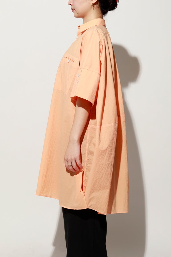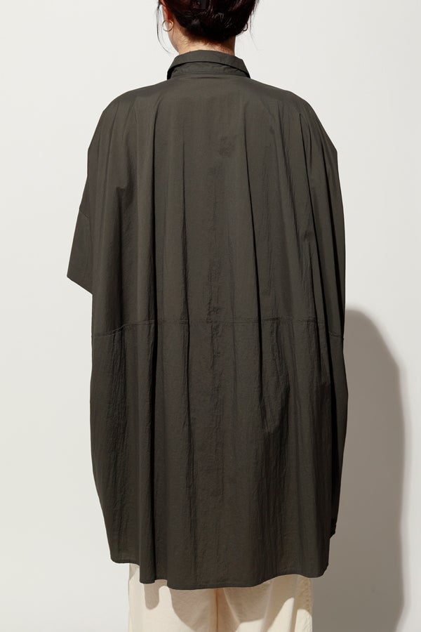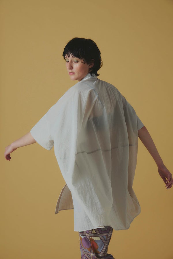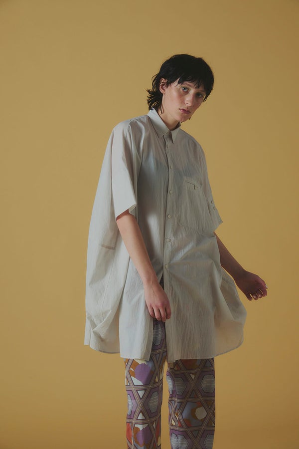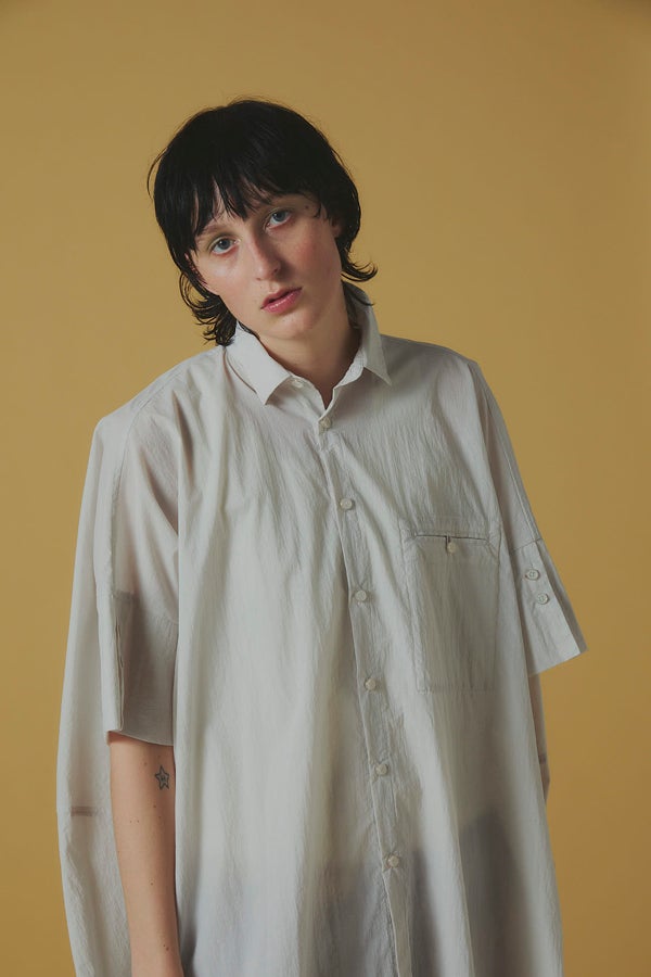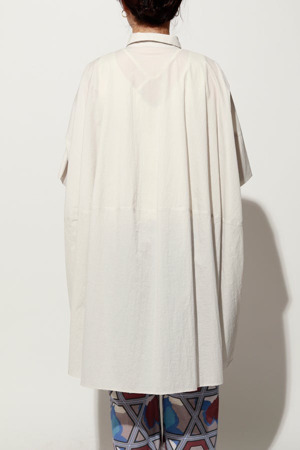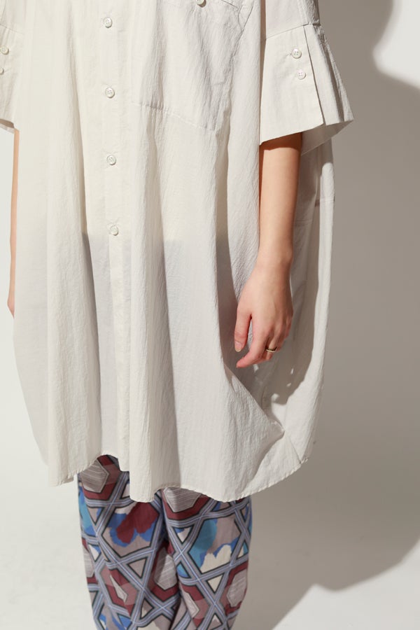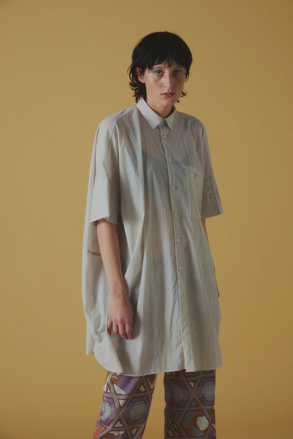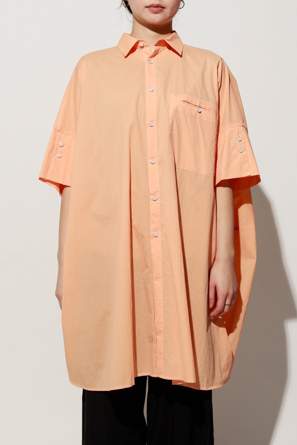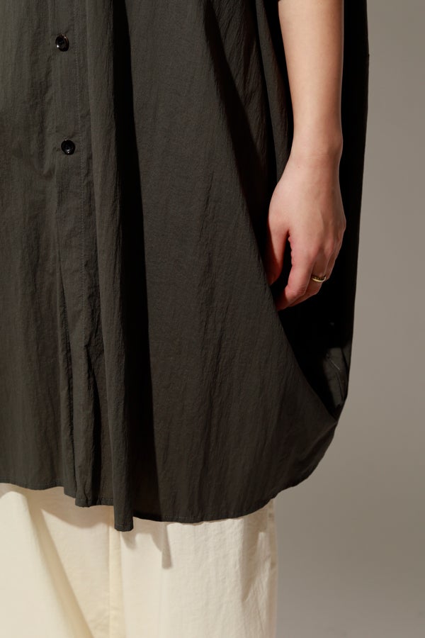 空気を纏う軽さが決め手、オーバーサイズチュニックシャツ。 綿ナイロンの軽やかな素材を使用したアイテム。空気を含んだようなふんわりとした軽さで、肌離れも良く快適な着心地です。体のラインを拾わない立体的なフォルムが、こだわりのパターンによって美しいシルエットをを実現。 体型をさりげなくカバーしつつ、洗練された抜け感をつくる大人の一枚です。 インナーを活かし細身のパンツで軽快に。風通しの良いワイドパンツでリラックス感をプラスしたりスタイリングの幅も自在。前開きで羽織れば、体型カバーとこなれ感を両立した都会的なレイヤードが完成します。