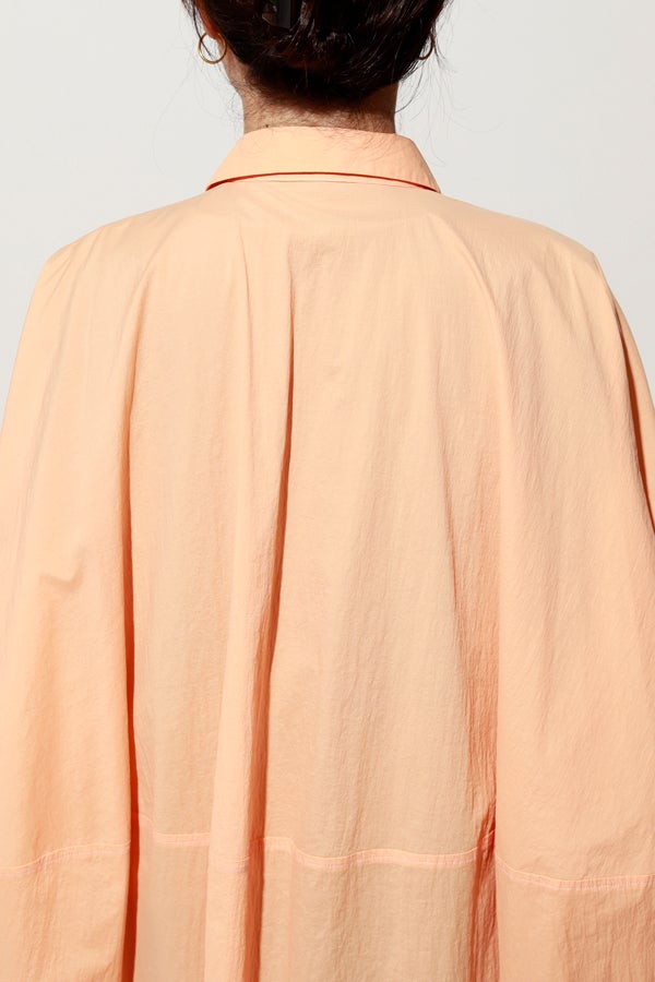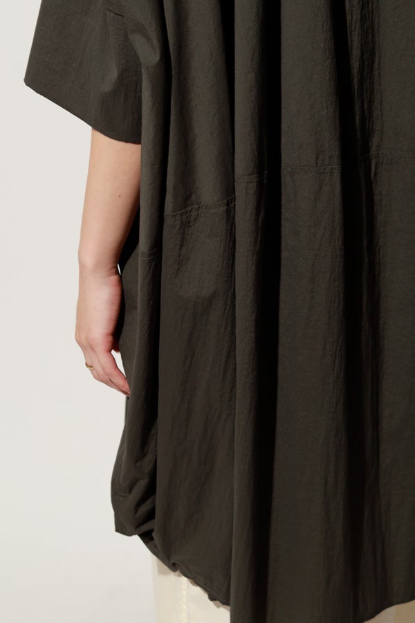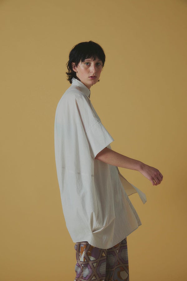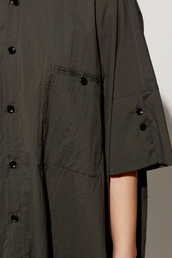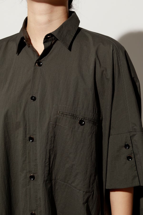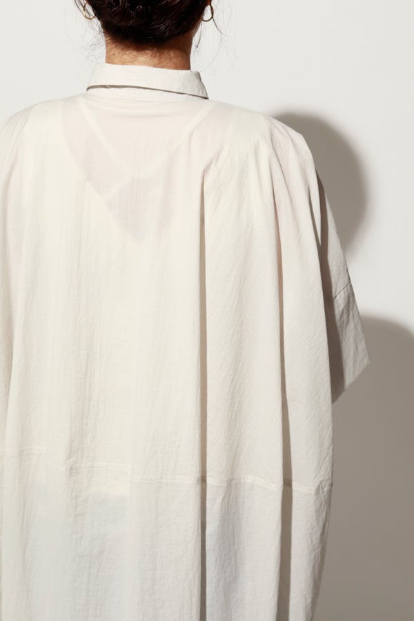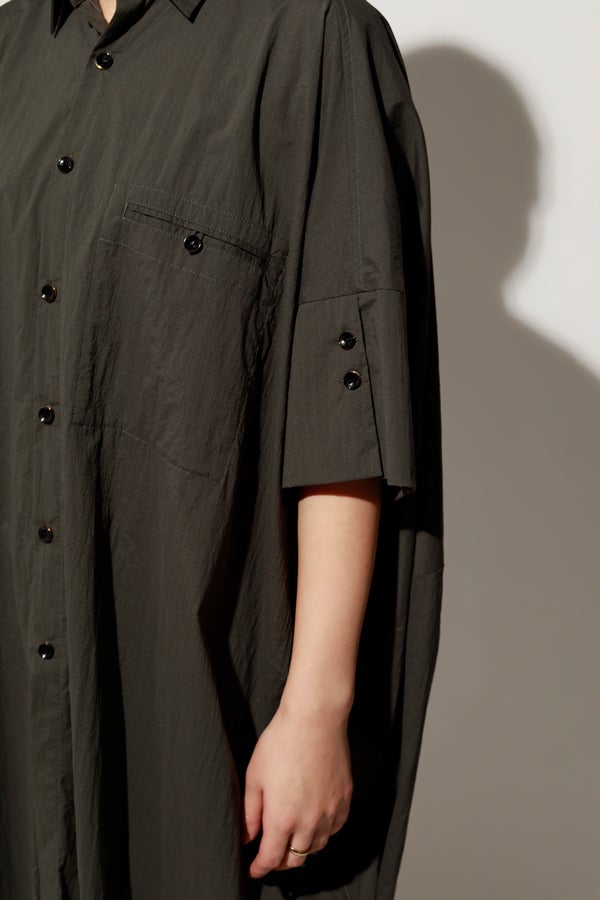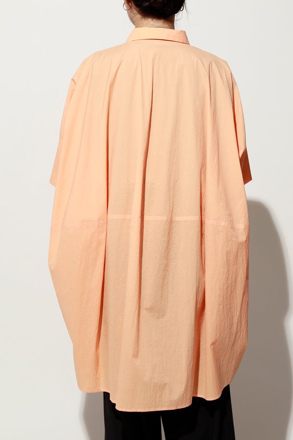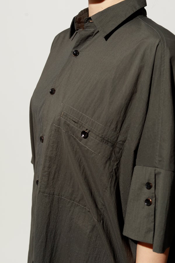 空気を纏う軽さが決め手、オーバーサイズチュニックシャツ。 綿ナイロンの軽やかな素材を使用したアイテム。空気を含んだようなふんわりとした軽さで、肌離れも良く快適な着心地です。体のラインを拾わない立体的なフォルムが、こだわりのパターンによって美しいシルエットをを実現。 体型をさりげなくカバーしつつ、洗練された抜け感をつくる大人の一枚です。 インナーを活かし細身のパンツで軽快に。風通しの良いワイドパンツでリラックス感をプラスしたりスタイリングの幅も自在。前開きで羽織れば、体型カバーとこなれ感を両立した都会的なレイヤードが完成します。