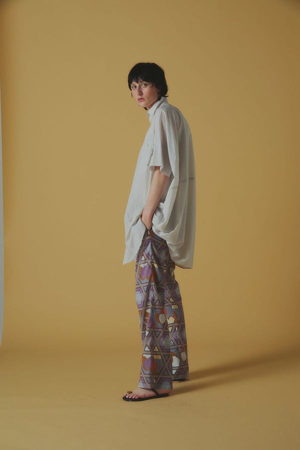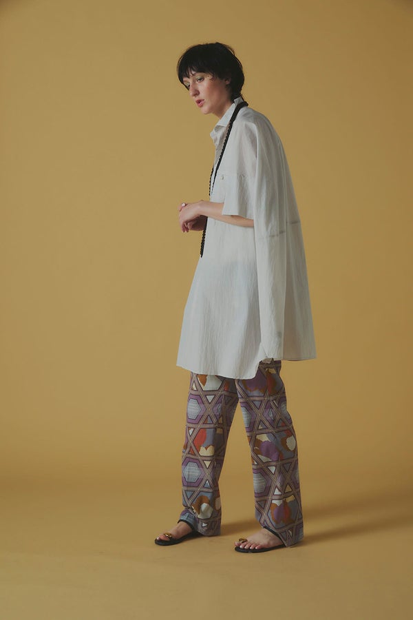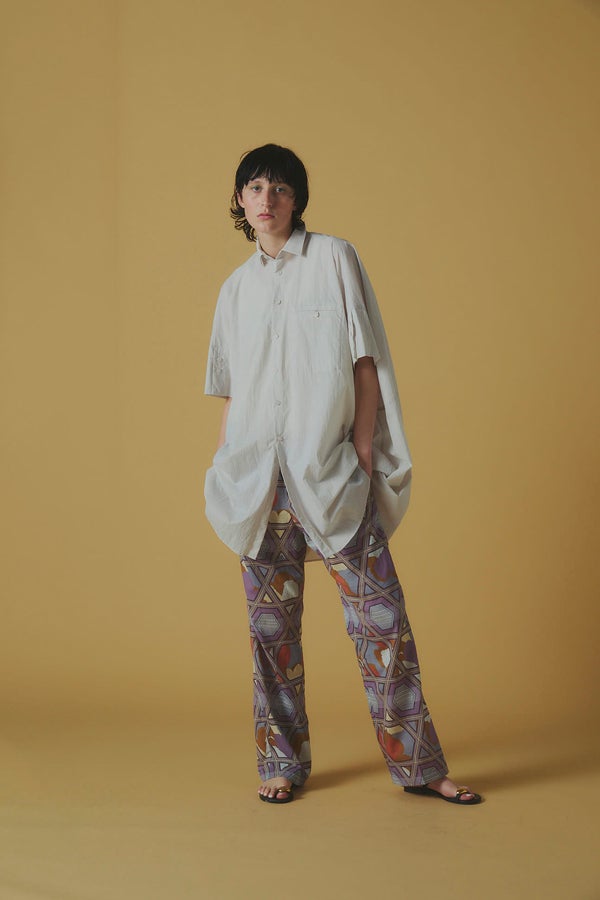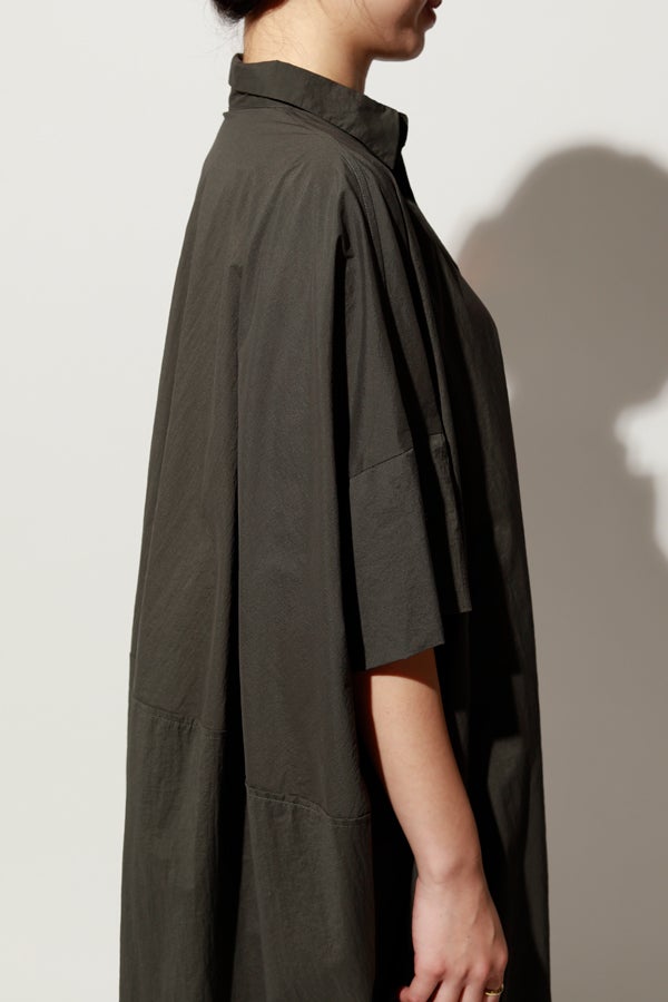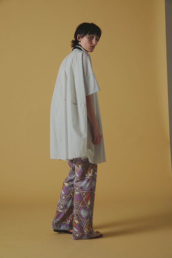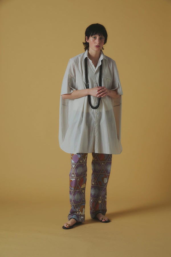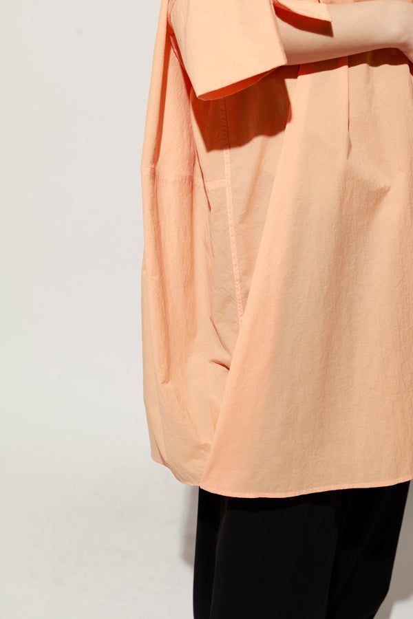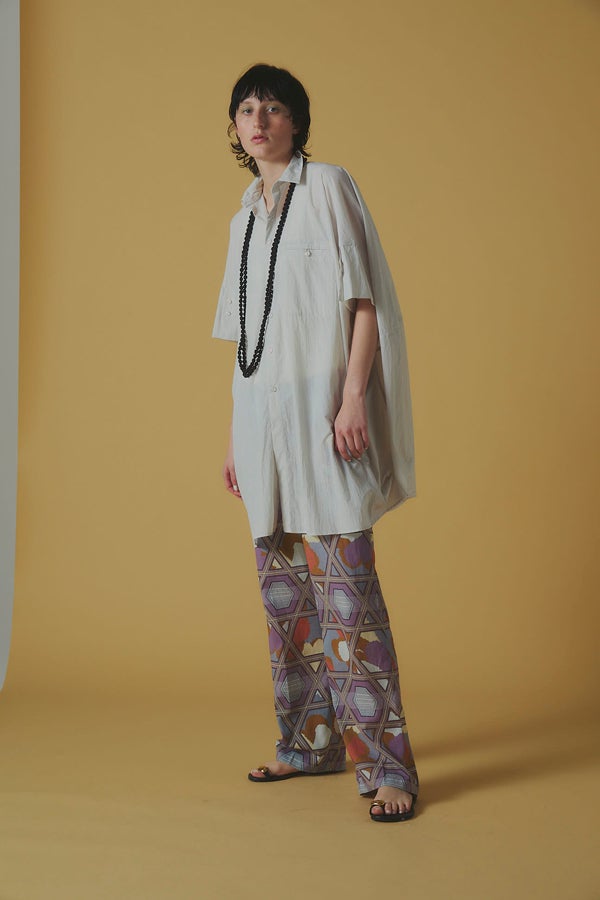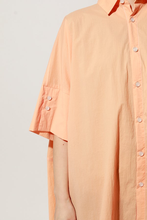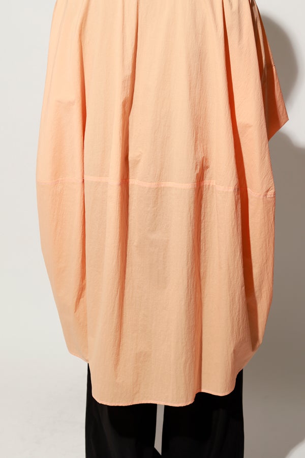 空気を纏う軽さが決め手、オーバーサイズチュニックシャツ。 綿ナイロンの軽やかな素材を使用したアイテム。空気を含んだようなふんわりとした軽さで、肌離れも良く快適な着心地です。体のラインを拾わない立体的なフォルムが、こだわりのパターンによって美しいシルエットをを実現。 体型をさりげなくカバーしつつ、洗練された抜け感をつくる大人の一枚です。 インナーを活かし細身のパンツで軽快に。風通しの良いワイドパンツでリラックス感をプラスしたりスタイリングの幅も自在。前開きで羽織れば、体型カバーとこなれ感を両立した都会的なレイヤードが完成します。
