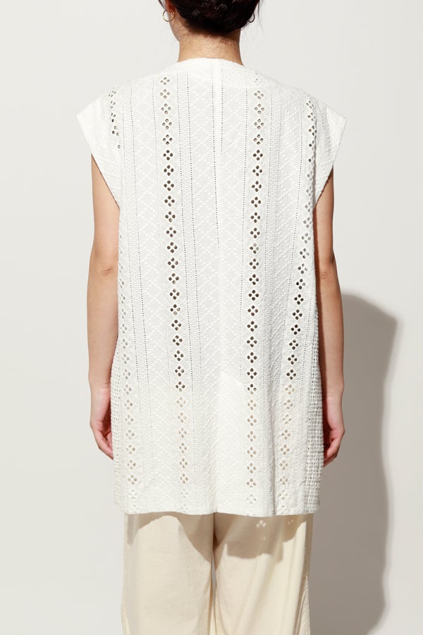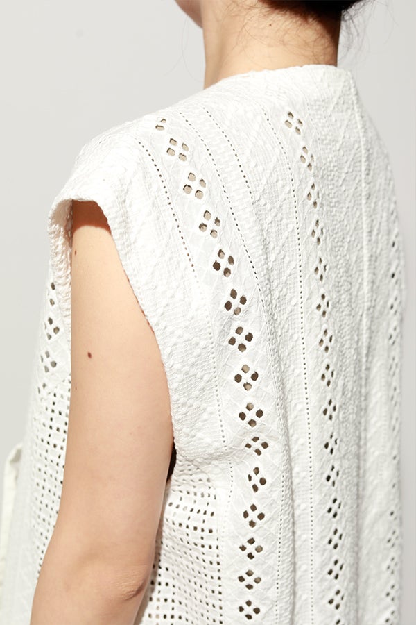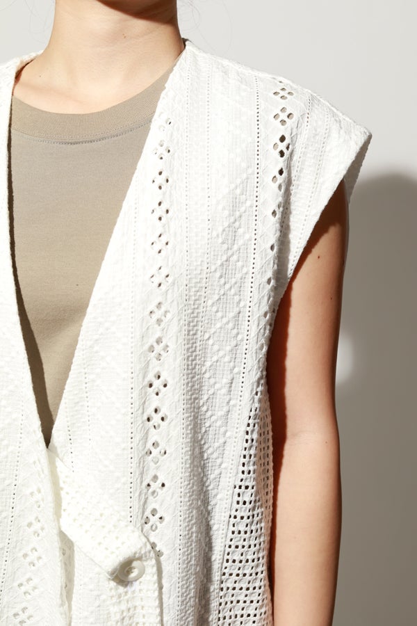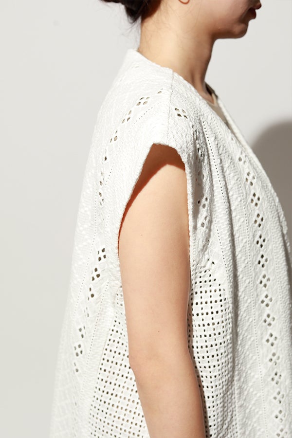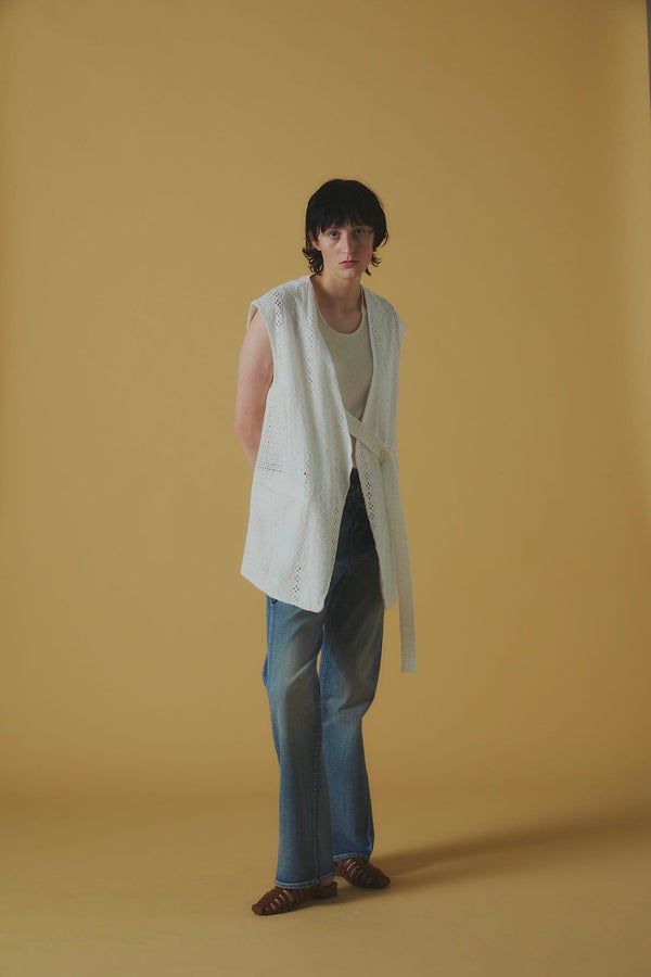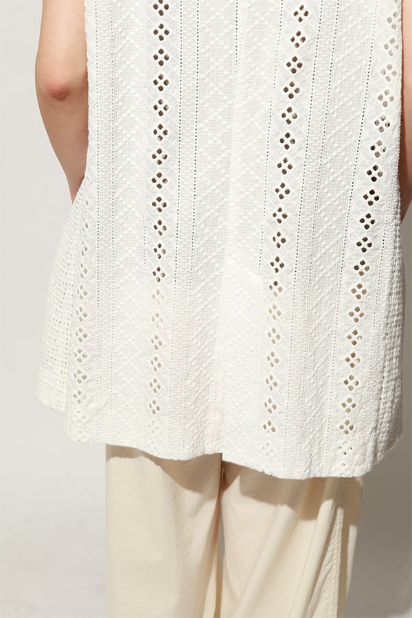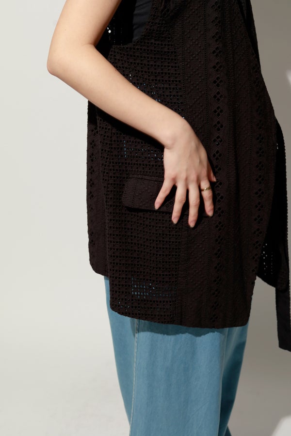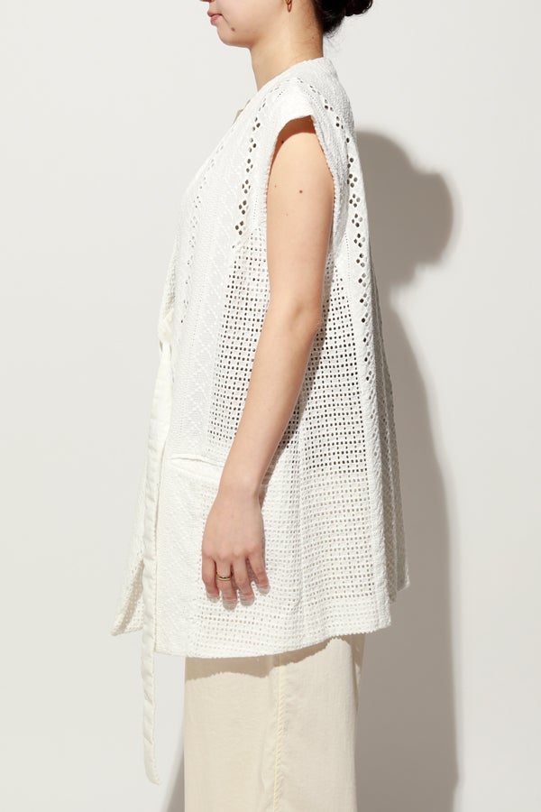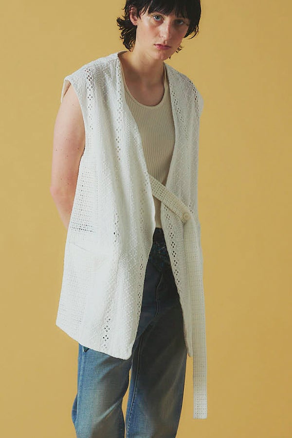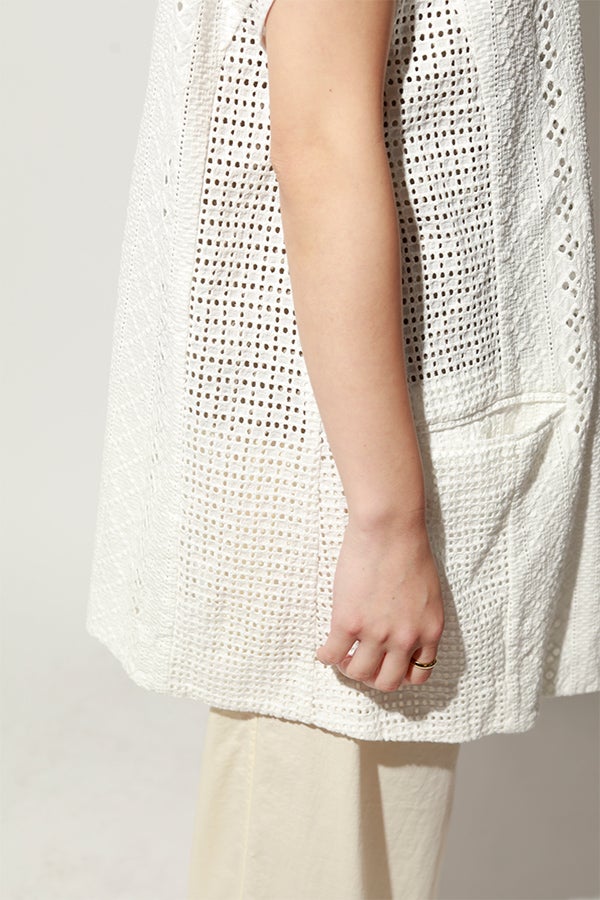 2種類の綿レースを組み合わせ、切り替えで立体的な表情を生み出したアイテム。 上品な透け感が夏らしい軽さを引き寄せながら、ノースリーブのすっきりとしたラインがきちんと感も両立。夏の通勤やお出かけシーンにぴったり。羽織るだけでシルエットが整う主役アイテムです。
