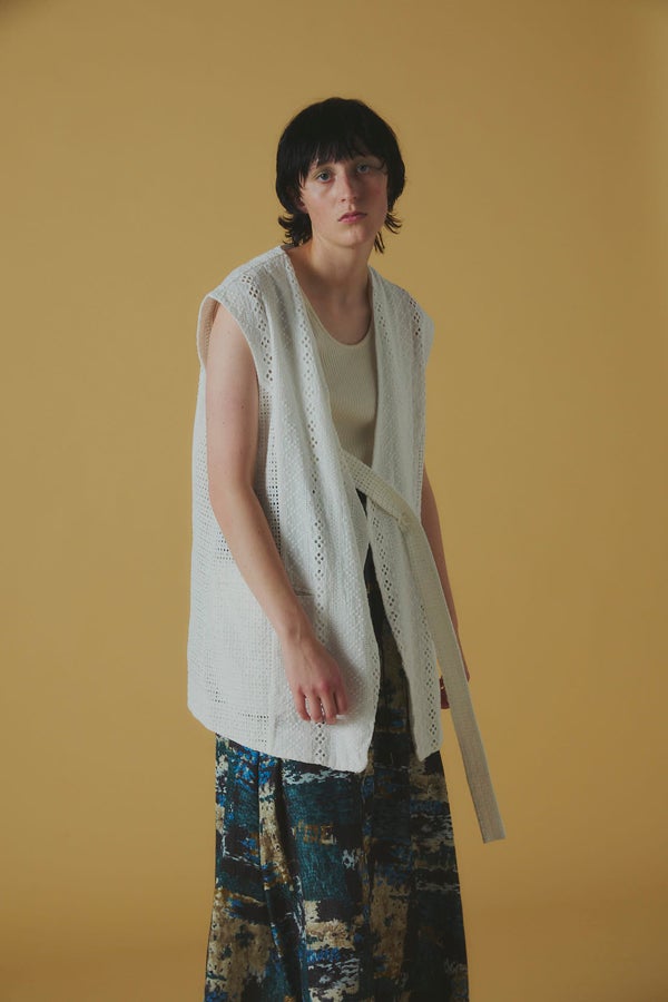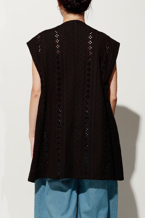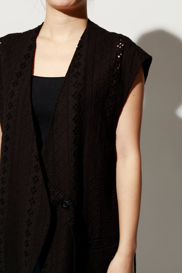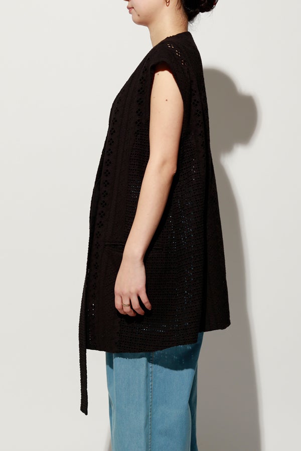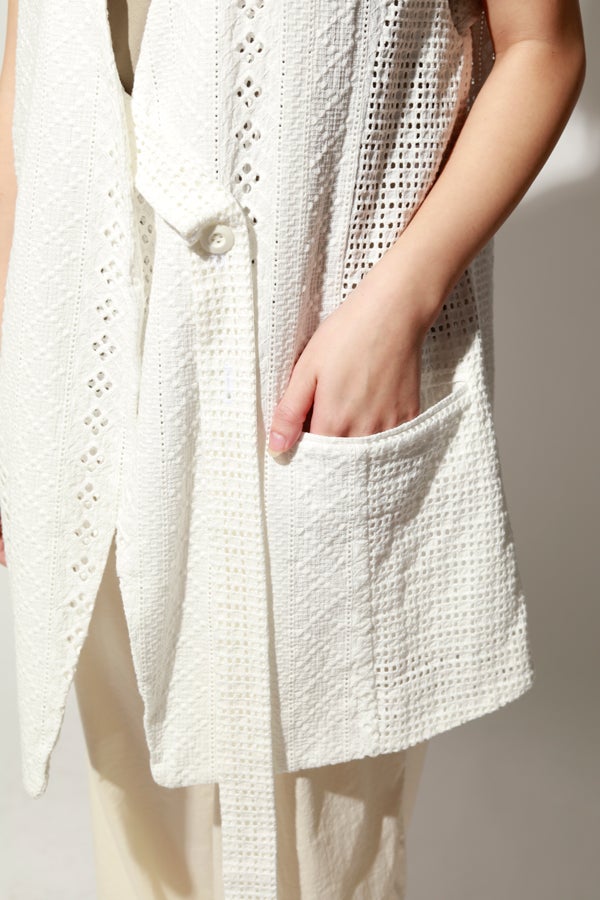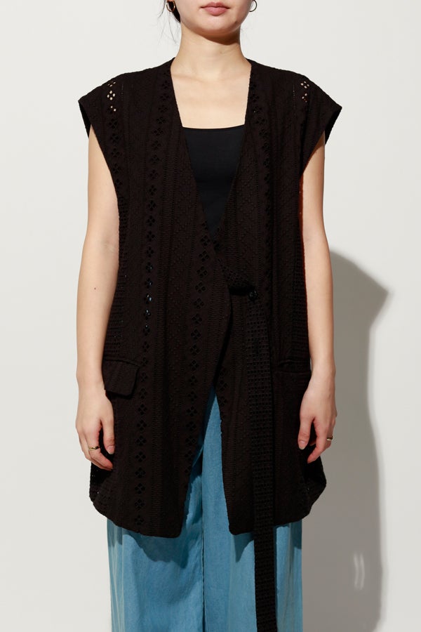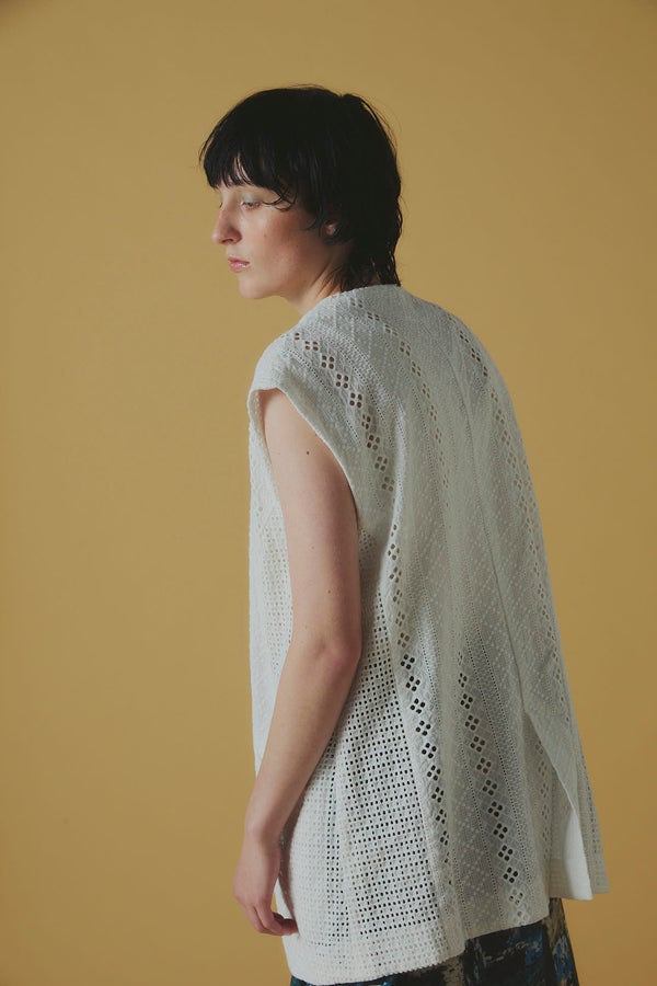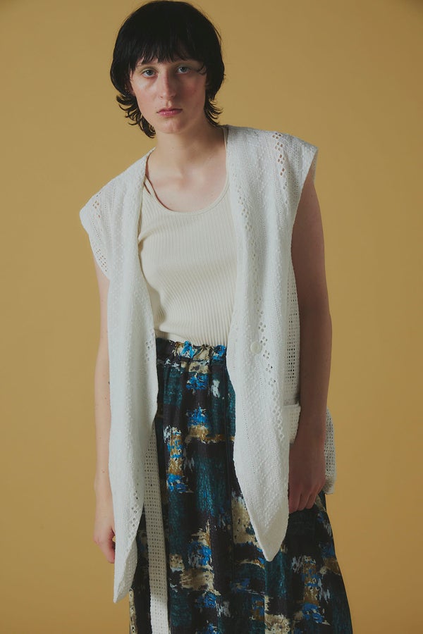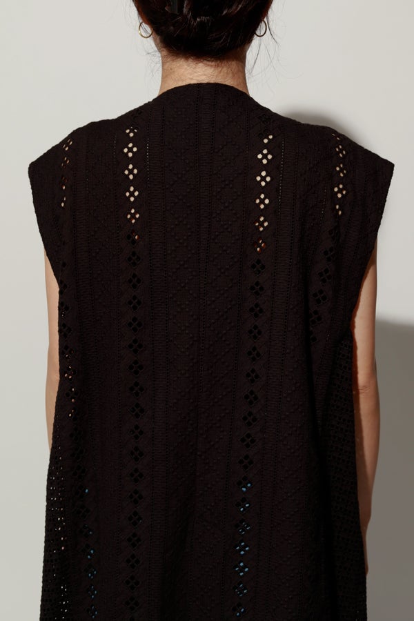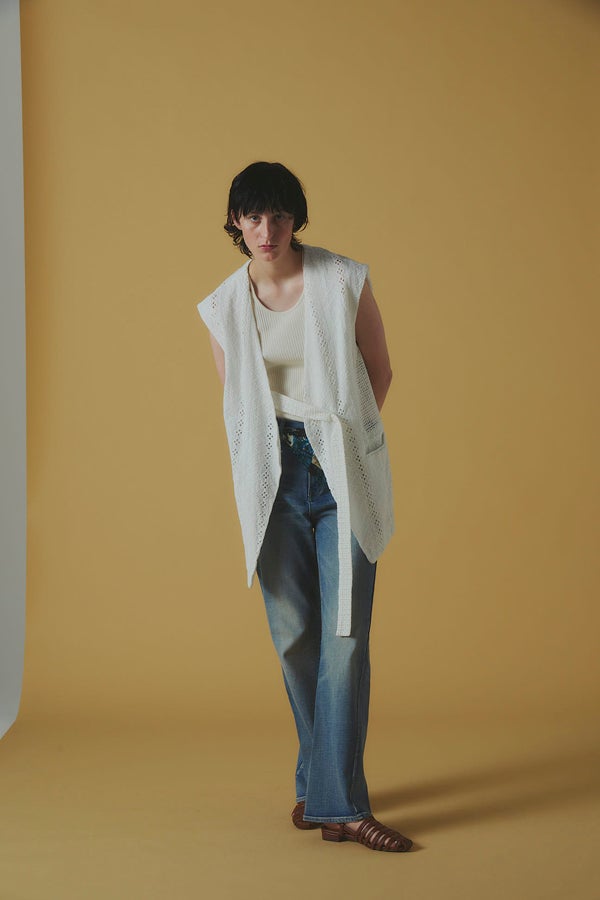 2種類の綿レースを組み合わせ、切り替えで立体的な表情を生み出したアイテム。 上品な透け感が夏らしい軽さを引き寄せながら、ノースリーブのすっきりとしたラインがきちんと感も両立。夏の通勤やお出かけシーンにぴったり。羽織るだけでシルエットが整う主役アイテムです。