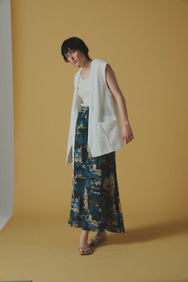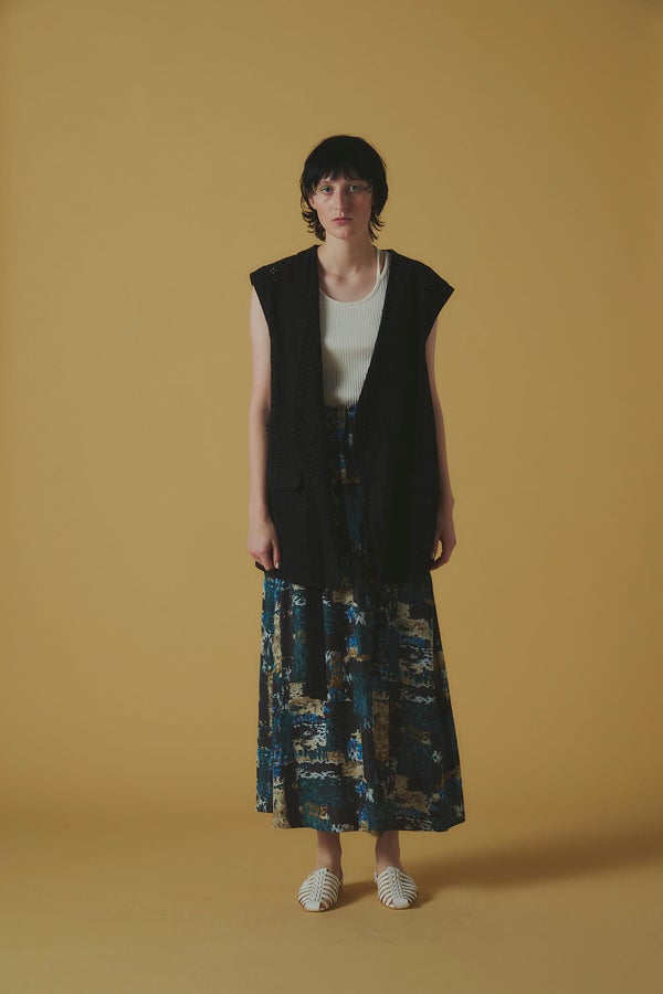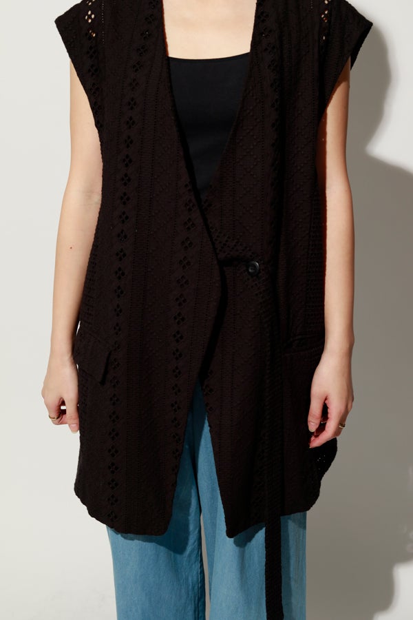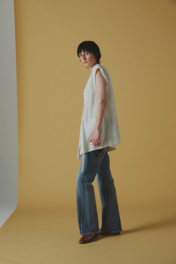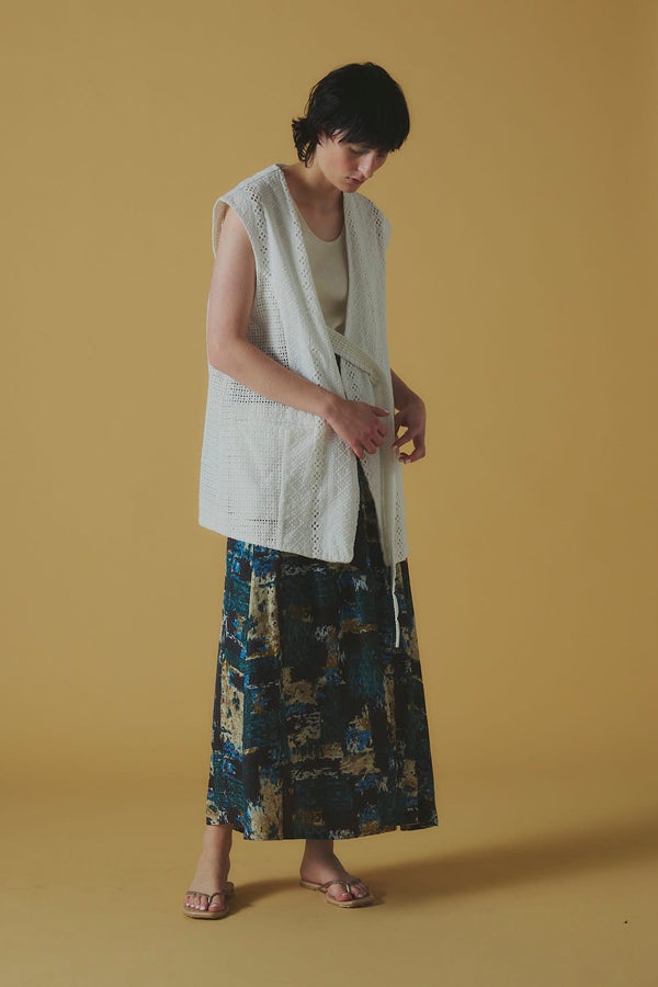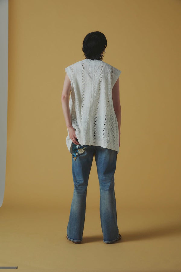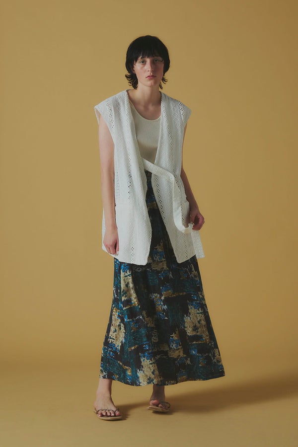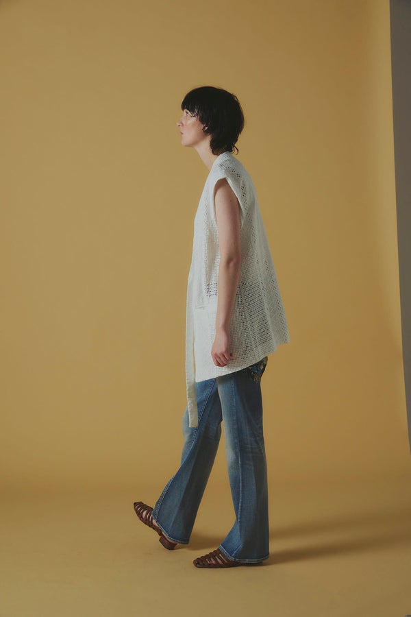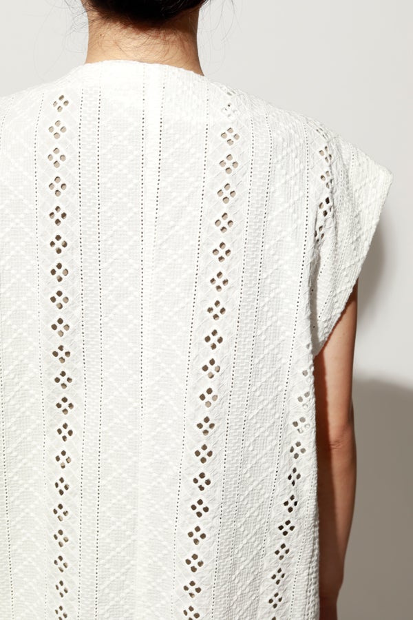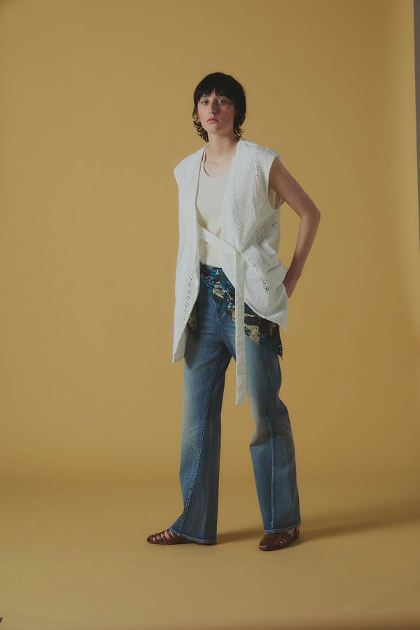 2種類の綿レースを組み合わせ、切り替えで立体的な表情を生み出したアイテム。 上品な透け感が夏らしい軽さを引き寄せながら、ノースリーブのすっきりとしたラインがきちんと感も両立。夏の通勤やお出かけシーンにぴったり。羽織るだけでシルエットが整う主役アイテムです。