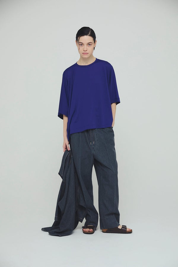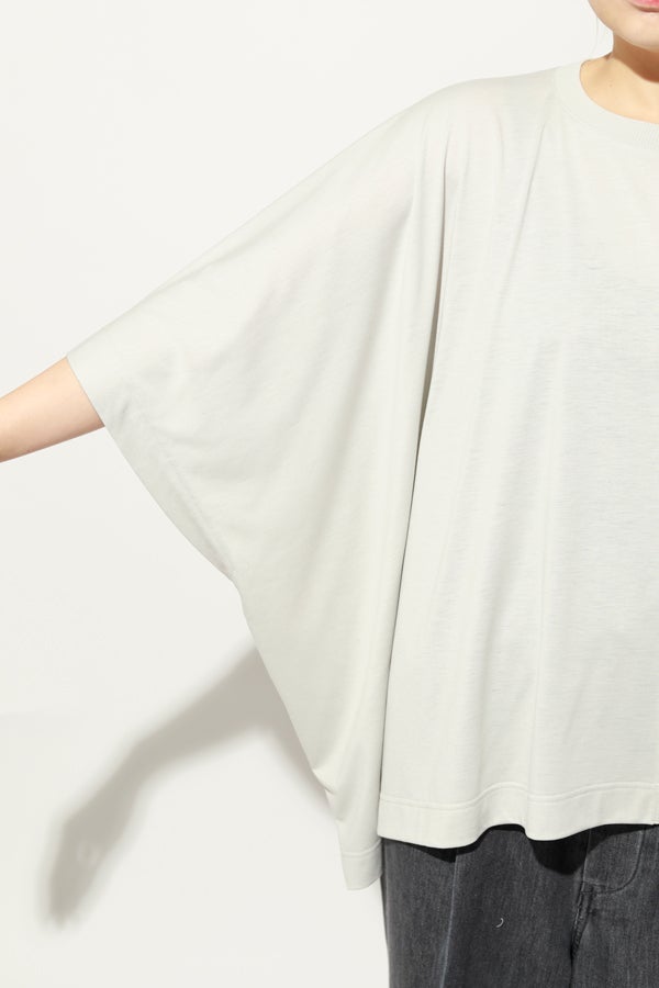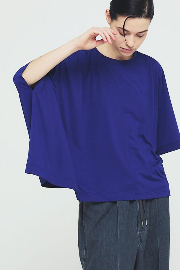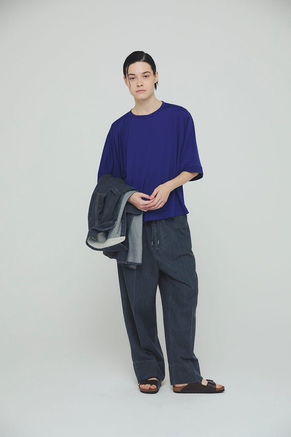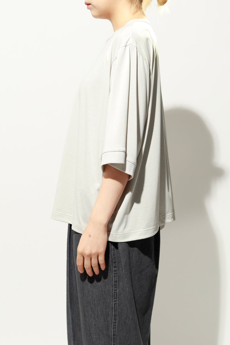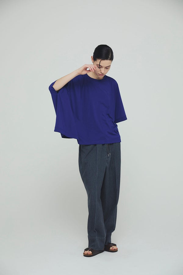 環境に配慮したレーヨン素材と、ペットボトルを再利用したポリエステルの糸を使用した天竺素材を採用。毛羽が起こりにくい紡績方法で、ハリコシ感を残しながら高密度に仕上げた生地は、光沢感と落ち感が絶妙で上品な印象をプラスします。