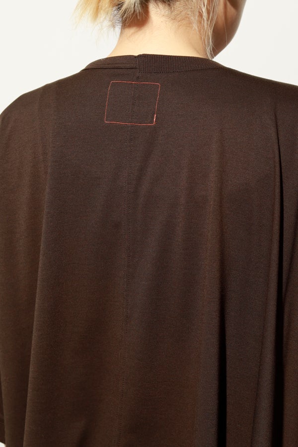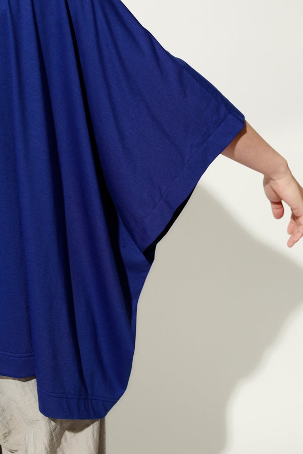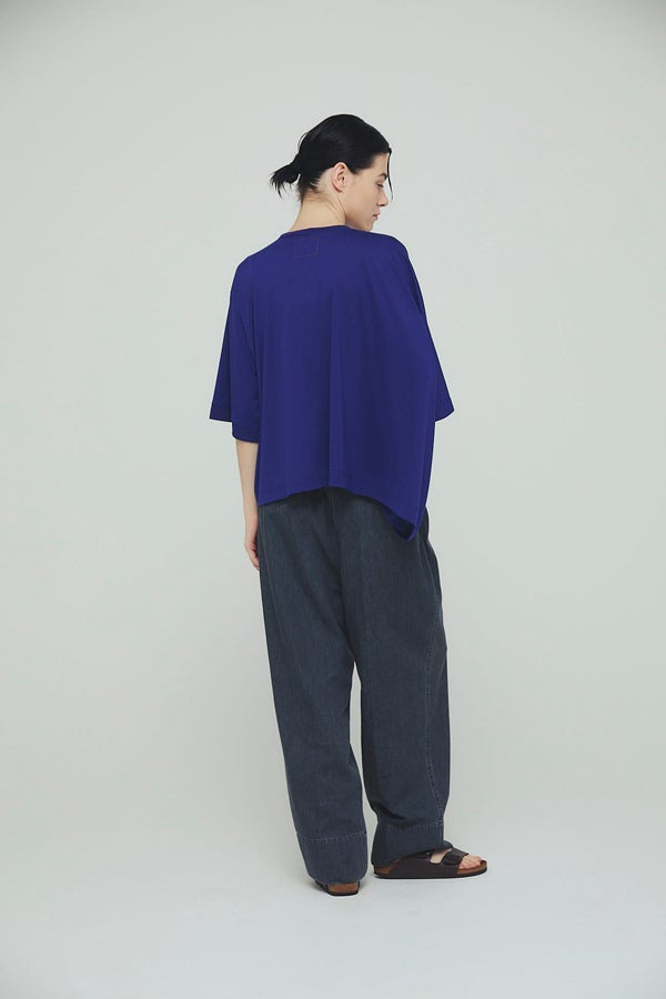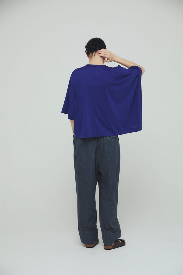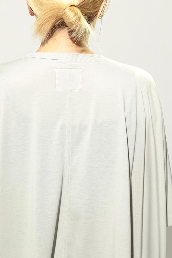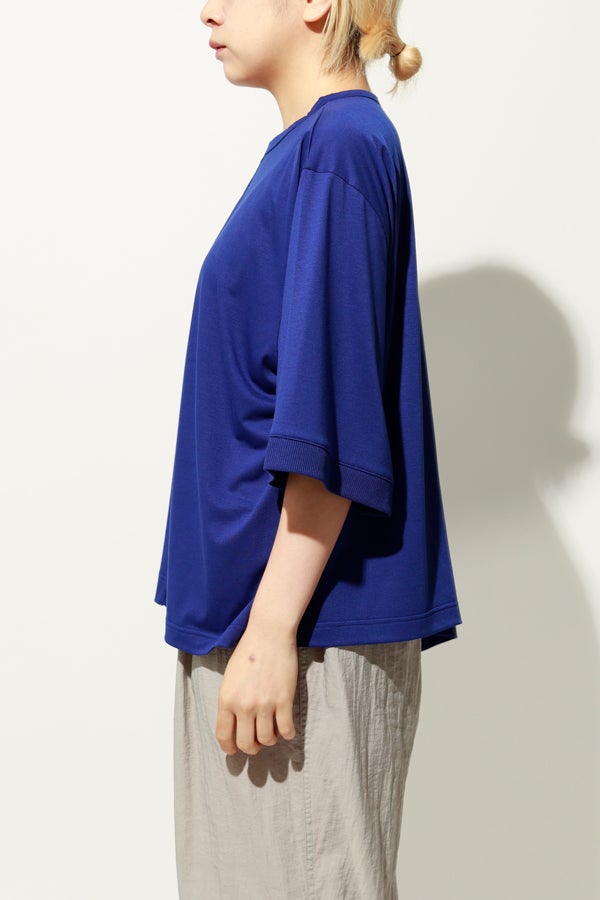 環境に配慮したレーヨン素材と、ペットボトルを再利用したポリエステルの糸を使用した天竺素材を採用。毛羽が起こりにくい紡績方法で、ハリコシ感を残しながら高密度に仕上げた生地は、光沢感と落ち感が絶妙で上品な印象をプラスします。