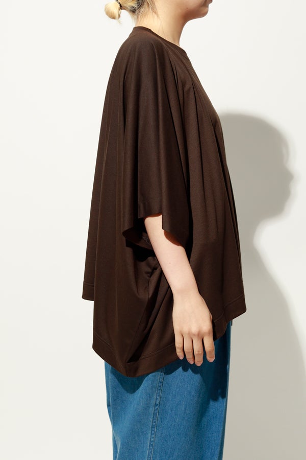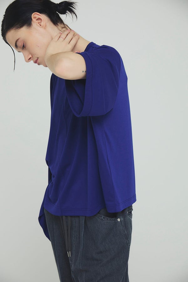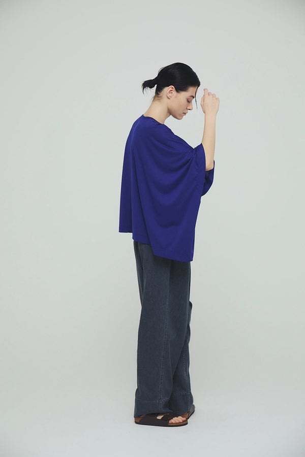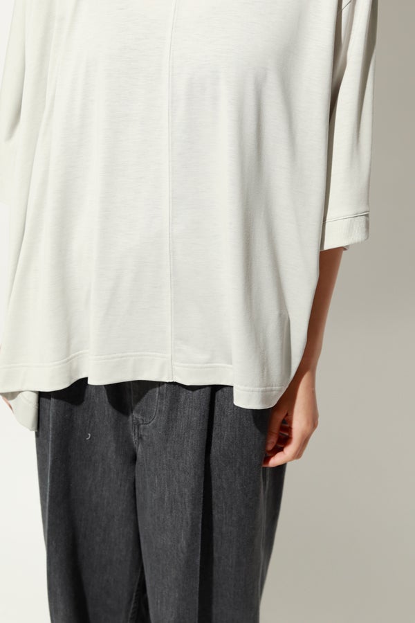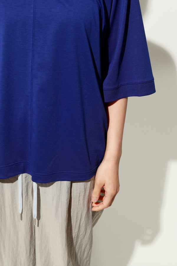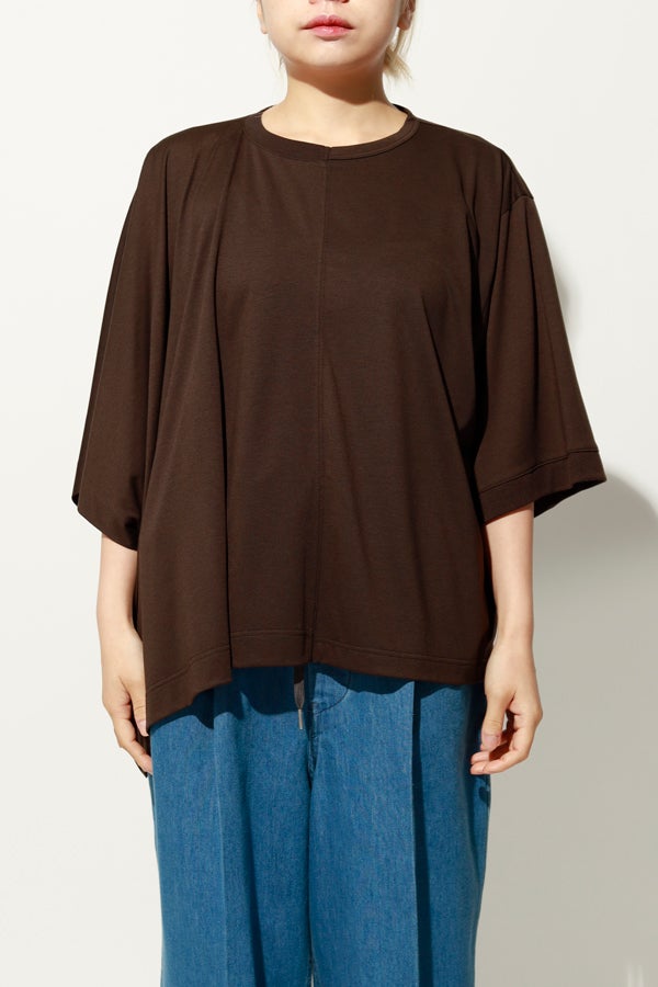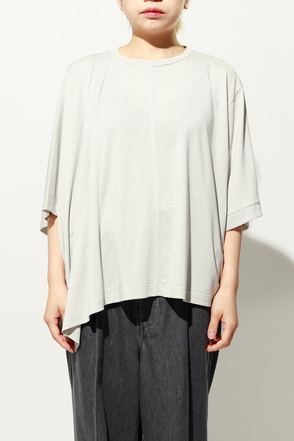 中心のハギによるデザインの切り替えが、着るだけでスタイリングのポイントになり、綺麗なドレープが女性らしいシルエットを演出。1枚で日常のコーディネートを格上げする、大人モードなプルオーバーです。