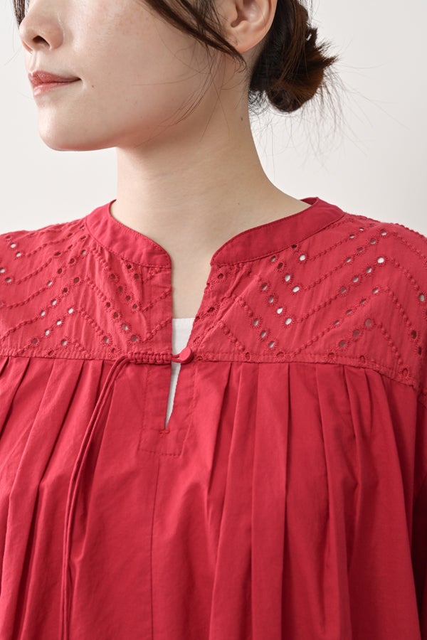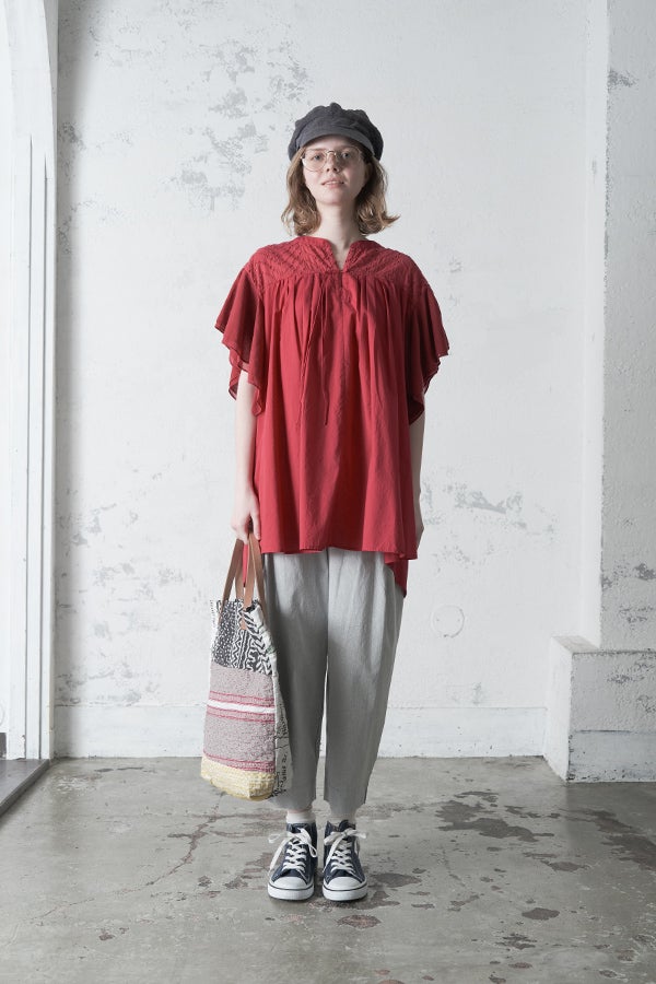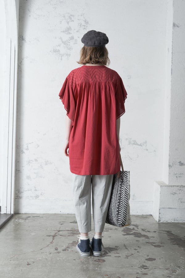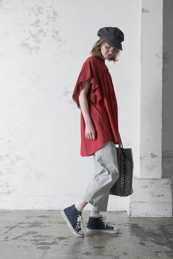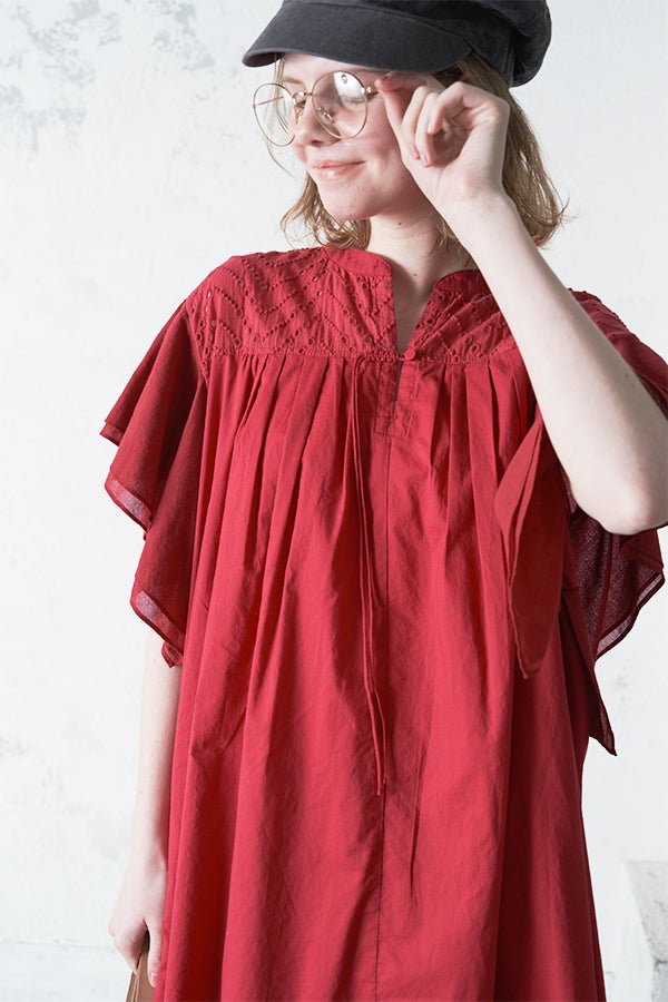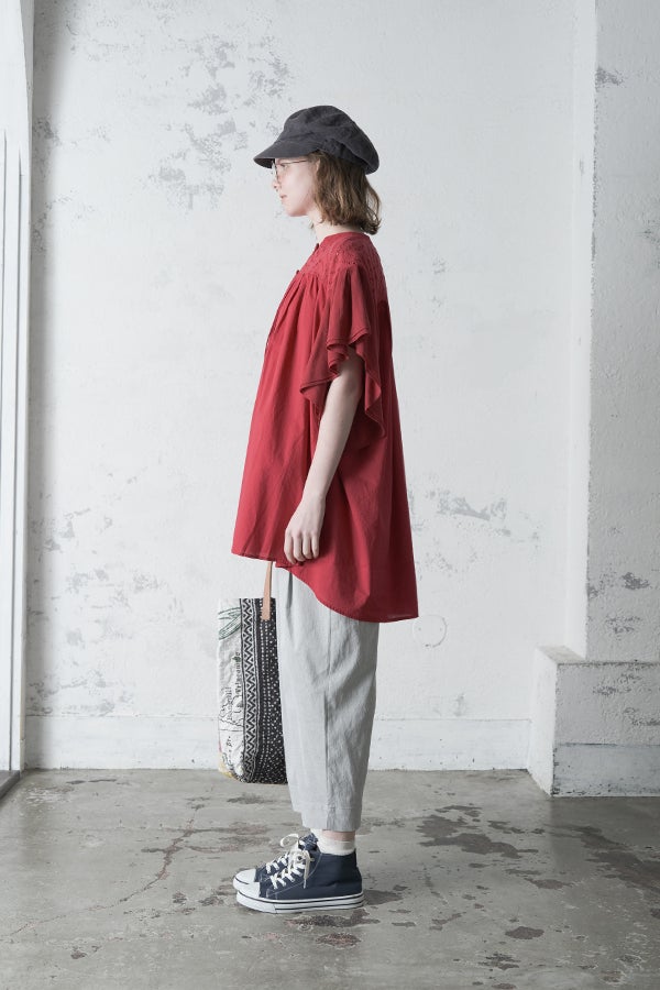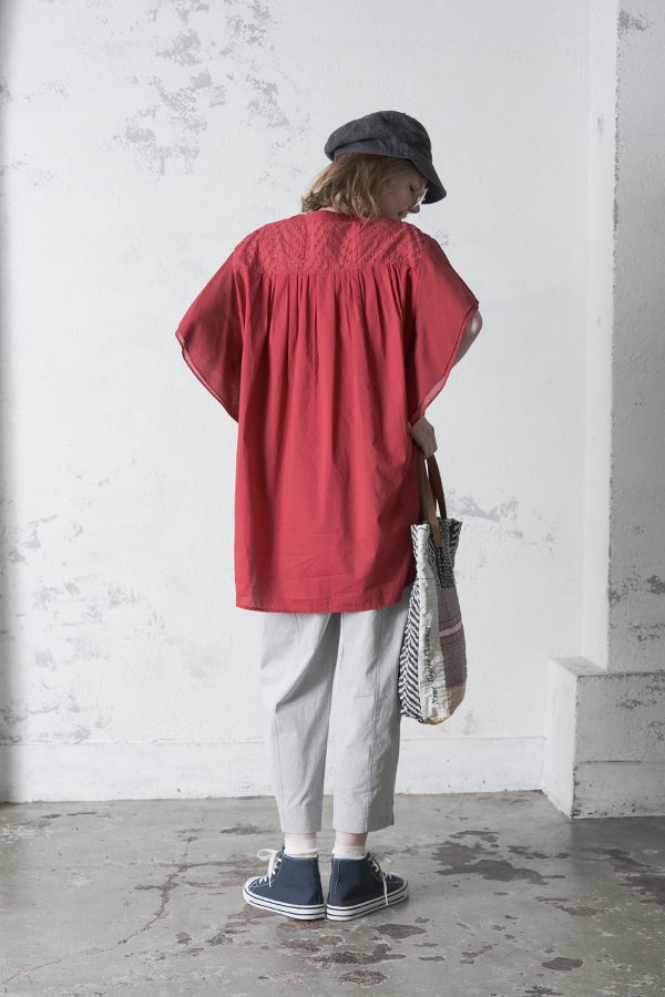 オリジナルカラーで染め上げた綿レースを部分使いした、大人に似合うアイテム。少し彩度を落とした赤が甘さを抑え、程よくモードな表情を添えてくれます。
