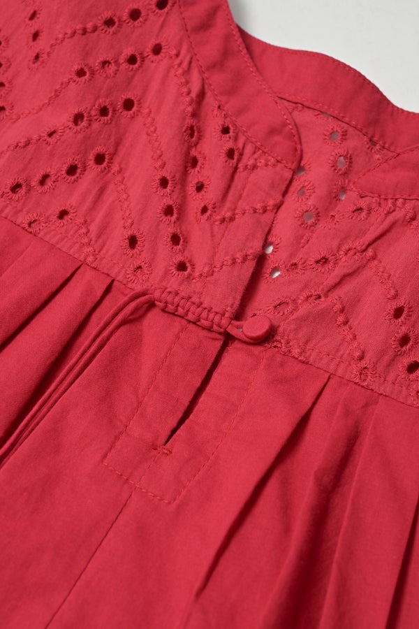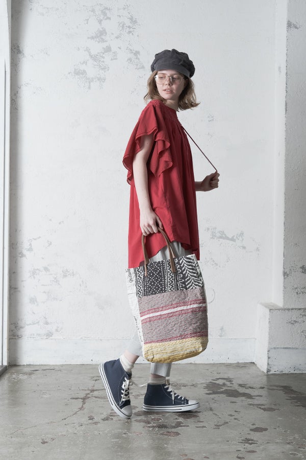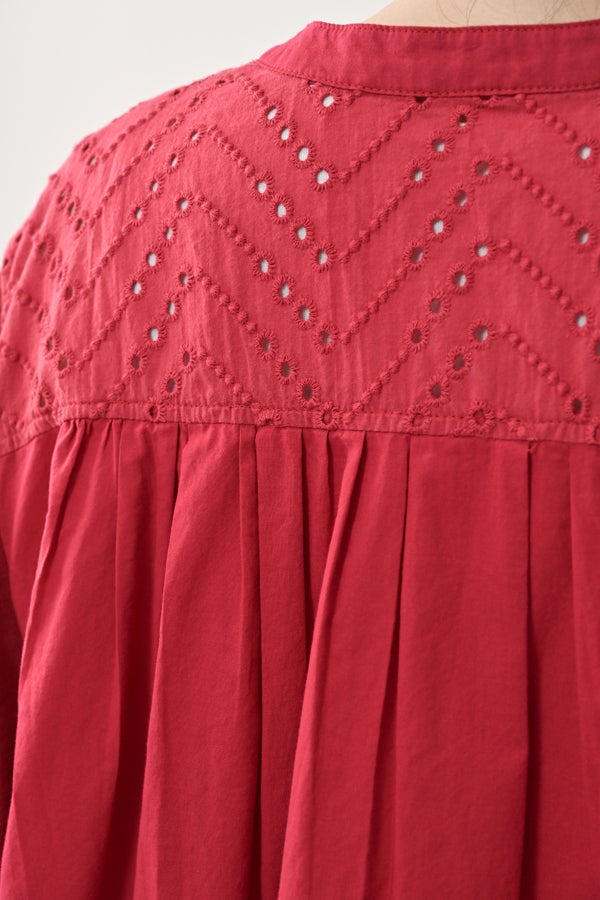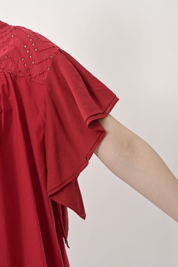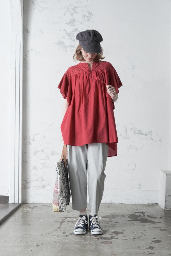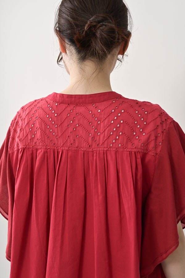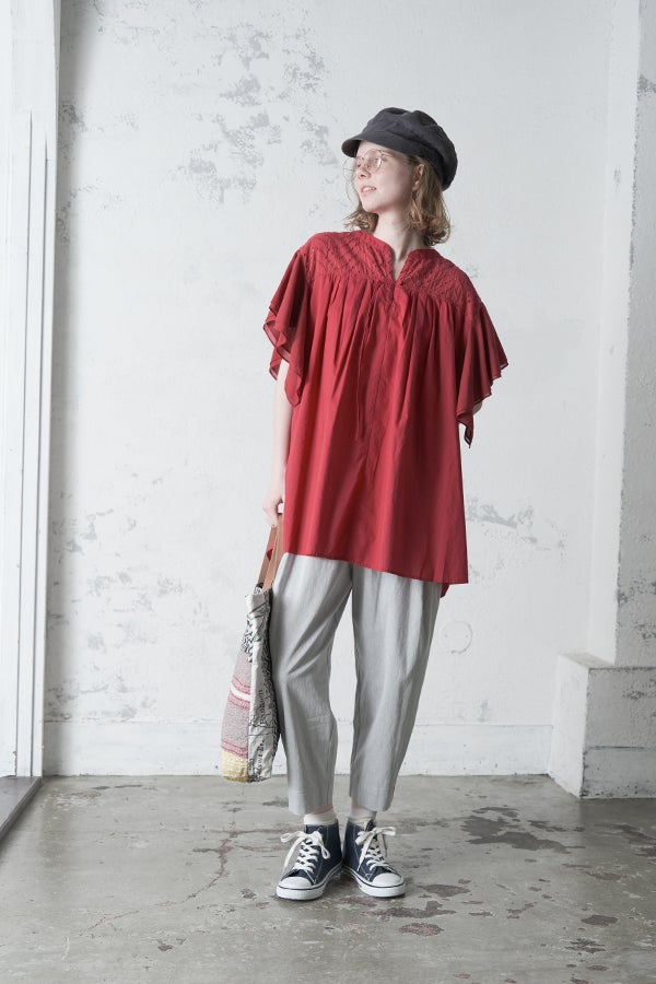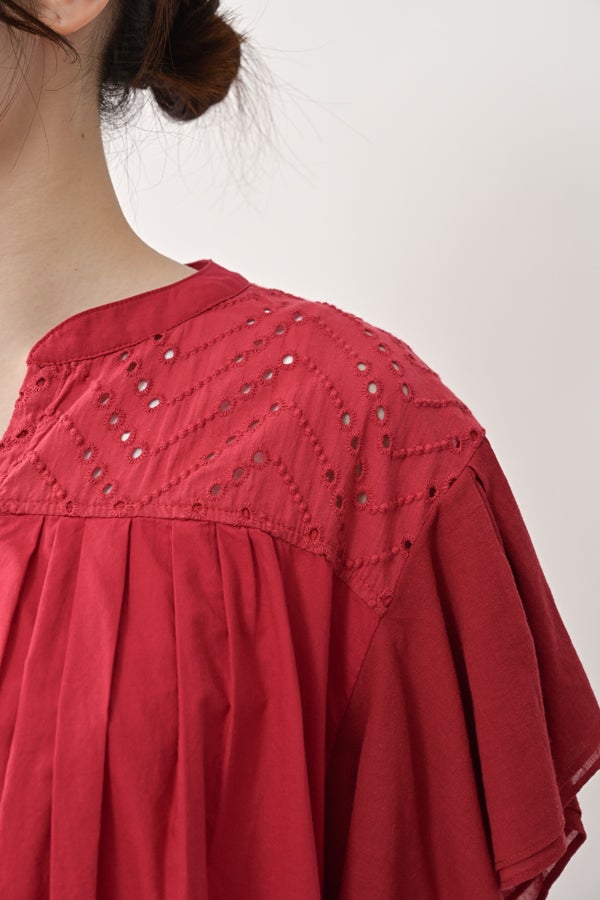オリジナルカラーで染め上げた綿レースを部分使いした、大人に似合うアイテム。少し彩度を落とした赤が甘さを抑え、程よくモードな表情を添えてくれます。