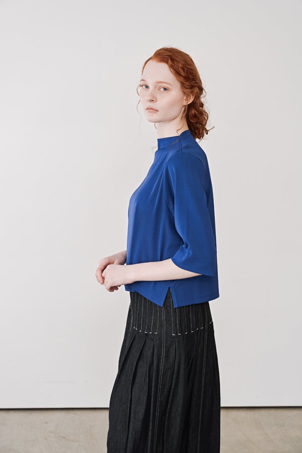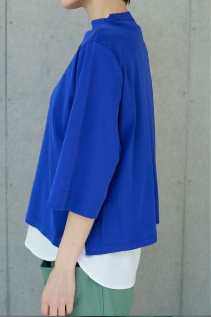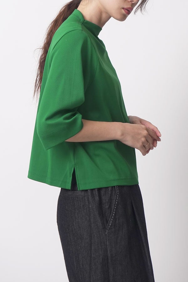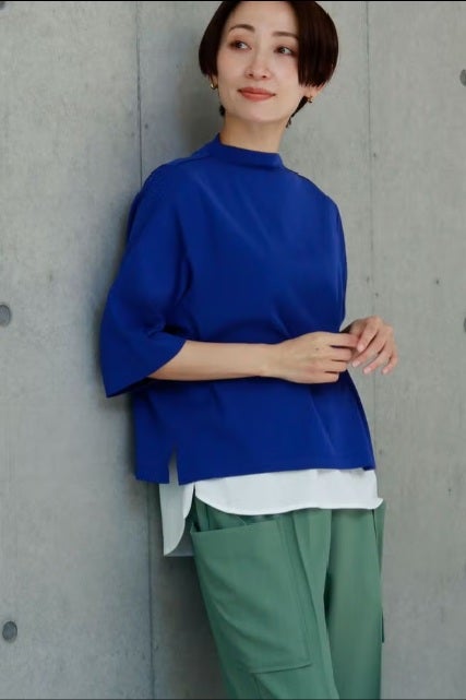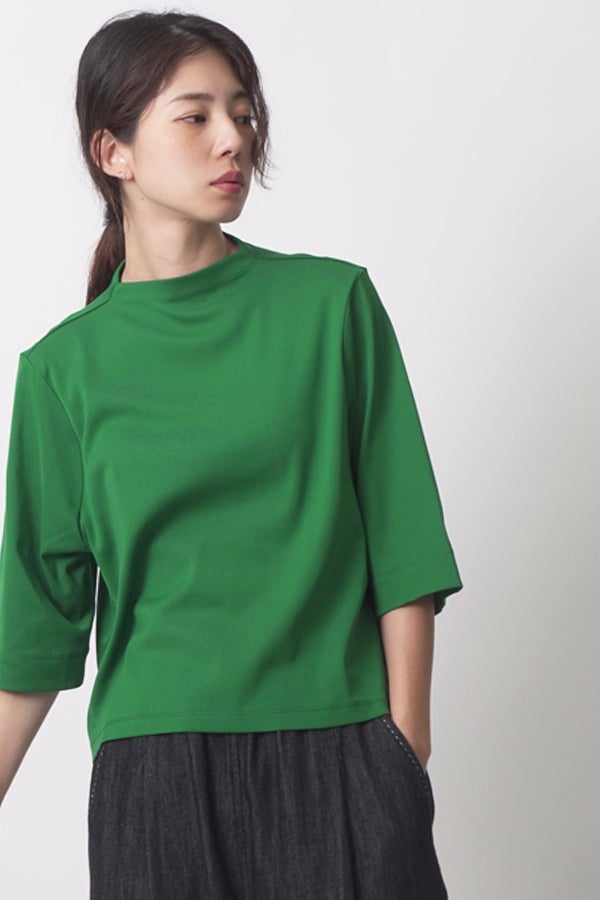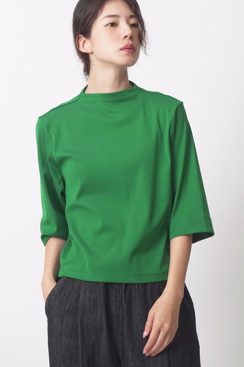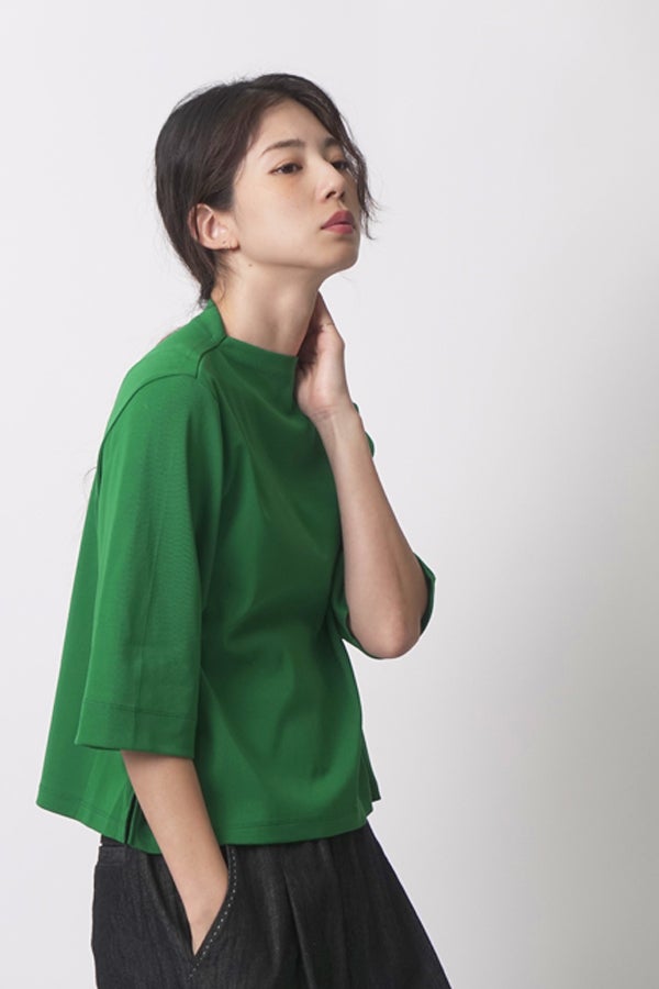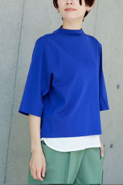 ご好評につき、追加生産決定!※25168-1231Z-G / 24168-1690Z-Rの追加となります。 夏に手放せない、定番涼感ベーシックプルオーバー。 RED-akane夏の定番素材「グレシャスクール」を使用した、大人のためのベーシックアイテム。接触冷感のさらりとした肌触りと、上品さを保ったリラックス感が、暑い季節の装いを心地よく支えてくれます。 首元は日焼け対策も意識した低めのボトルネック仕様。長めの五分袖と、身体のラインを拾いすぎない程よいゆとりが、大人にちょうどいいバランスを叶えます。肌にまとわりつかない素材感で、一枚でも安心して着用できるのも魅力。 発色の美しさがコーディネートのさりげないアクセントとなり、デイリーに自然と手が伸びる。夏のワードローブに欠かせない、信頼の定番プルオーバーです。 GRECIOUS COOL(=グレシャスクール) 独自の加工工程によって繊維を芯から改質し、膨らみと滑らかさを備えた新しい加工技術です。様々な工程の組合わせにより完成した生地で、物性安定・美しい光沢・発色性UP・キックバックの向上が特徴です。 ●日本製