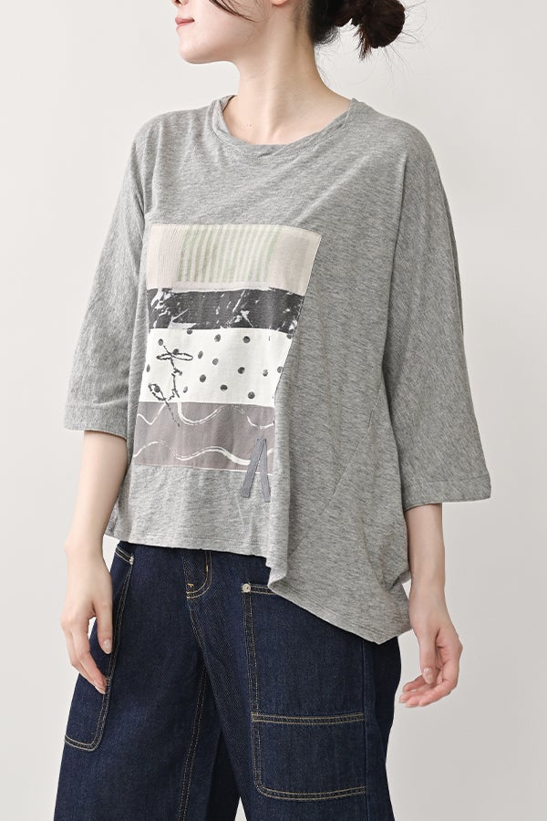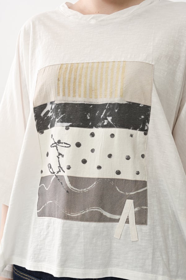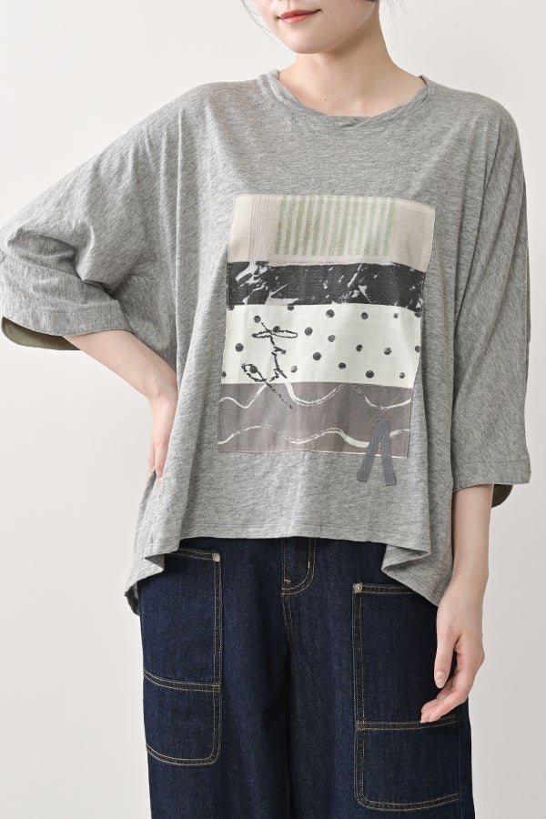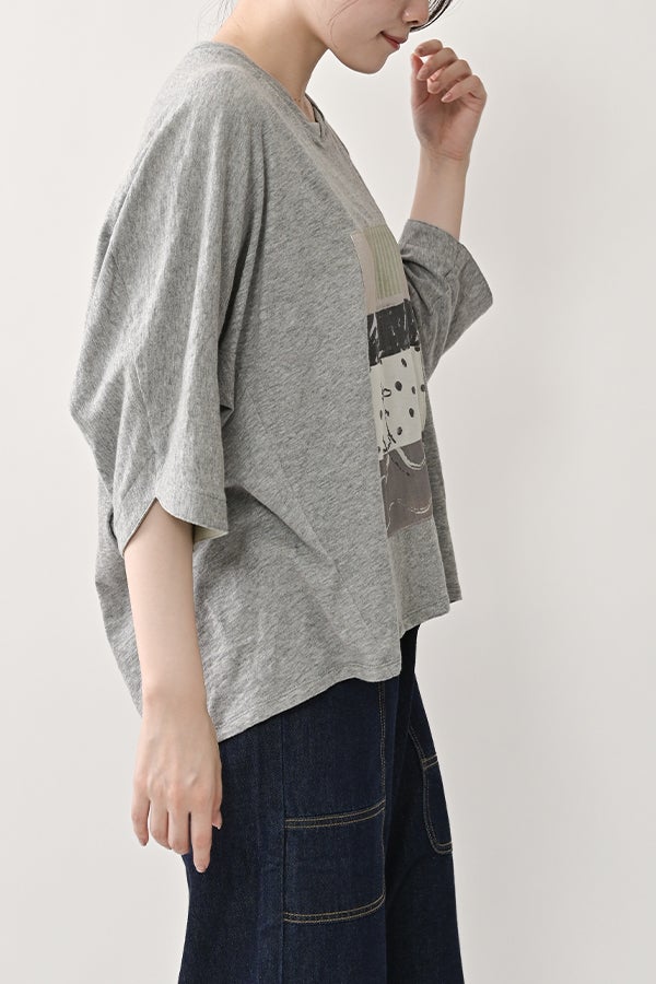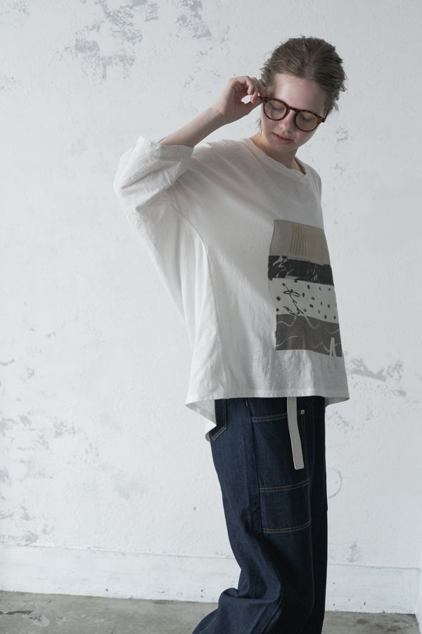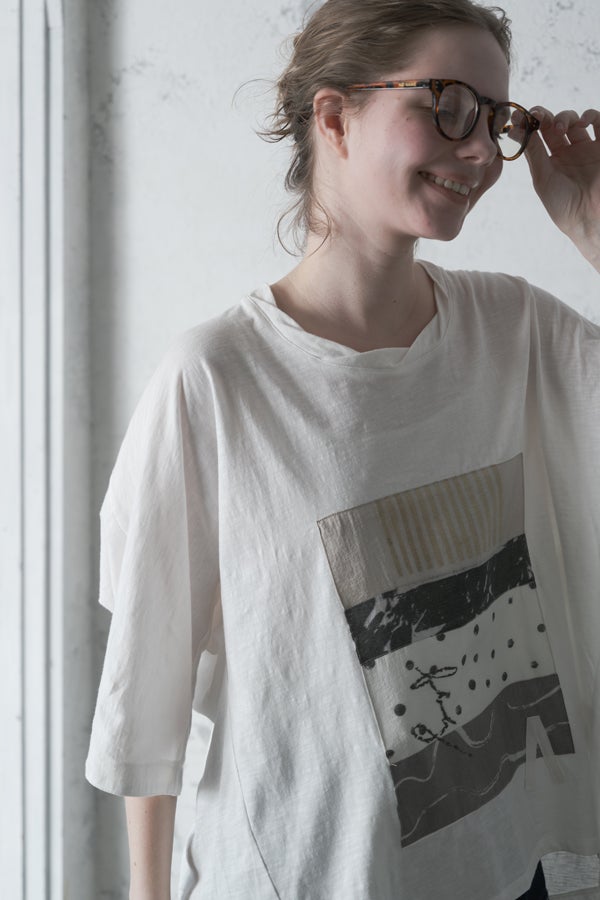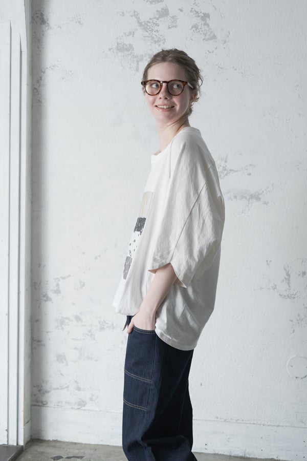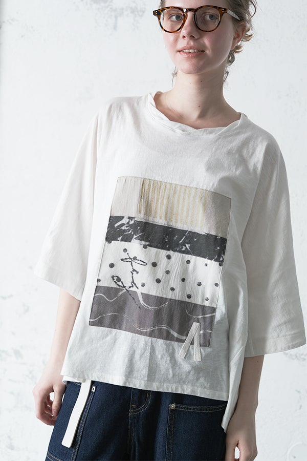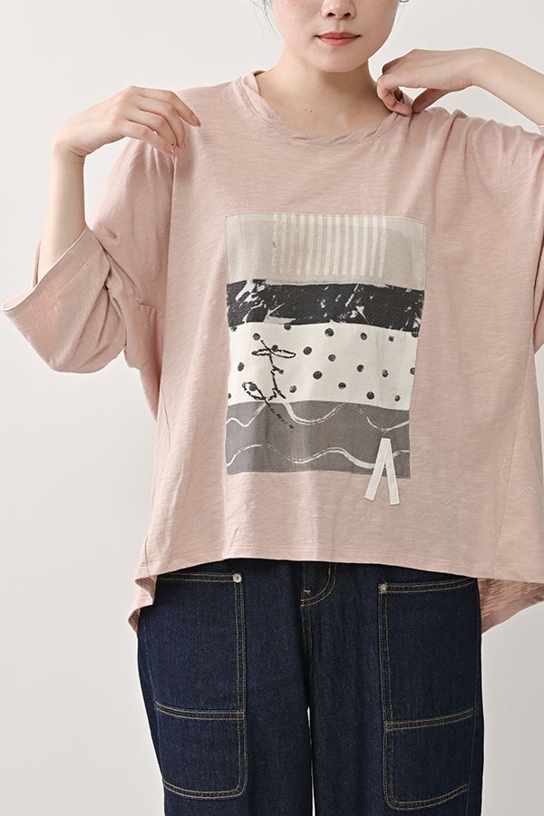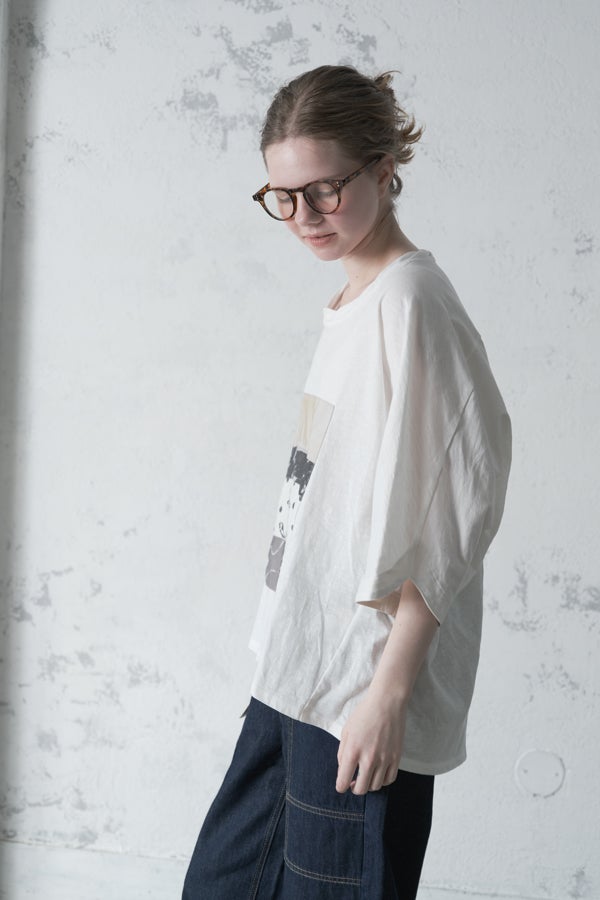 アートピースのように映える、ドルマンTシャツ。 肩から袖へとなだらかに落ちるドルマンシルエットが、ほどよいゆとりと抜け感を生み出す、大人に心地いい一枚。スラブ天竺ならではのムラ感が、シンプルな中にヴィンテージの風合いを添え、表情豊かな仕上がりに。 衿ぐりはあえてねじるように縫い付けることで、洗濯を重ねてもヨレにくい仕様に。肘までしっかり覆う安心の袖丈で、袖口の見返しに別布を仕込み、動いたときにちらりと覗く裏側までデザインの一部に。さらに、別布の上にパネルプリントを施し、それを本体に重ね付けることで、まるでアートピースのような存在感を演出します。 後ろ丈は長めでヒップをすっぽりカバー。パンツとの相性も良く、体型を気にせずすっきりと着られます。デイリーに着られる気軽さを持ちながら、1枚でコーディネートの主役になる、洗練された大人のTシャツです。