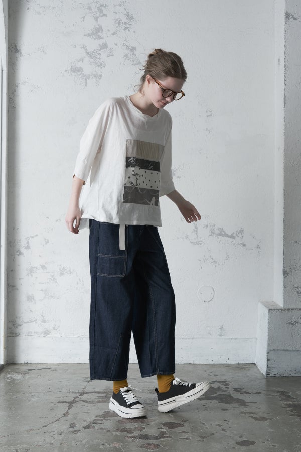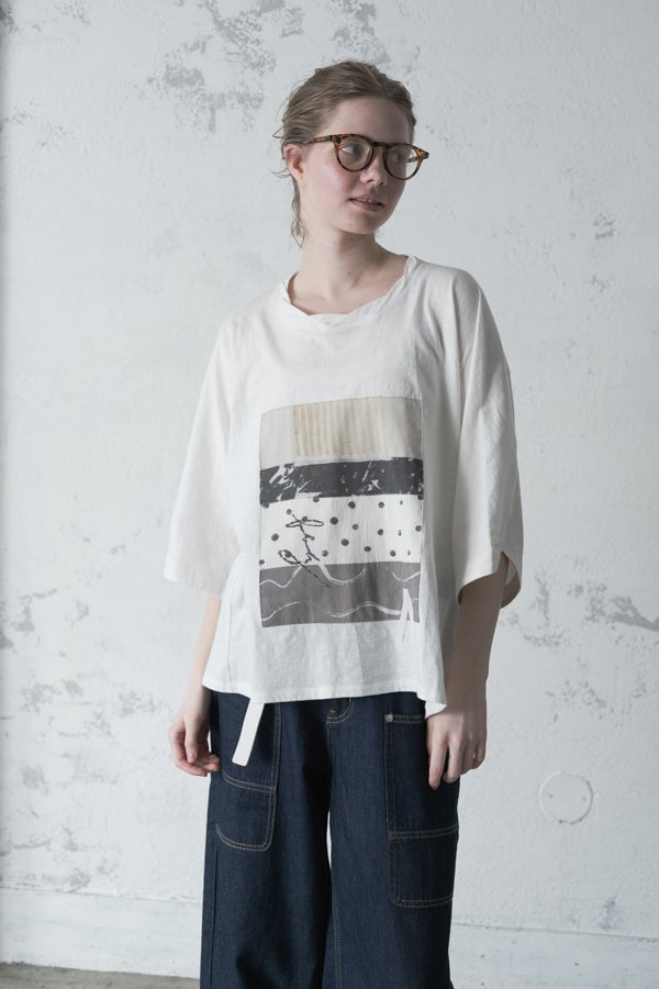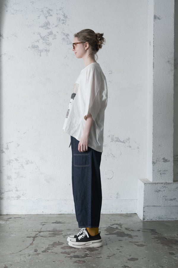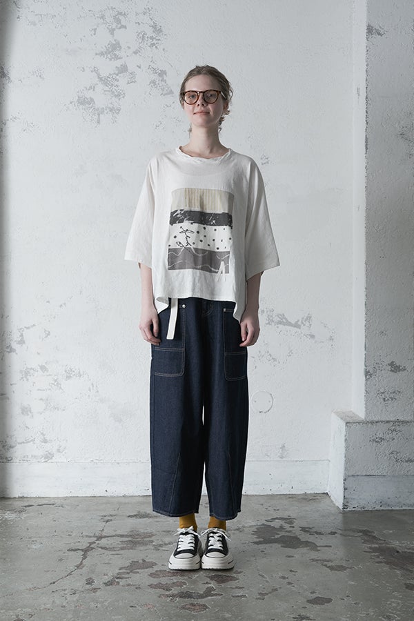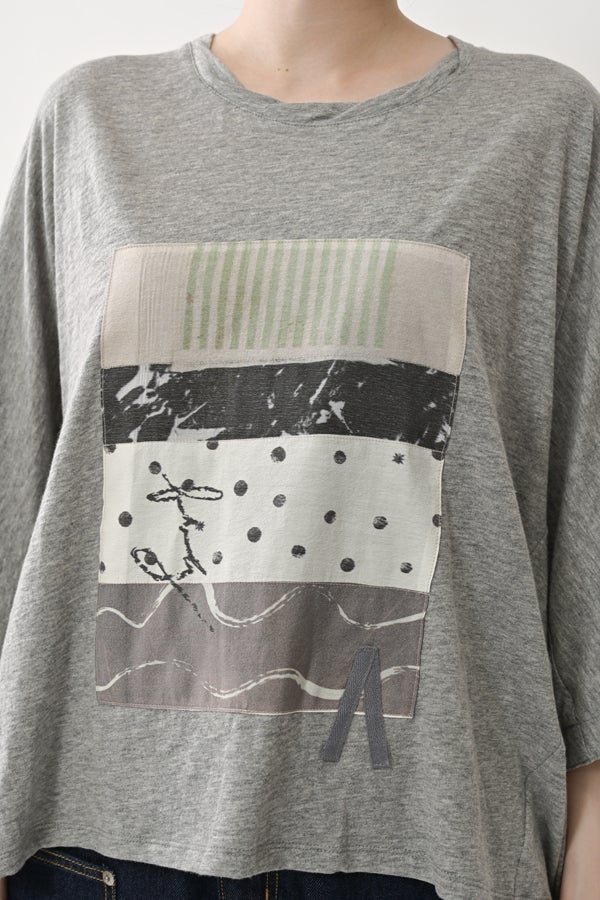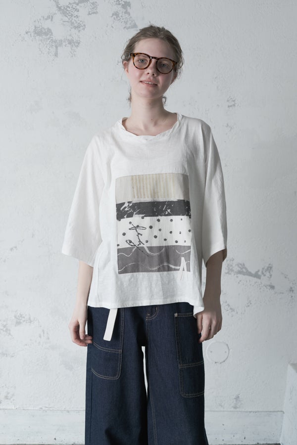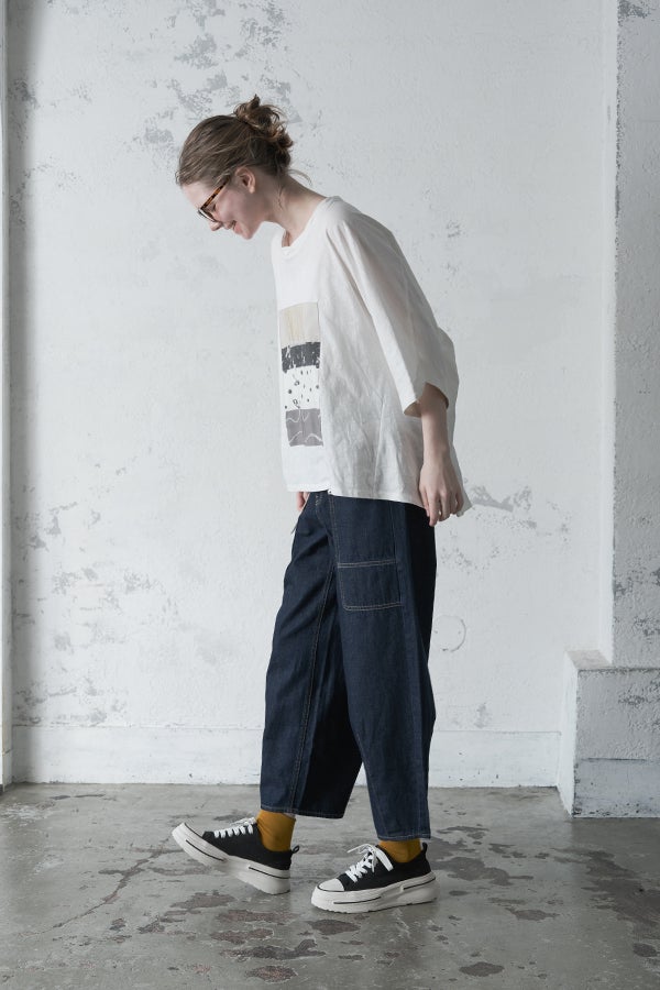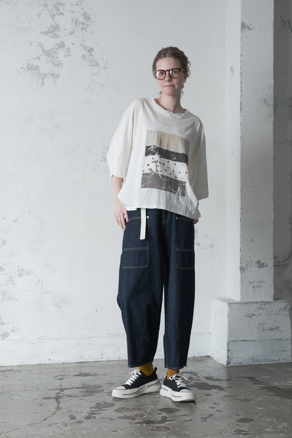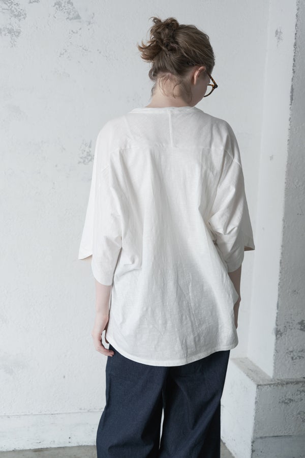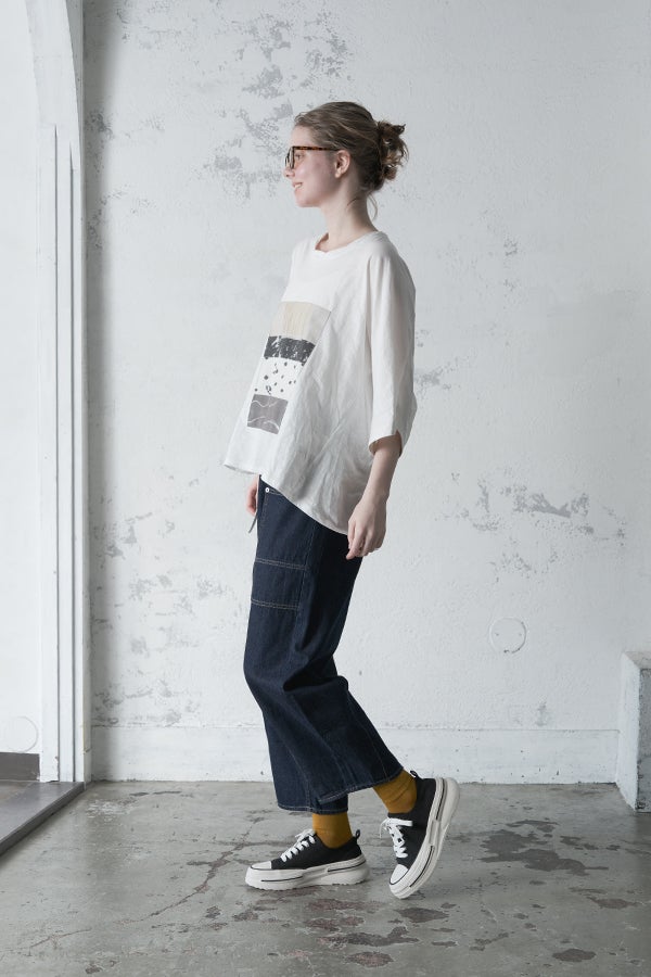 アートピースのように映える、ドルマンTシャツ。 肩から袖へとなだらかに落ちるドルマンシルエットが、ほどよいゆとりと抜け感を生み出す、大人に心地いい一枚。スラブ天竺ならではのムラ感が、シンプルな中にヴィンテージの風合いを添え、表情豊かな仕上がりに。 衿ぐりはあえてねじるように縫い付けることで、洗濯を重ねてもヨレにくい仕様に。肘までしっかり覆う安心の袖丈で、袖口の見返しに別布を仕込み、動いたときにちらりと覗く裏側までデザインの一部に。さらに、別布の上にパネルプリントを施し、それを本体に重ね付けることで、まるでアートピースのような存在感を演出します。 後ろ丈は長めでヒップをすっぽりカバー。パンツとの相性も良く、体型を気にせずすっきりと着られます。デイリーに着られる気軽さを持ちながら、1枚でコーディネートの主役になる、洗練された大人のTシャツです。