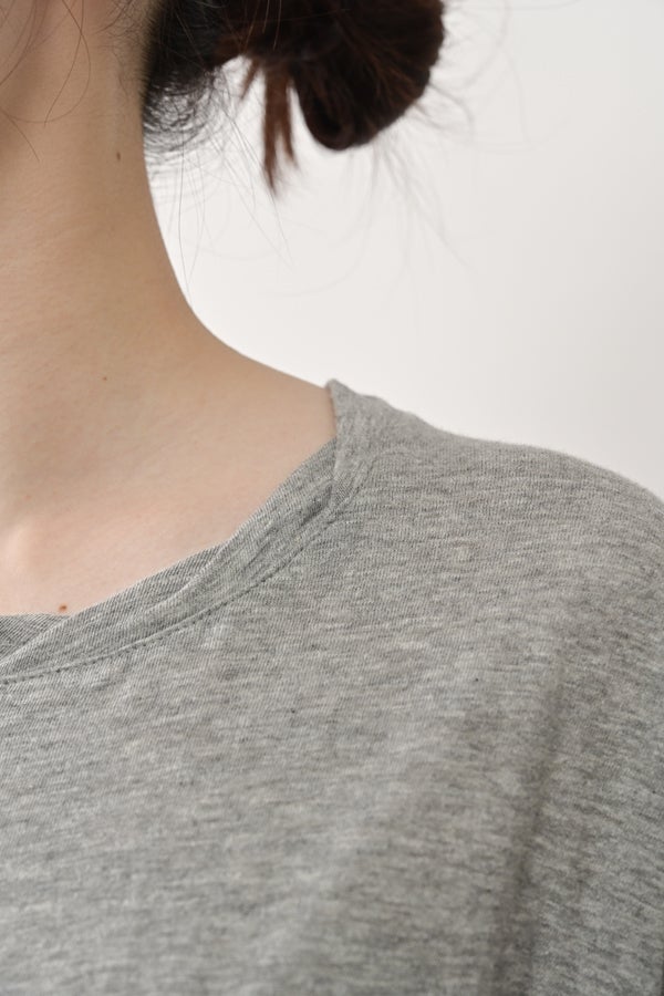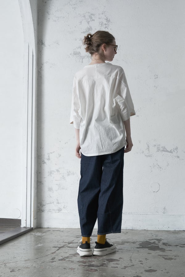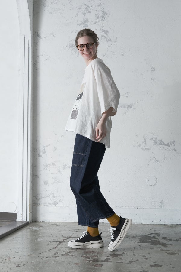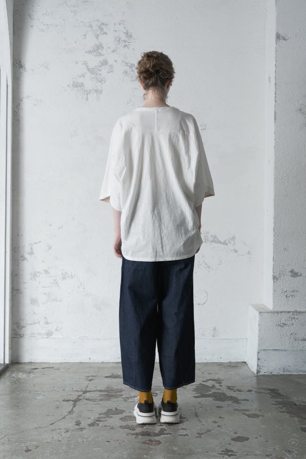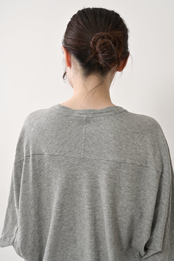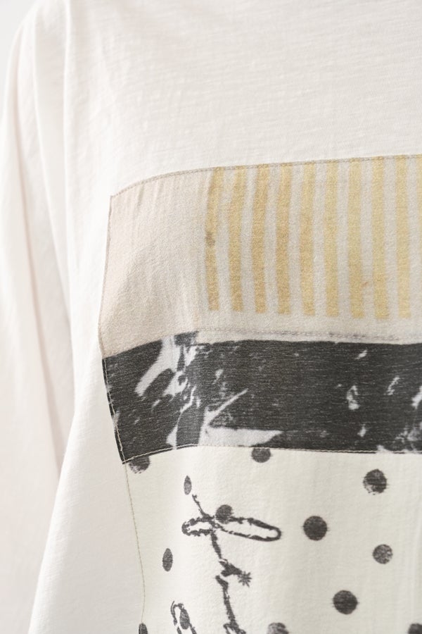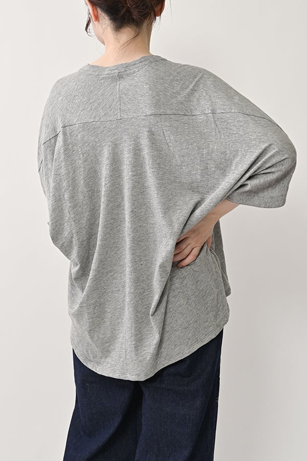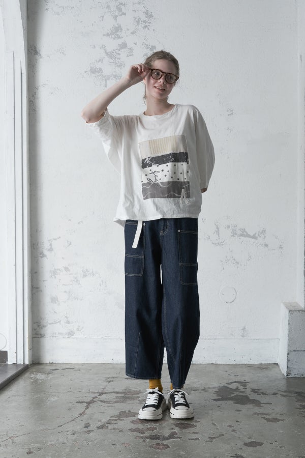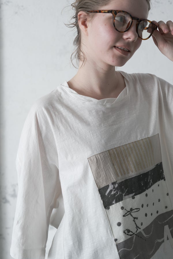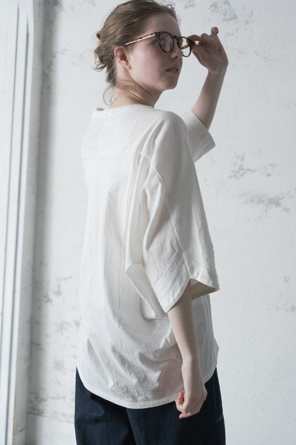 アートピースのように映える、ドルマンTシャツ。 肩から袖へとなだらかに落ちるドルマンシルエットが、ほどよいゆとりと抜け感を生み出す、大人に心地いい一枚。スラブ天竺ならではのムラ感が、シンプルな中にヴィンテージの風合いを添え、表情豊かな仕上がりに。 衿ぐりはあえてねじるように縫い付けることで、洗濯を重ねてもヨレにくい仕様に。肘までしっかり覆う安心の袖丈で、袖口の見返しに別布を仕込み、動いたときにちらりと覗く裏側までデザインの一部に。さらに、別布の上にパネルプリントを施し、それを本体に重ね付けることで、まるでアートピースのような存在感を演出します。 後ろ丈は長めでヒップをすっぽりカバー。パンツとの相性も良く、体型を気にせずすっきりと着られます。デイリーに着られる気軽さを持ちながら、1枚でコーディネートの主役になる、洗練された大人のTシャツです。