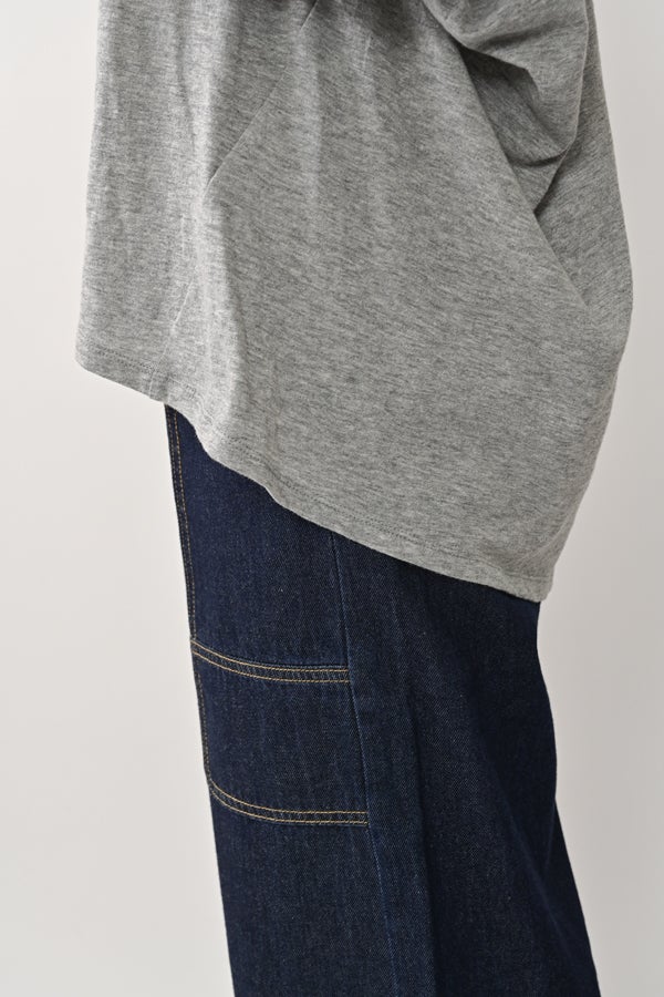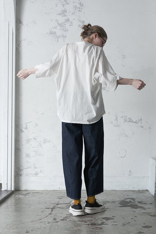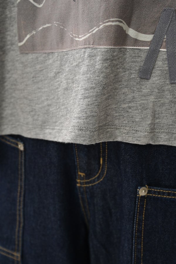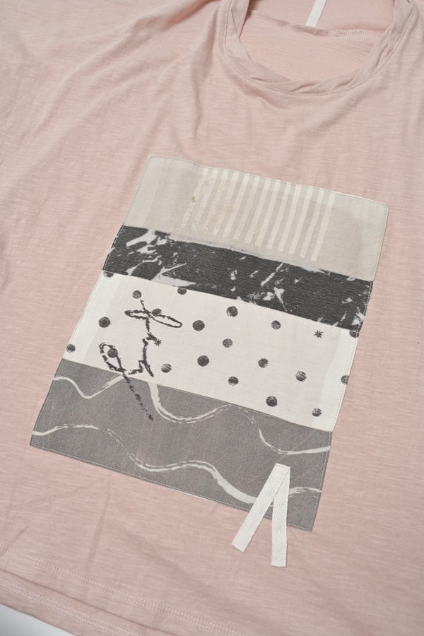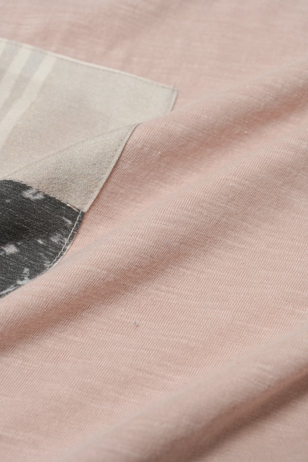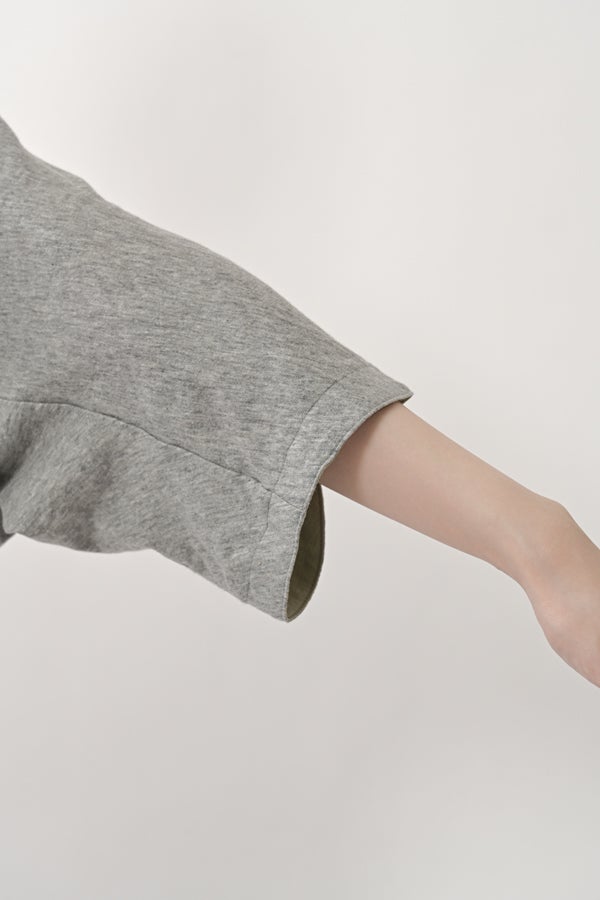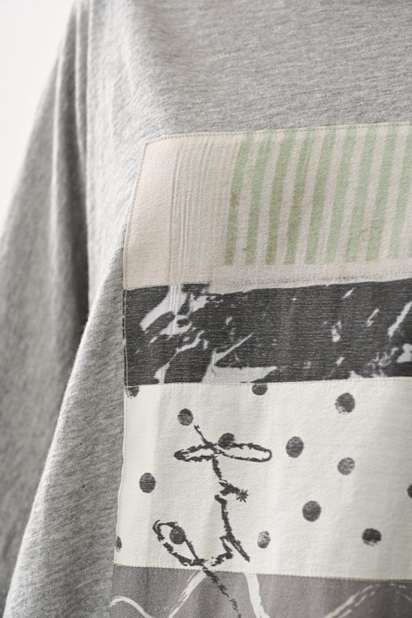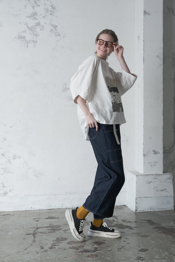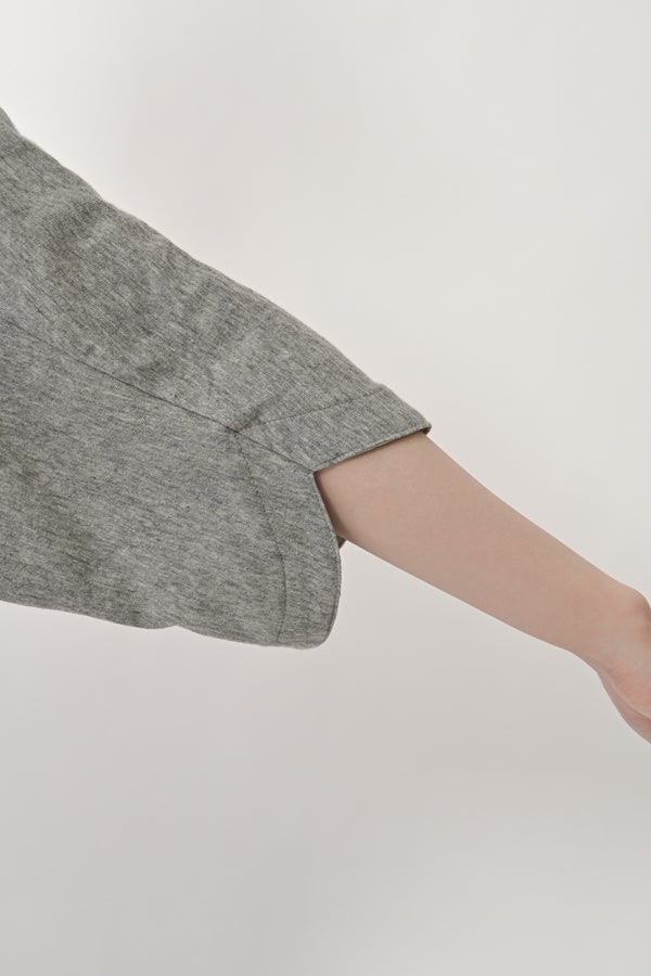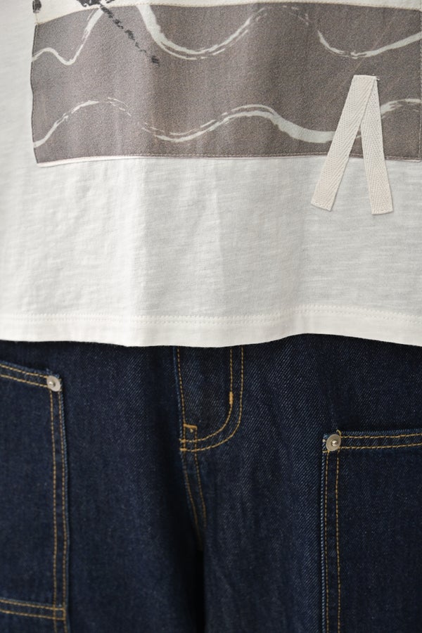 アートピースのように映える、ドルマンTシャツ。 肩から袖へとなだらかに落ちるドルマンシルエットが、ほどよいゆとりと抜け感を生み出す、大人に心地いい一枚。スラブ天竺ならではのムラ感が、シンプルな中にヴィンテージの風合いを添え、表情豊かな仕上がりに。 衿ぐりはあえてねじるように縫い付けることで、洗濯を重ねてもヨレにくい仕様に。肘までしっかり覆う安心の袖丈で、袖口の見返しに別布を仕込み、動いたときにちらりと覗く裏側までデザインの一部に。さらに、別布の上にパネルプリントを施し、それを本体に重ね付けることで、まるでアートピースのような存在感を演出します。 後ろ丈は長めでヒップをすっぽりカバー。パンツとの相性も良く、体型を気にせずすっきりと着られます。デイリーに着られる気軽さを持ちながら、1枚でコーディネートの主役になる、洗練された大人のTシャツです。