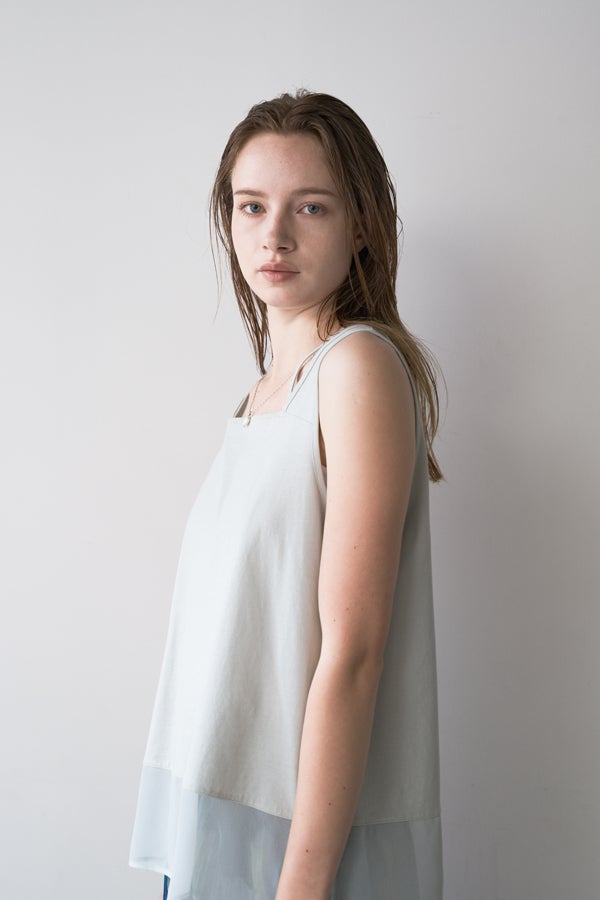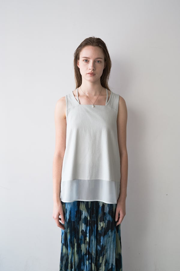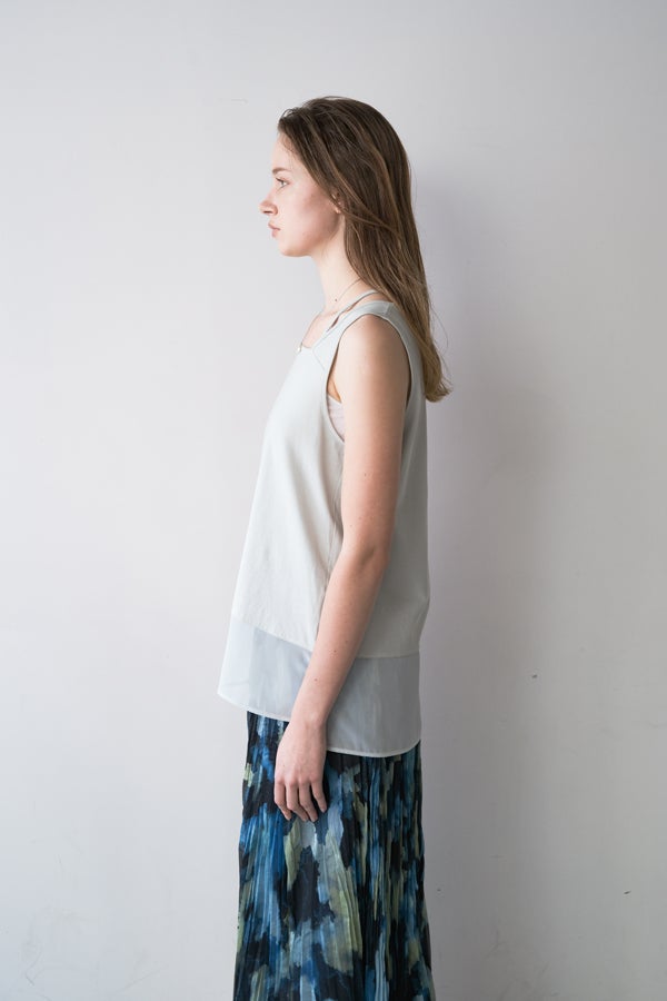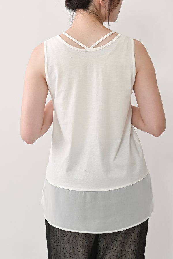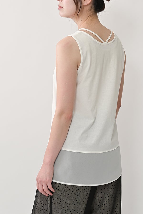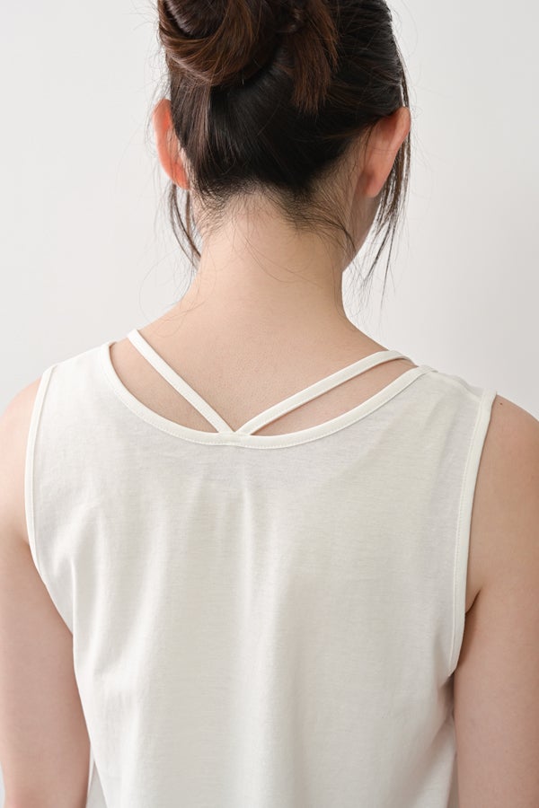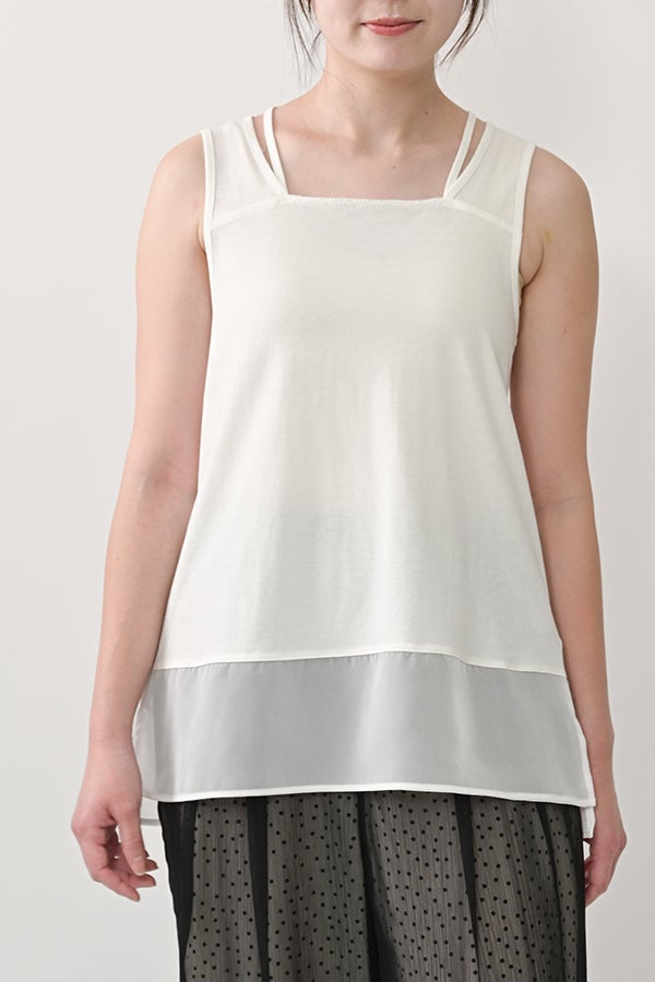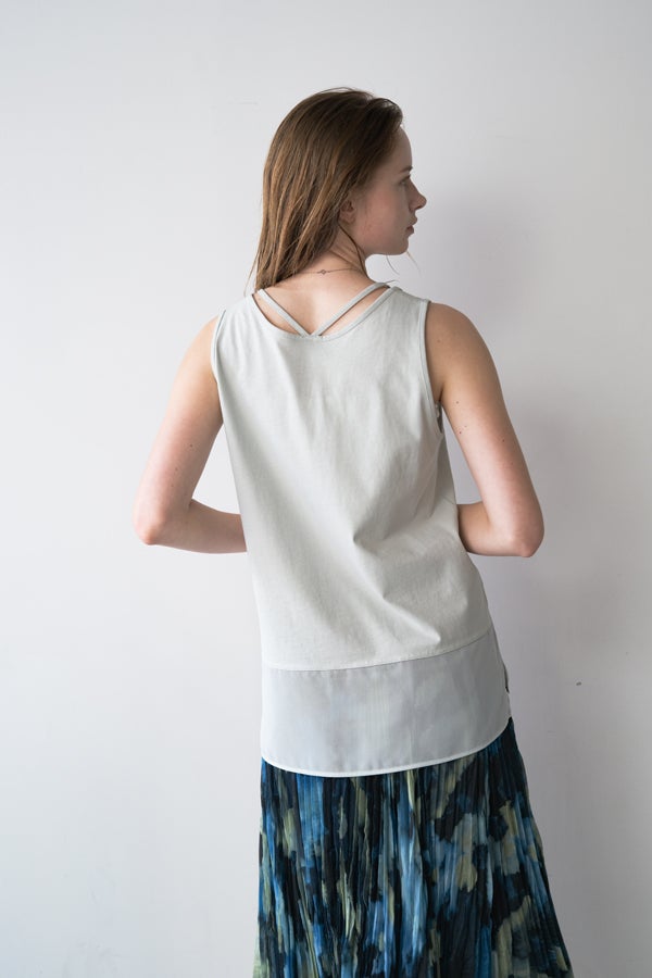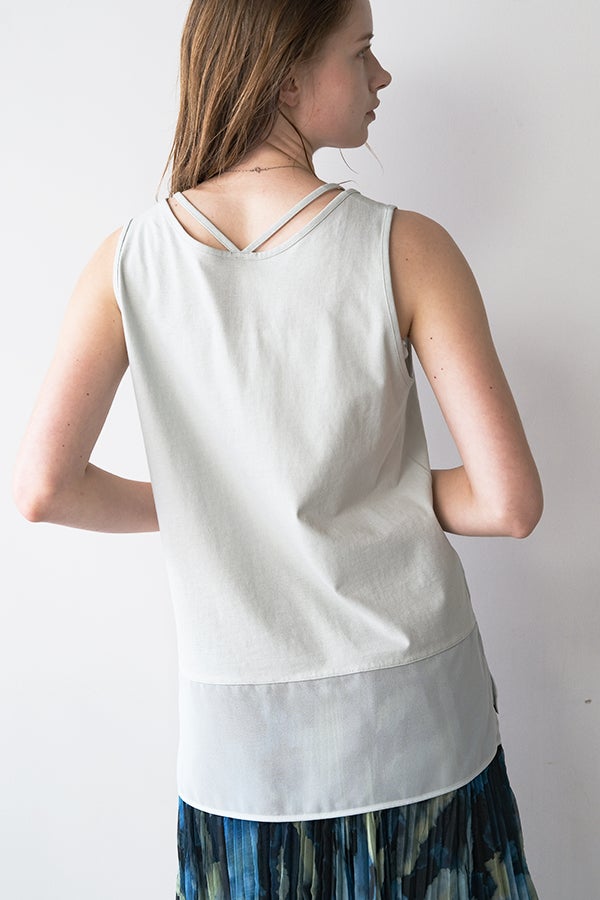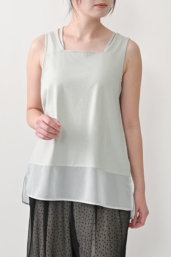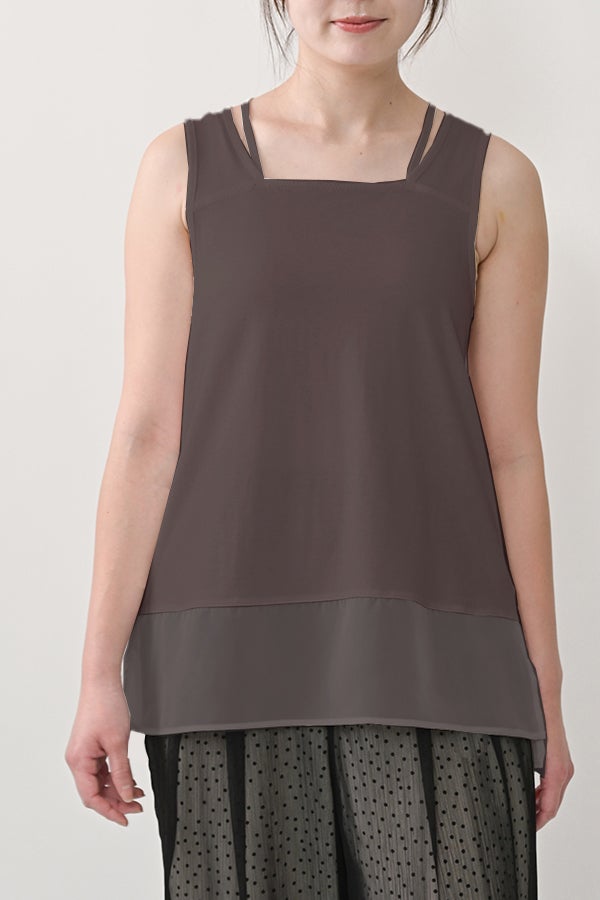 重ねて映える、夏の華奢見せタンク。 マルチに活躍する夏のタンクトップは、ネックに添えた細いテープがさりげないアクセントとなり、レイヤードに品のあるニュアンスをプラス。裾にはシアーな布帛素材をドッキングし、軽さと奥行きを持たせたデザインが、重ねるだけでこなれたバランスをつくります。 大きく開いたトップスのインナーとして覗くテープは、首元を華奢に見せながら洒落感をひとさじ。きれいめの羽織りとデニムで外せば、大人の抜けを感じるスタイルに。セットアップに合わせれば、ちょっとしたお出かけや学校行事にも対応できる万能さ。夏の着こなしに美しいレイヤードをもたらす一枚です。 ●COOLローレルの特徴 接触冷感加工、美しい光沢感、洗濯を繰り返しても毛羽立ちが少ない ●日本製