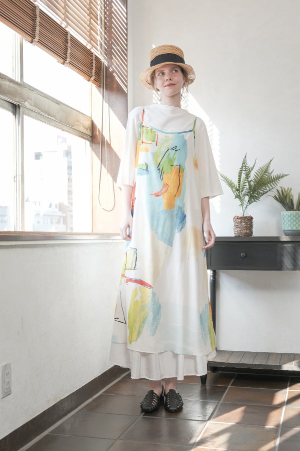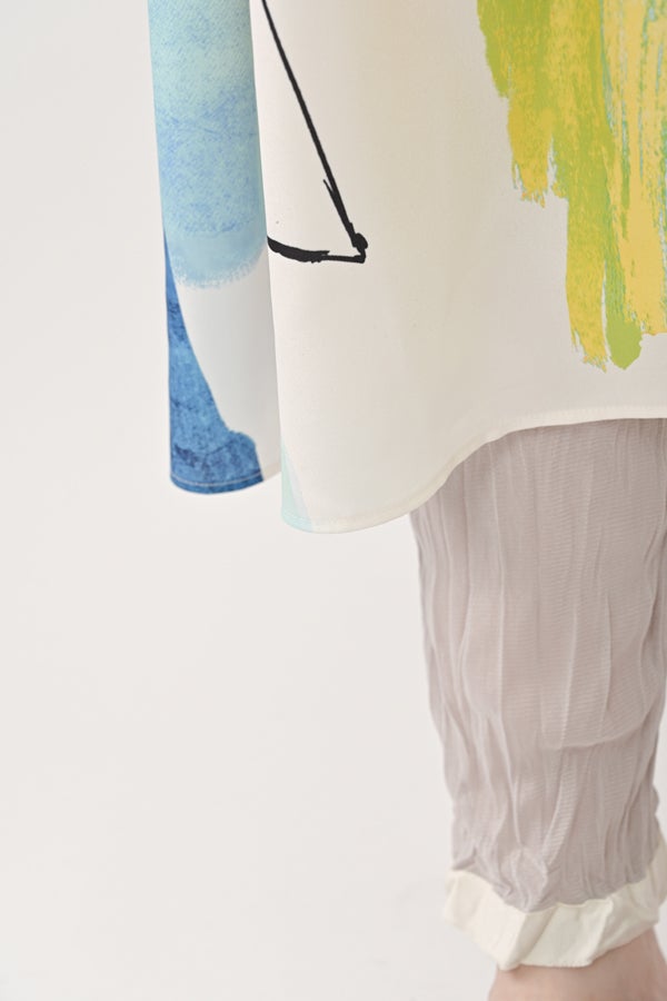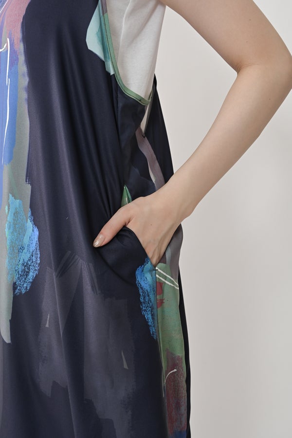 アートを纏う、パネルプリントワンピース。 RED-akaneオリジナルのパネルプリント柄をあしらい、手描きの筆の動きや色の重なりを活かしたアートピースのような一着です。全体にプリントを散らすのではなく、パネルごとに配置することで、動くたびに柄の表情が変わるのもポイント。 素材にはポリエステルサテンを使用し、裏側にプリントを施すことで柔らかな光沢を生み、肌に触れる面はサテン仕上げでなめらかな着心地を実現。着丈は調整可能で、高身長の方にも低身長の方にもフィットする仕様です。 少し透け感があるので、中にお手持ちのペチスカートを合わせてワンピースとして着用したり、パンツと合わせてモードカジュアルに仕上げるのもおすすめ。1枚でアートのような存在感を放つ、大人のための特別なワンピースです。 ●手洗い可 ●オリジナルプリント (見た目の印象は変わりませんが、パーツによって2パターンの柄の出方になります、ご了承ください)