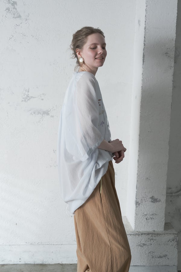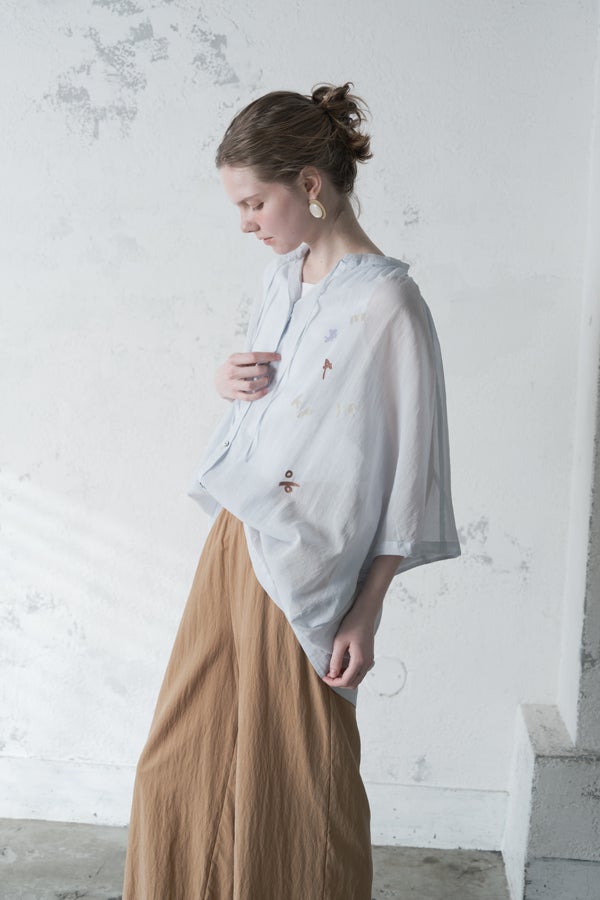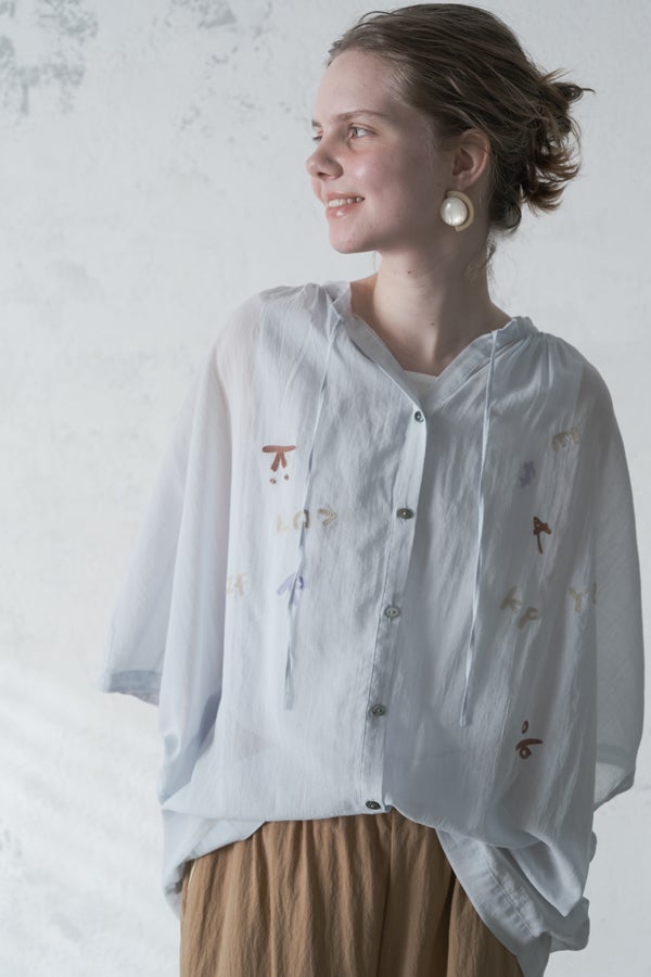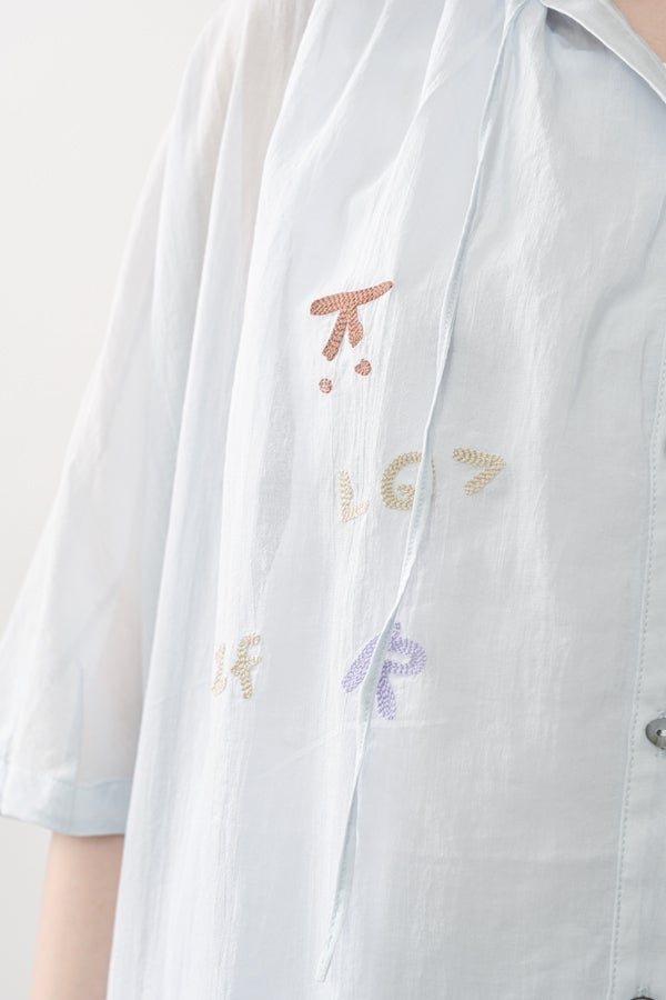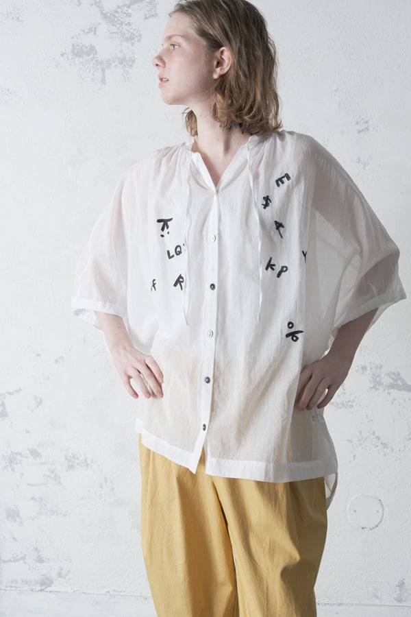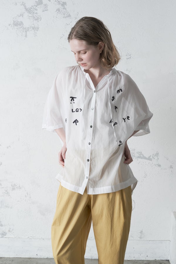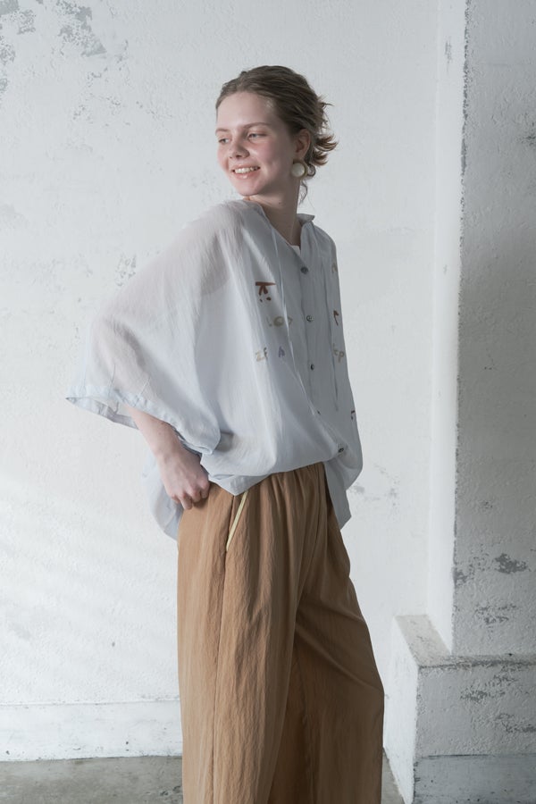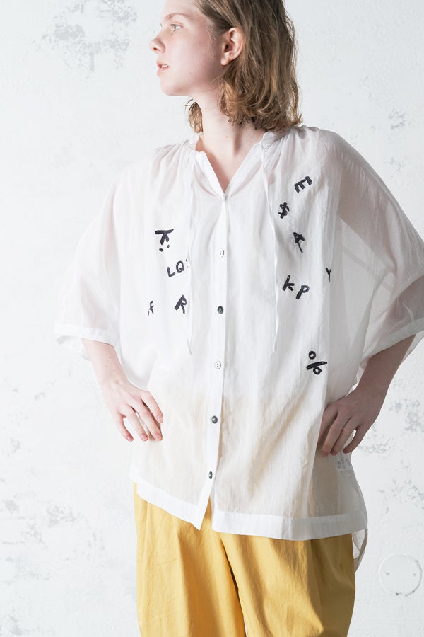空気を含むような軽やかさと涼しげな質感に、アルファベット刺繍のモチーフが大人可愛さをプラス。小ぶりな楕円形シェルボタンや前後差のある着丈、斜めに入った両脇線など、横から見たシルエットの美しさもポイントです。