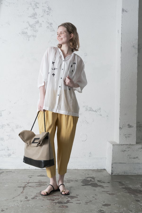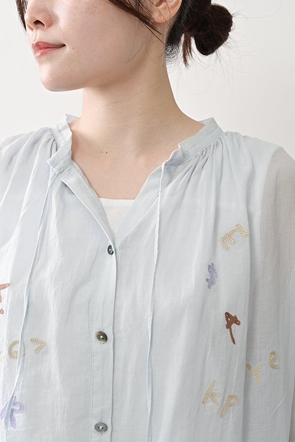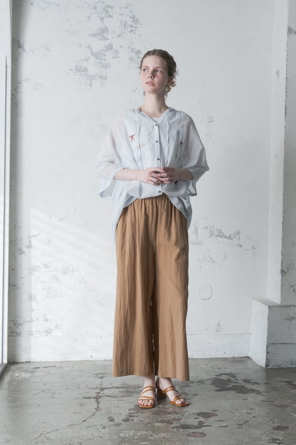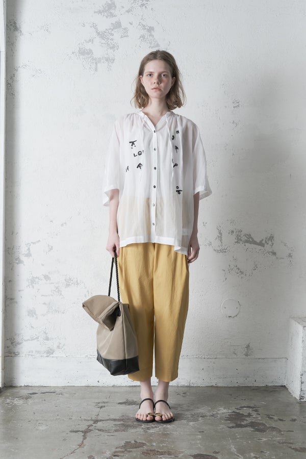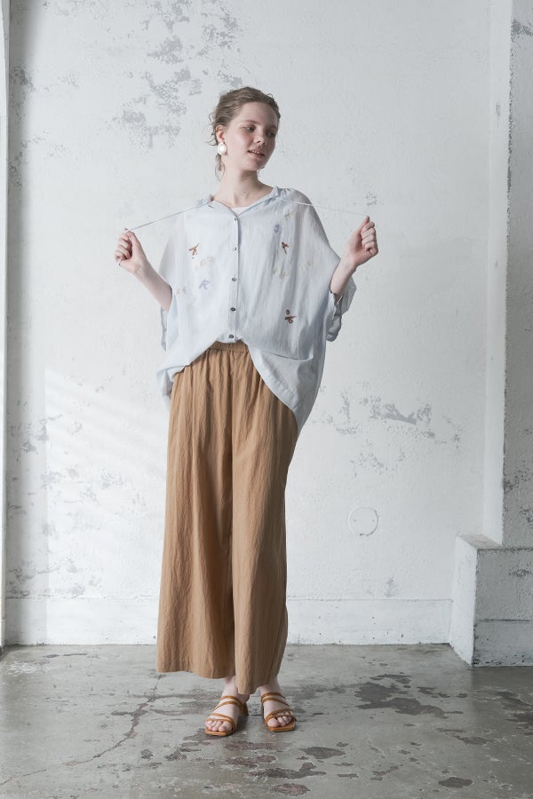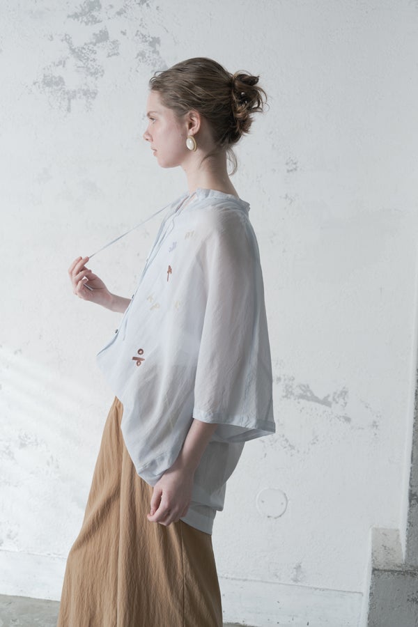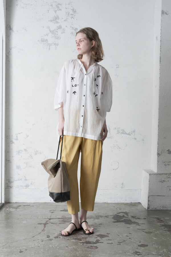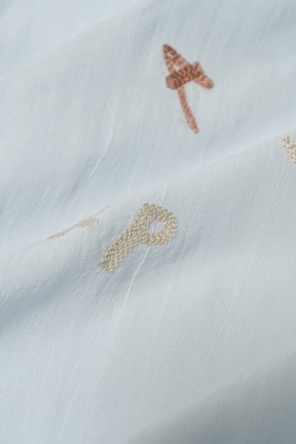 空気を含むような軽やかさと涼しげな質感に、アルファベット刺繍のモチーフが大人可愛さをプラス。小ぶりな楕円形シェルボタンや前後差のある着丈、斜めに入った両脇線など、横から見たシルエットの美しさもポイントです。