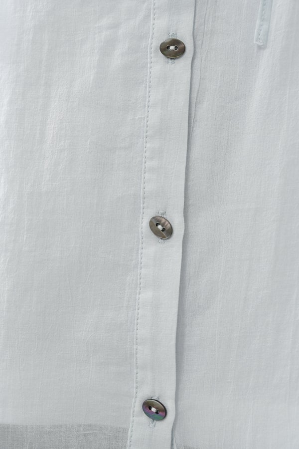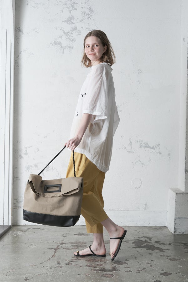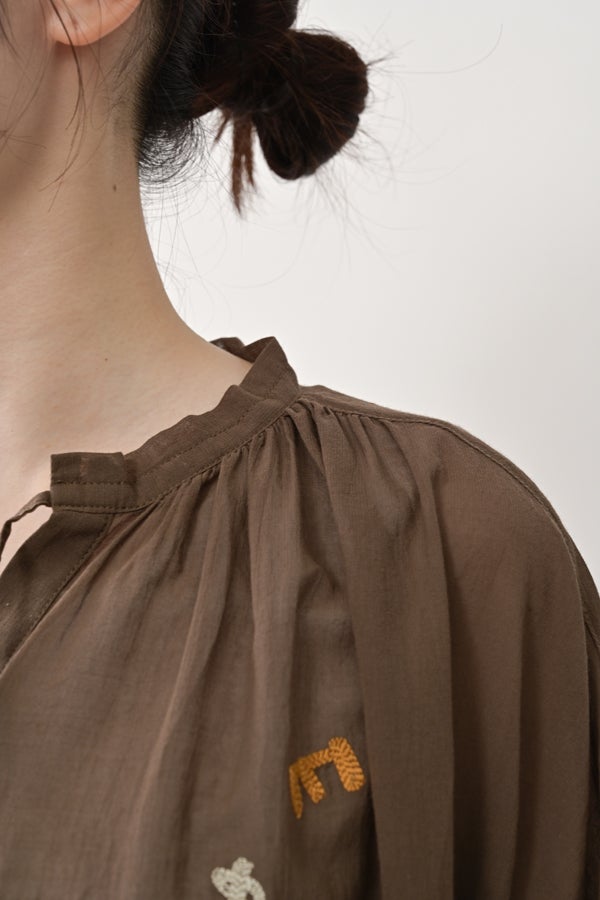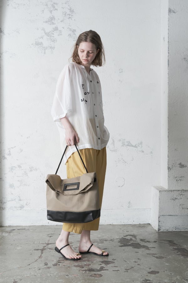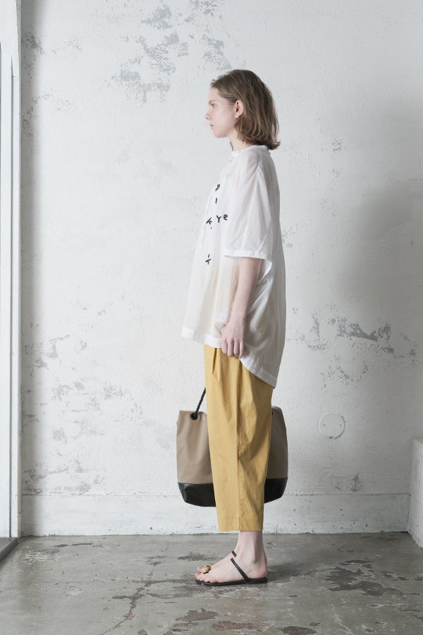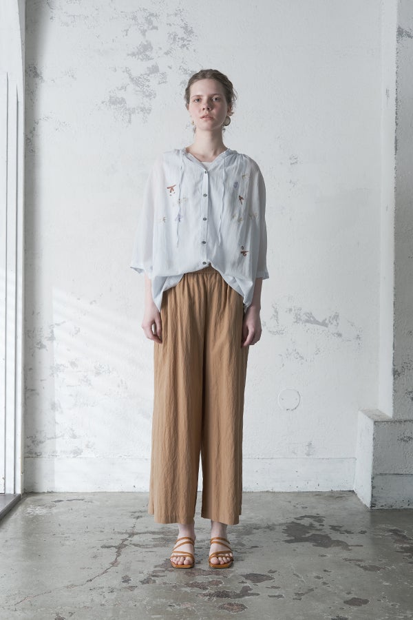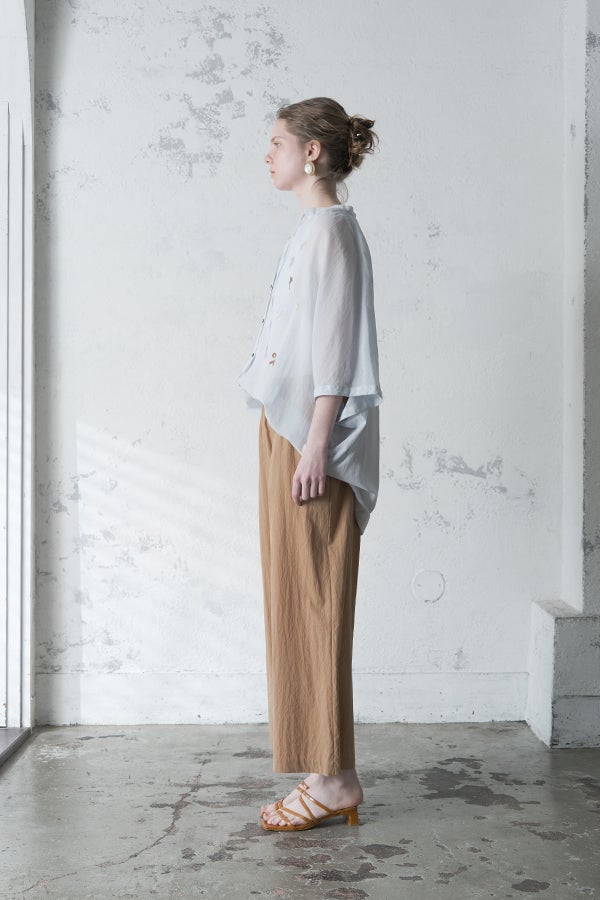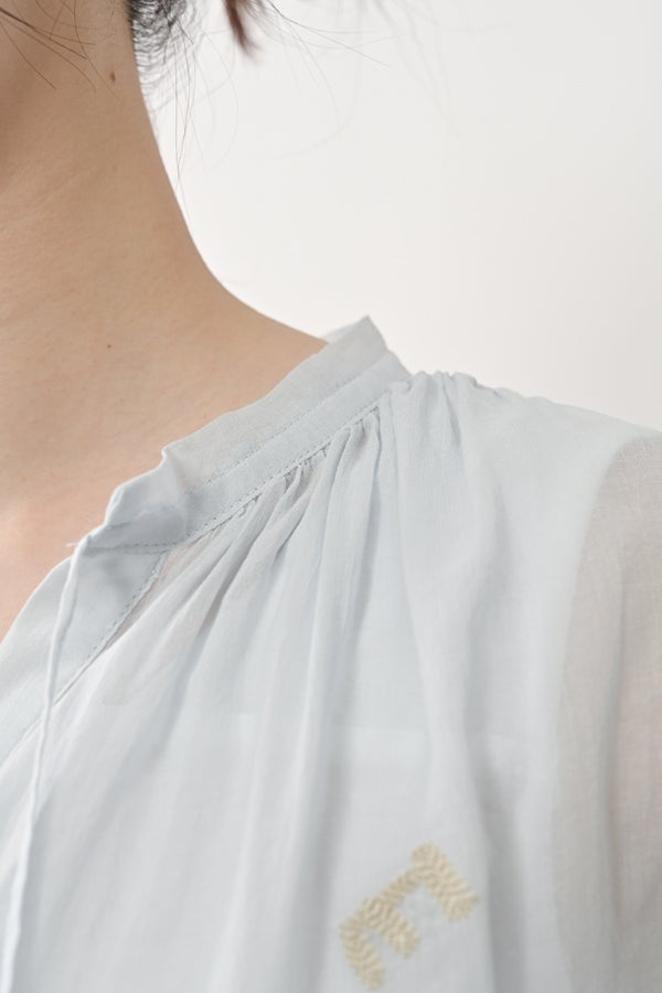 空気を含むような軽やかさと涼しげな質感に、アルファベット刺繍のモチーフが大人可愛さをプラス。小ぶりな楕円形シェルボタンや前後差のある着丈、斜めに入った両脇線など、横から見たシルエットの美しさもポイントです。