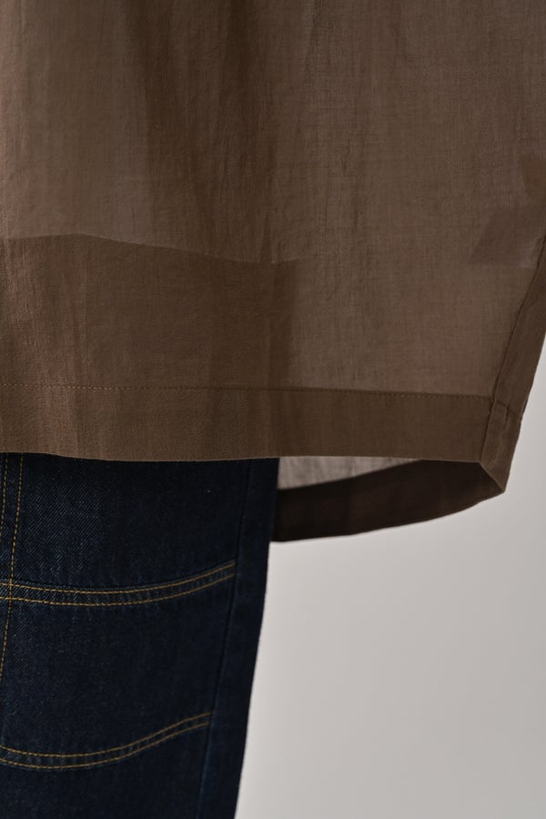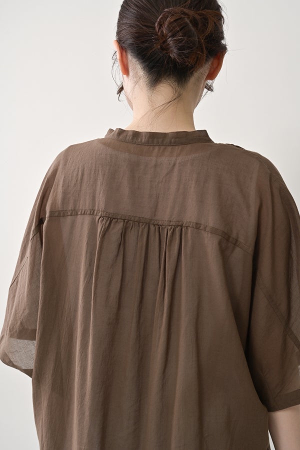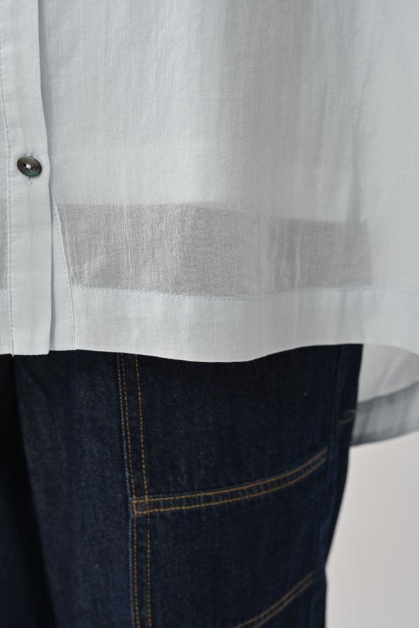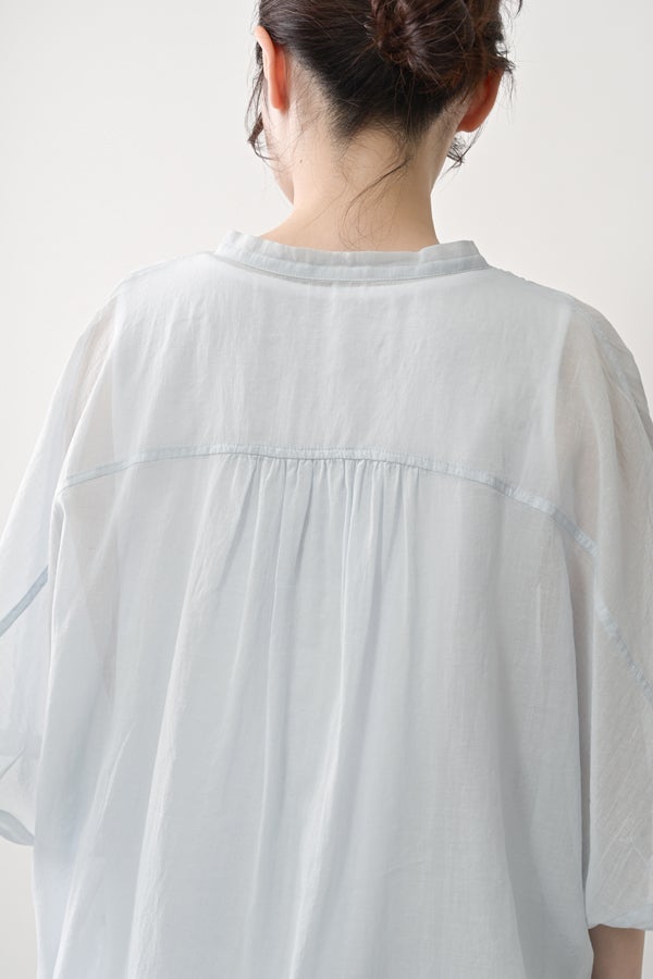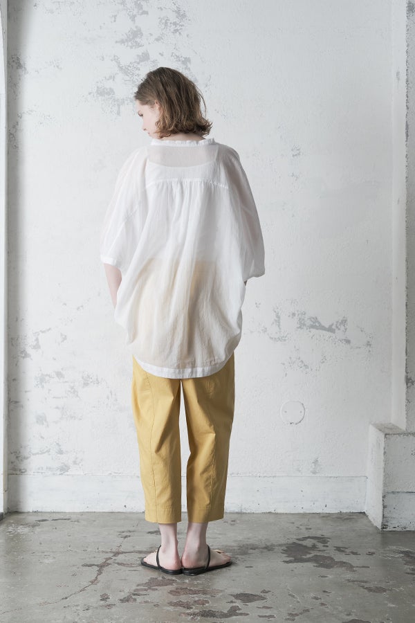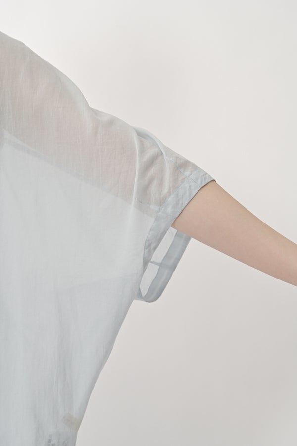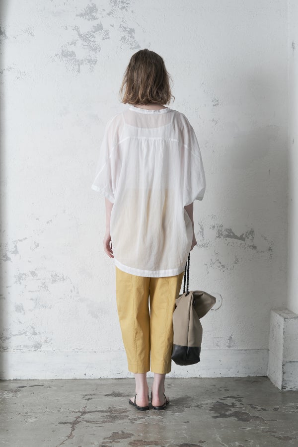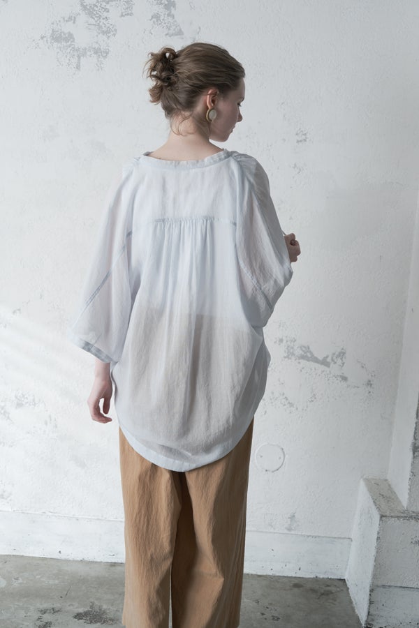 毎夏好評の薄手の強燃綿素材を使用した、透け感のある爽やかなアイテム。サラリと肌に張り付かず、暑い季節も快適に着られます。身幅を広く設定し、袖口にダーツを施した変形ドルマンシルエットは、羽織りとしてもリラックス感たっぷり。