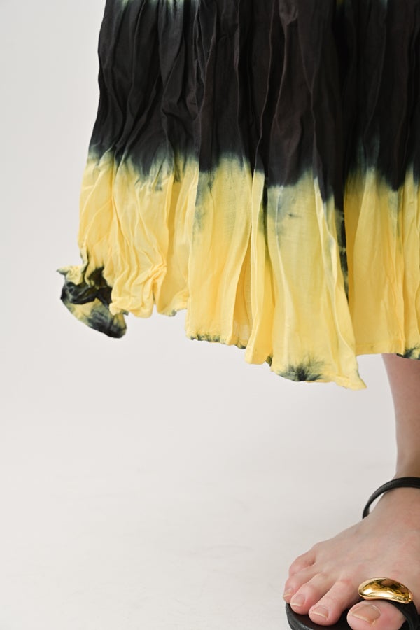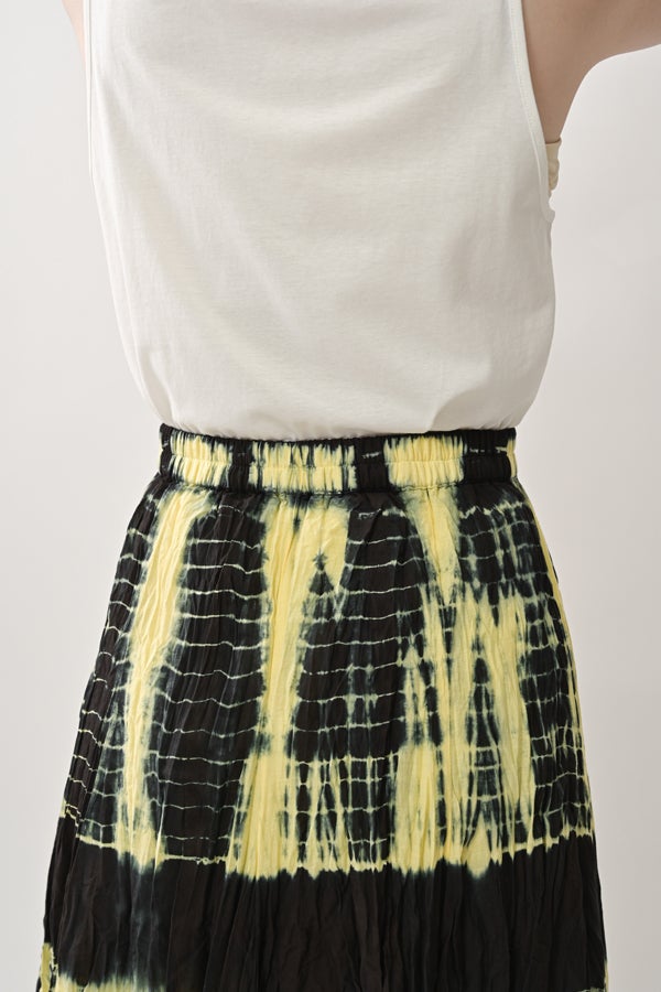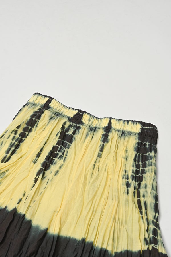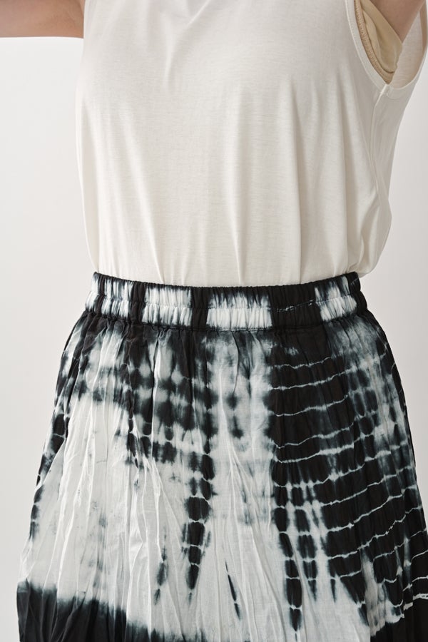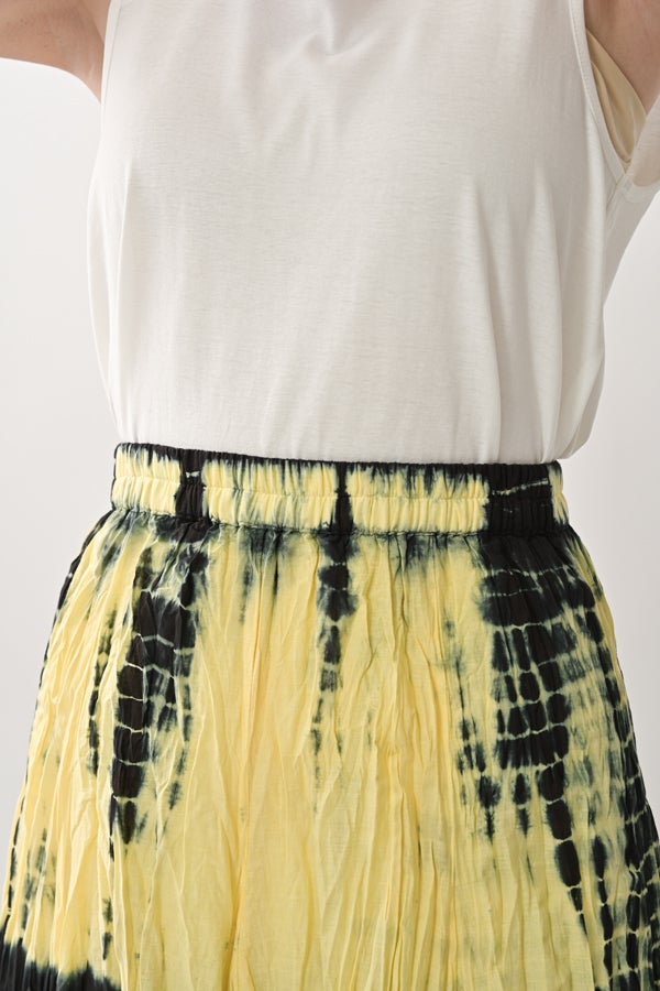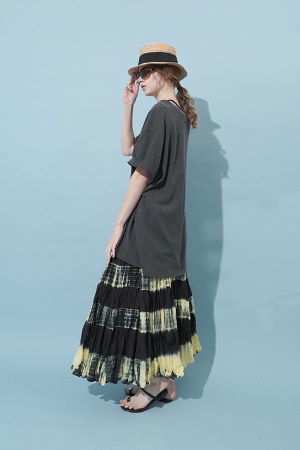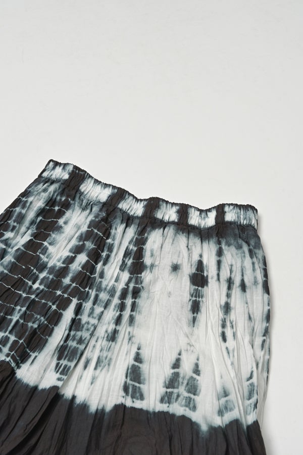 手染めのニュアンスをまとう、タイダイスカート。 インドならではの柔らかなコットンに、ひとつひとつ手作業でタイダイ柄を施した特別感のあるアイテム。落ち感のあるシルエットが広がりすぎを抑え、ほどよいボリュームで大人らしい佇まいに仕上げます。 ウエストは総ゴムでストレスのない穿き心地。もともとのランダムなシワ加工のおかげで扱いやすく、デイリーから旅先まで頼れる一枚です。 シンプルなTシャツでさらりと馴染ませれば、抜け感のあるリラックススタイルが完成。スニーカーやフラットシューズでカジュアルに寄せるのはもちろん、シャツを合わせてきれいめに振るなど、足元やトップス次第で幅広い表情が楽しめます。