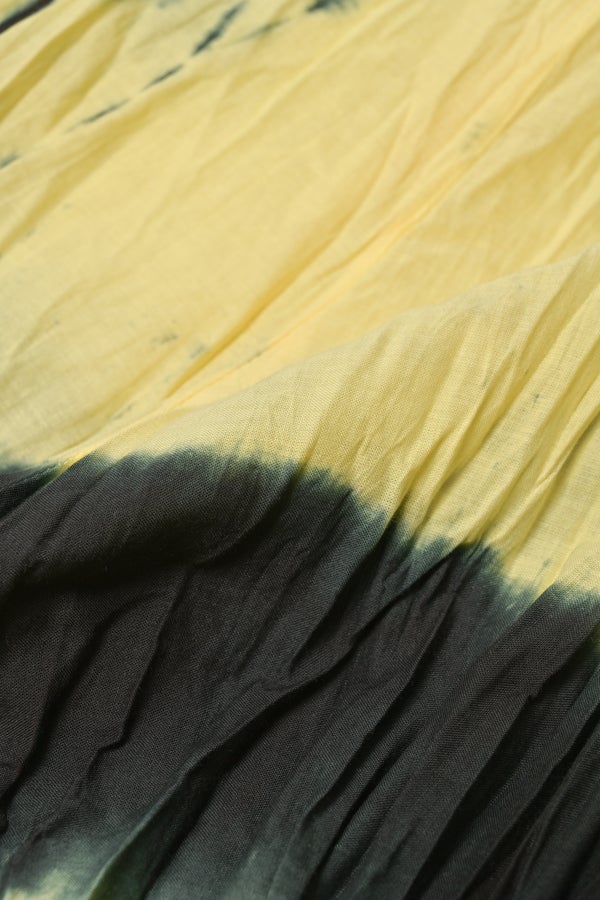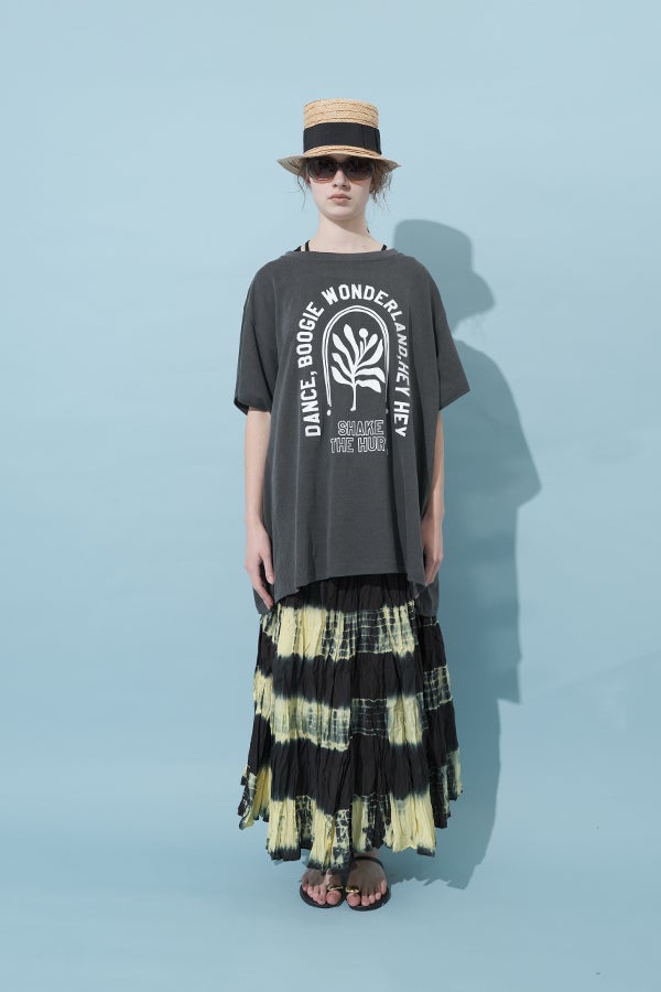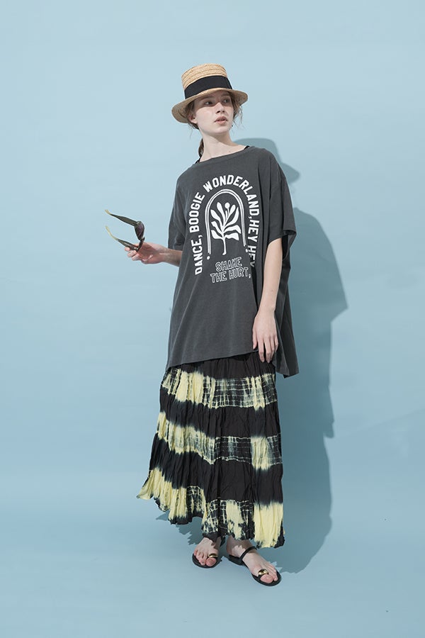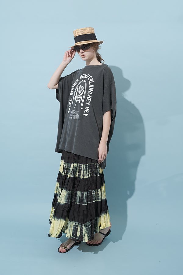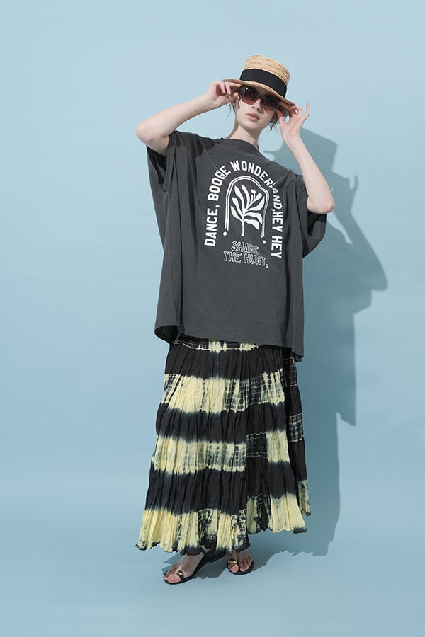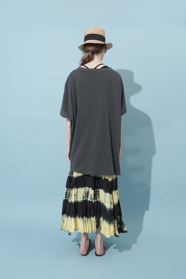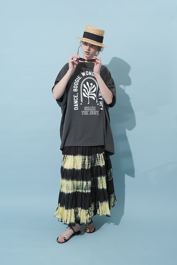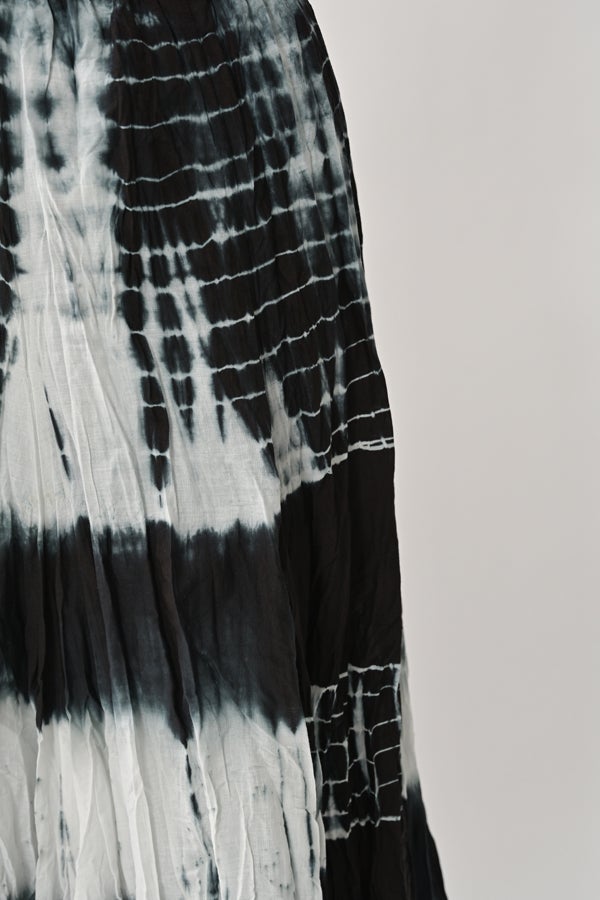 手染めのニュアンスをまとう、タイダイスカート。 インドならではの柔らかなコットンに、ひとつひとつ手作業でタイダイ柄を施した特別感のあるアイテム。落ち感のあるシルエットが広がりすぎを抑え、ほどよいボリュームで大人らしい佇まいに仕上げます。 ウエストは総ゴムでストレスのない穿き心地。もともとのランダムなシワ加工のおかげで扱いやすく、デイリーから旅先まで頼れる一枚です。 シンプルなTシャツでさらりと馴染ませれば、抜け感のあるリラックススタイルが完成。スニーカーやフラットシューズでカジュアルに寄せるのはもちろん、シャツを合わせてきれいめに振るなど、足元やトップス次第で幅広い表情が楽しめます。
