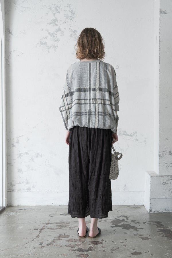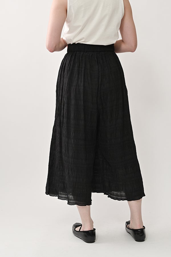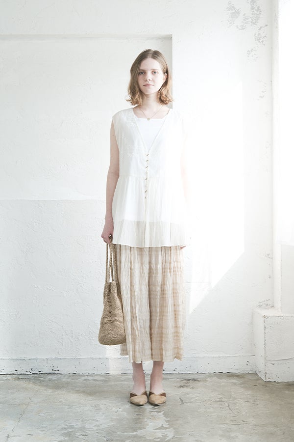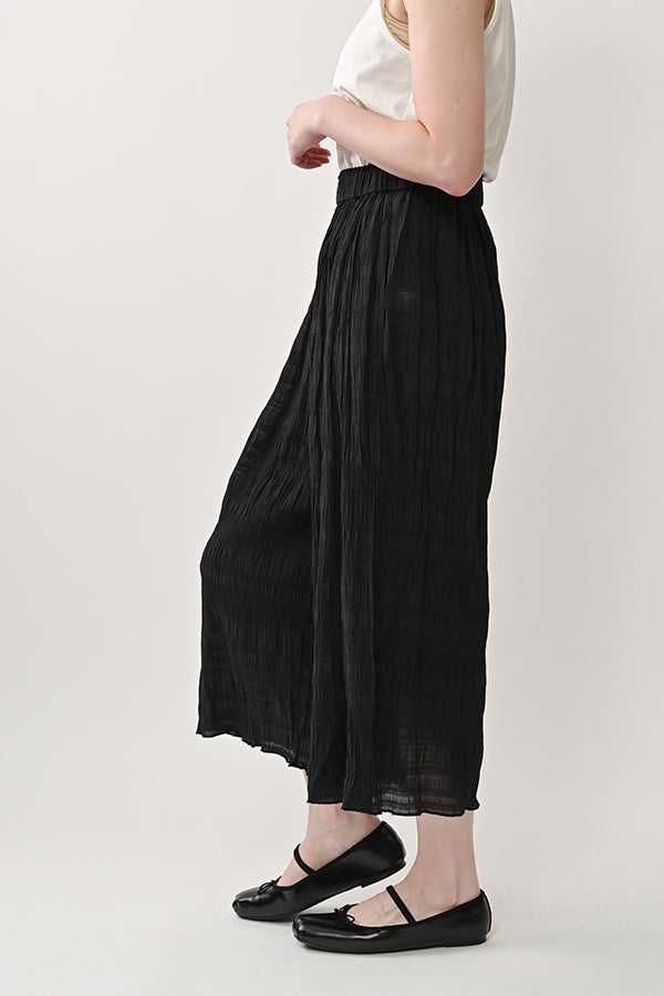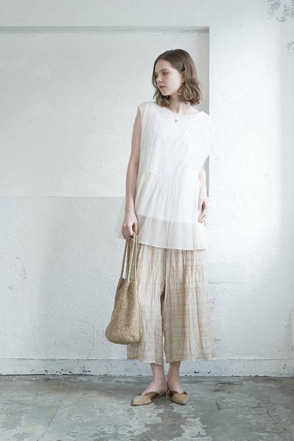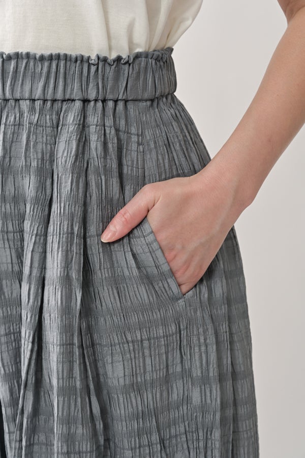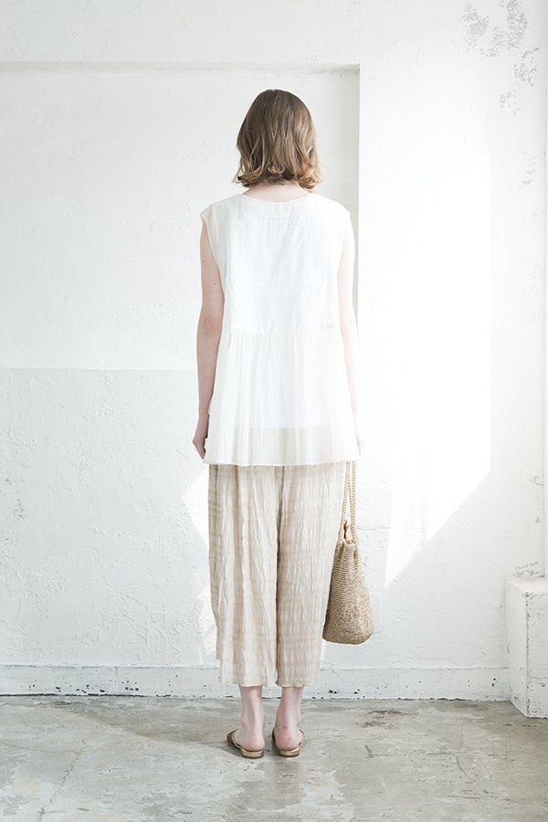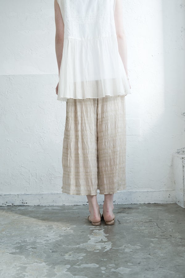 透け感のある無地ジャガードボーダーで魅せる、大人のワイドパンツ。 シャーリングによるニュアンスと適度な光沢が、上品さと程よいカジュアル感を両立。穿きこみ型のゆったりシルエットが優しく体を包み、風通しのよい軽やかな着心地を実現します。 裾はメロウミシンで軽やかに仕上げ、両脇シーム(縫い目)は内側を筒縫いにして縫い代が肌に当たらない仕様で、快適な着心地にも配慮しました。 ペチコートパンツは機能性を備えた仕掛け付き。透け防止はもちろん、裾にゴムが入っているため、本体パンツの裾も一緒に巻き上げることが可能です。パンツが床についてしまうお悩みを解消し、ゴム上り寸法もゆったりめなので、着用時の締め付け感も心配ありません。 大人の夏コーデに欠かせない、機能性と洒落感を兼ね備えた一本です。