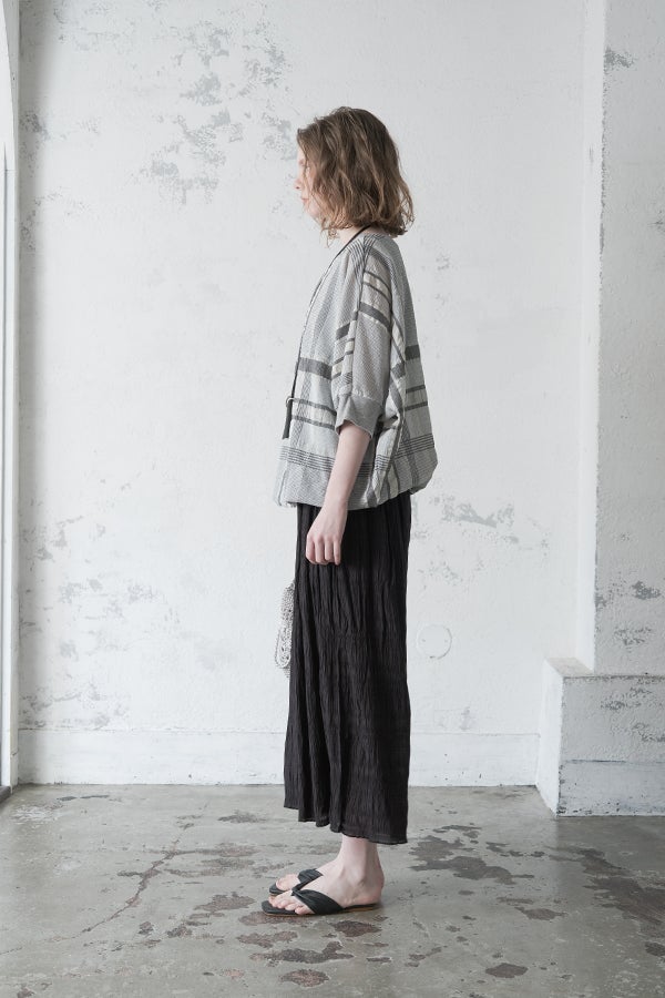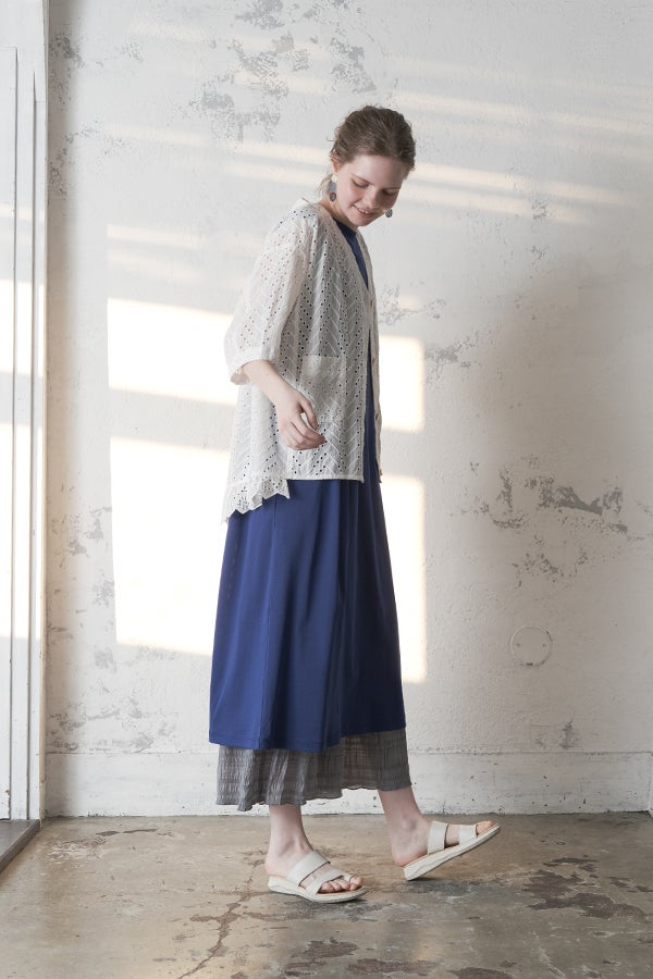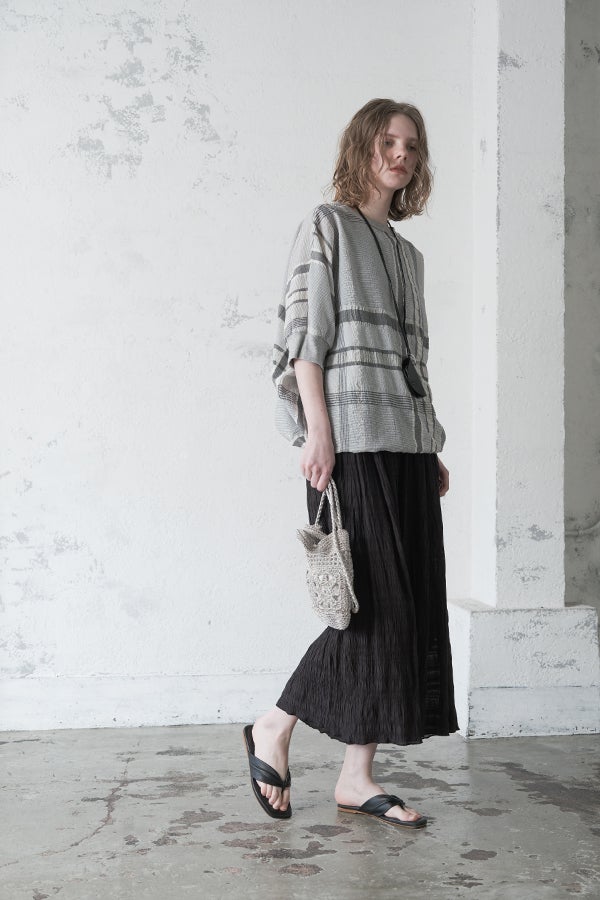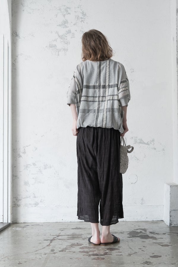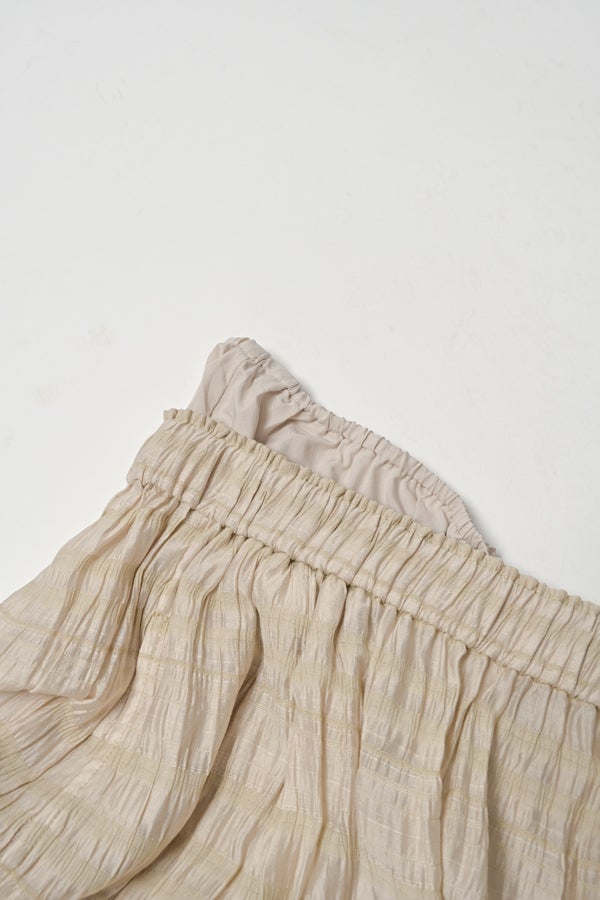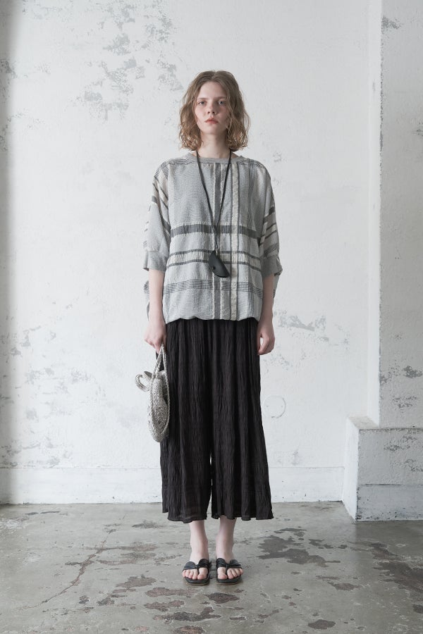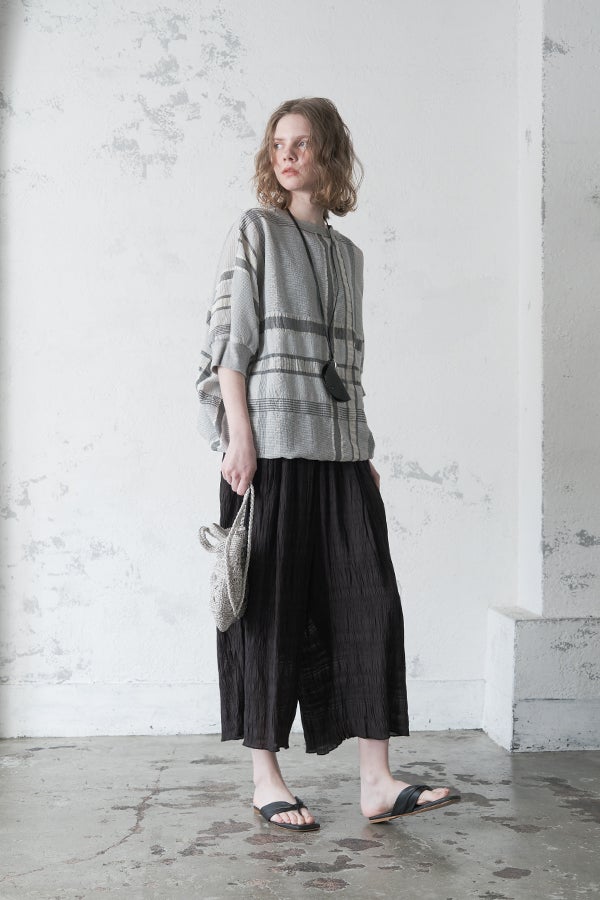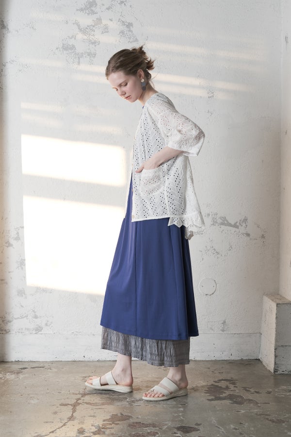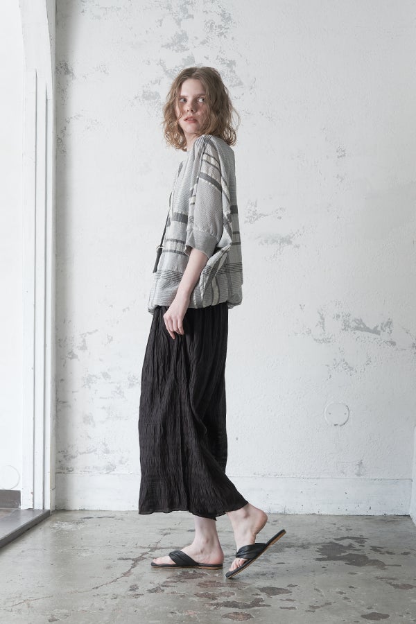 透け感のある無地ジャガードボーダーで魅せる、大人のワイドパンツ。 シャーリングによるニュアンスと適度な光沢が、上品さと程よいカジュアル感を両立。穿きこみ型のゆったりシルエットが優しく体を包み、風通しのよい軽やかな着心地を実現します。 裾はメロウミシンで軽やかに仕上げ、両脇シーム(縫い目)は内側を筒縫いにして縫い代が肌に当たらない仕様で、快適な着心地にも配慮しました。 ペチコートパンツは機能性を備えた仕掛け付き。透け防止はもちろん、裾にゴムが入っているため、本体パンツの裾も一緒に巻き上げることが可能です。パンツが床についてしまうお悩みを解消し、ゴム上り寸法もゆったりめなので、着用時の締め付け感も心配ありません。 大人の夏コーデに欠かせない、機能性と洒落感を兼ね備えた一本です。
