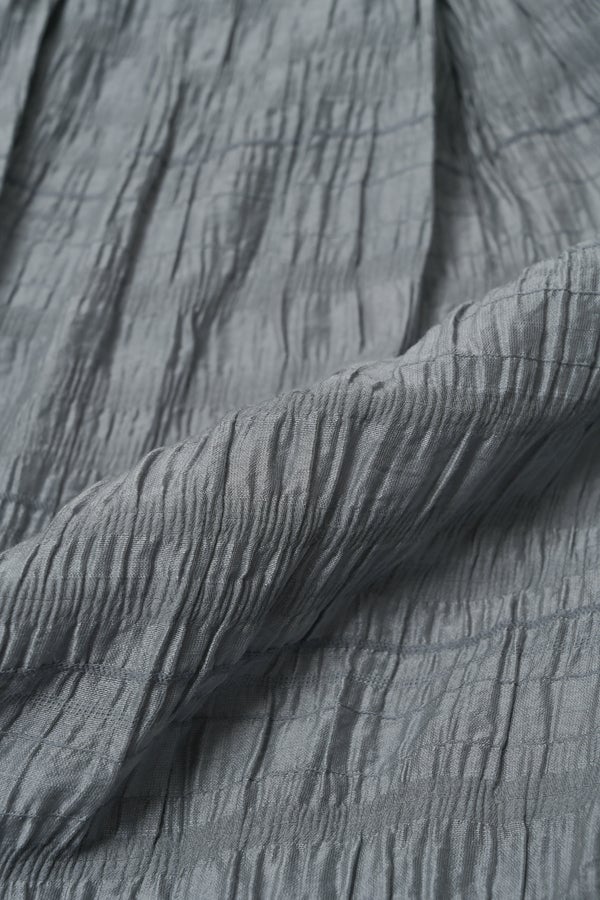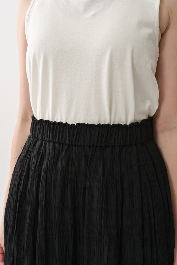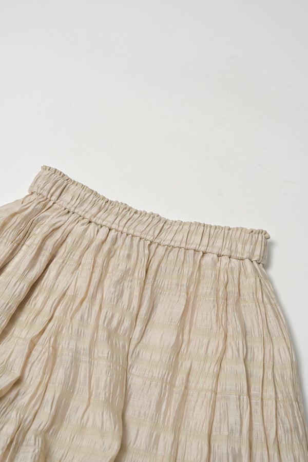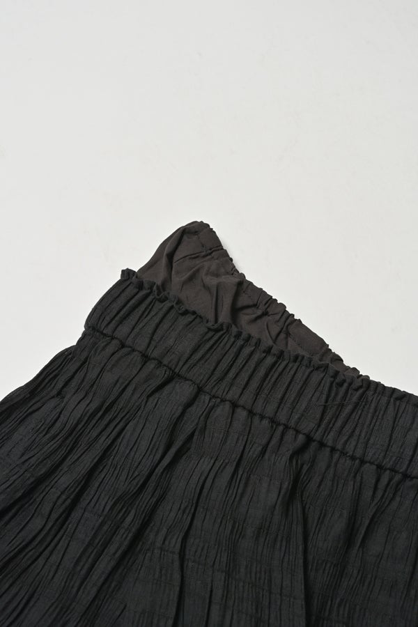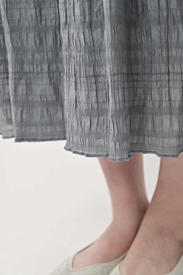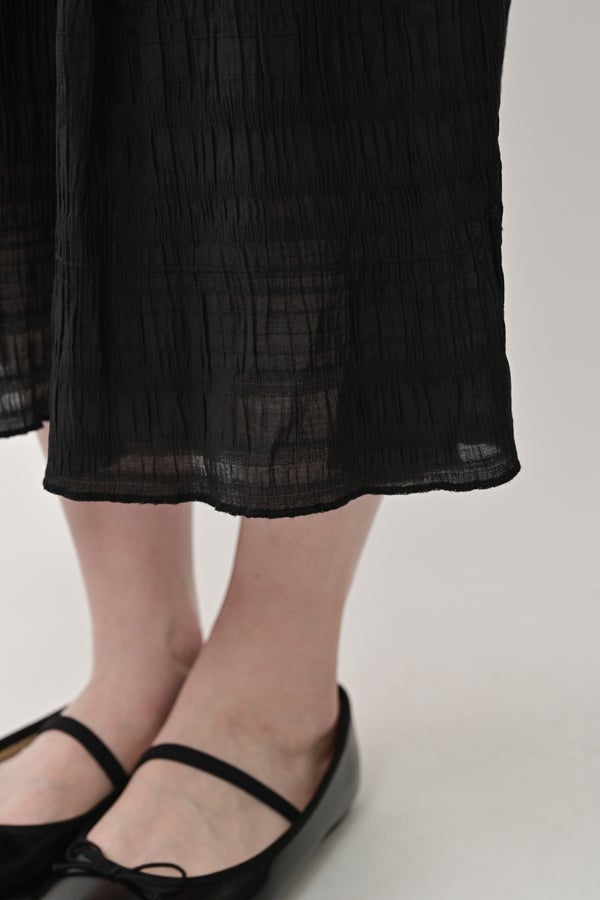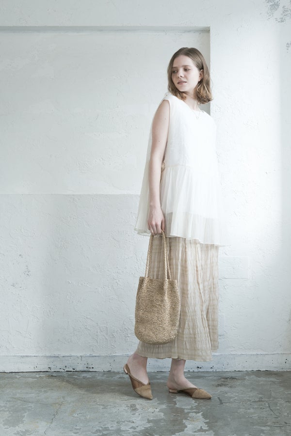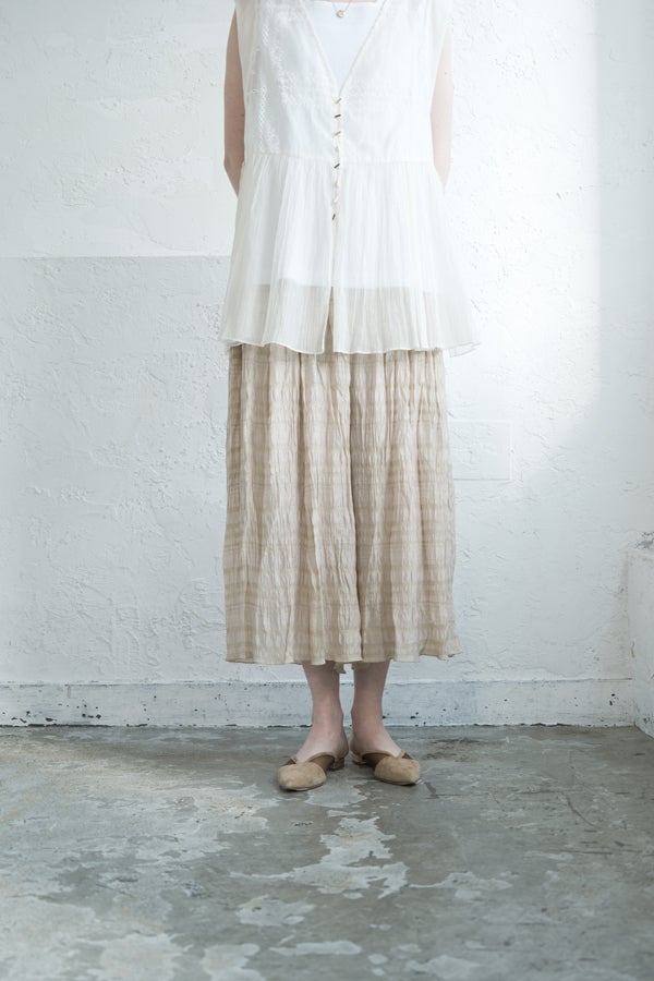 透け感のある無地ジャガードボーダーで魅せる、大人のワイドパンツ。 シャーリングによるニュアンスと適度な光沢が、上品さと程よいカジュアル感を両立。穿きこみ型のゆったりシルエットが優しく体を包み、風通しのよい軽やかな着心地を実現します。 裾はメロウミシンで軽やかに仕上げ、両脇シーム(縫い目)は内側を筒縫いにして縫い代が肌に当たらない仕様で、快適な着心地にも配慮しました。 ペチコートパンツは機能性を備えた仕掛け付き。透け防止はもちろん、裾にゴムが入っているため、本体パンツの裾も一緒に巻き上げることが可能です。パンツが床についてしまうお悩みを解消し、ゴム上り寸法もゆったりめなので、着用時の締め付け感も心配ありません。 大人の夏コーデに欠かせない、機能性と洒落感を兼ね備えた一本です。