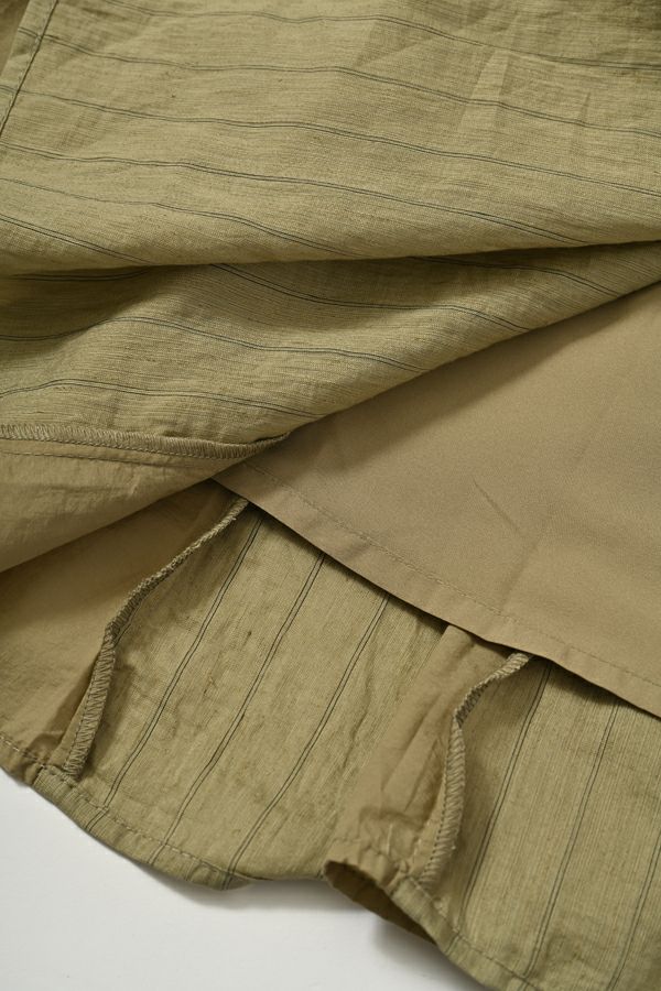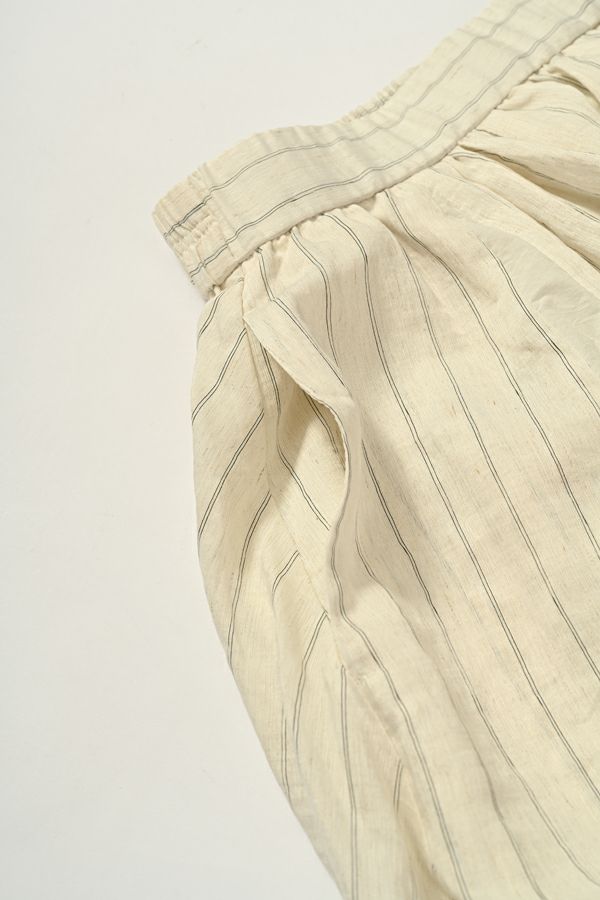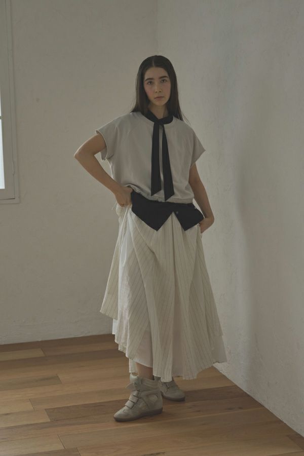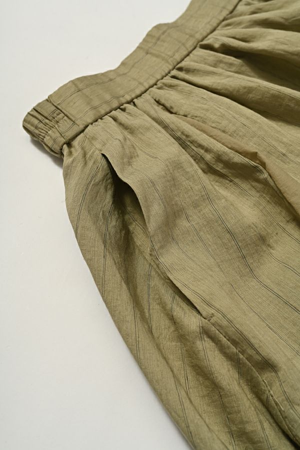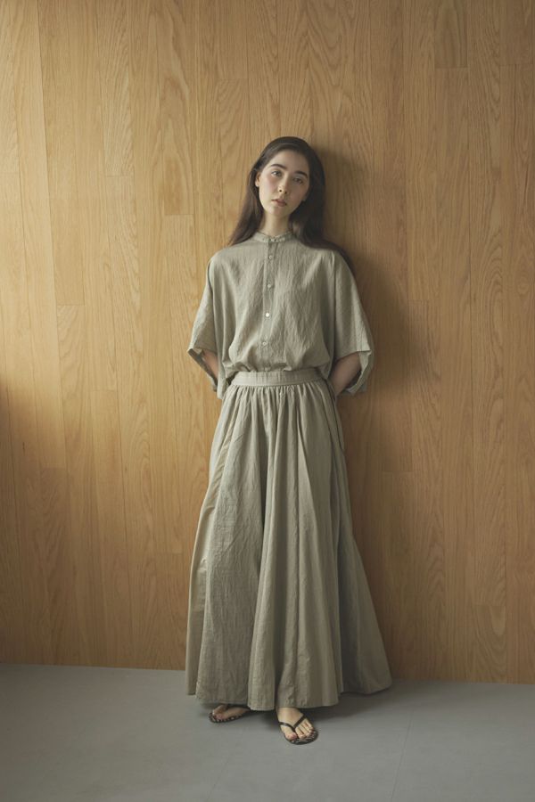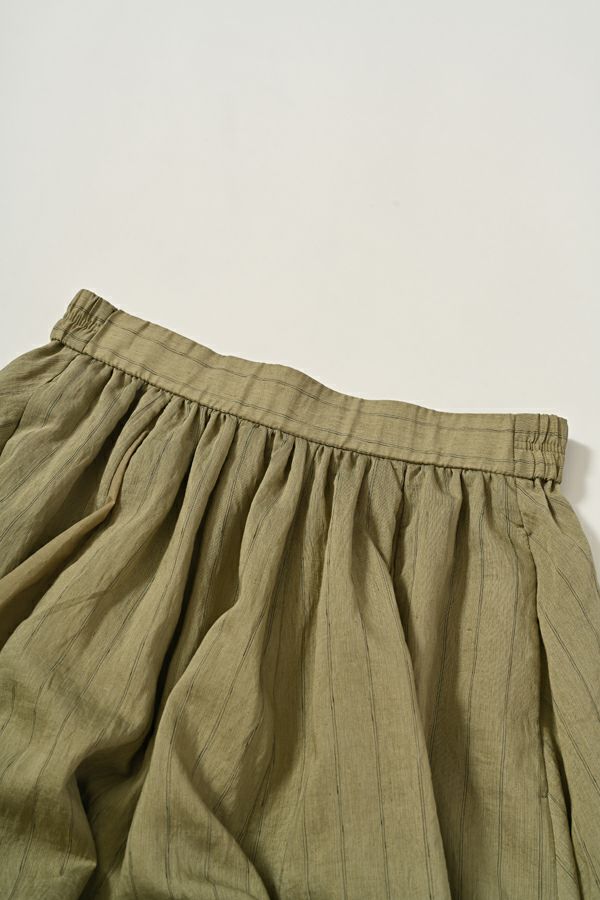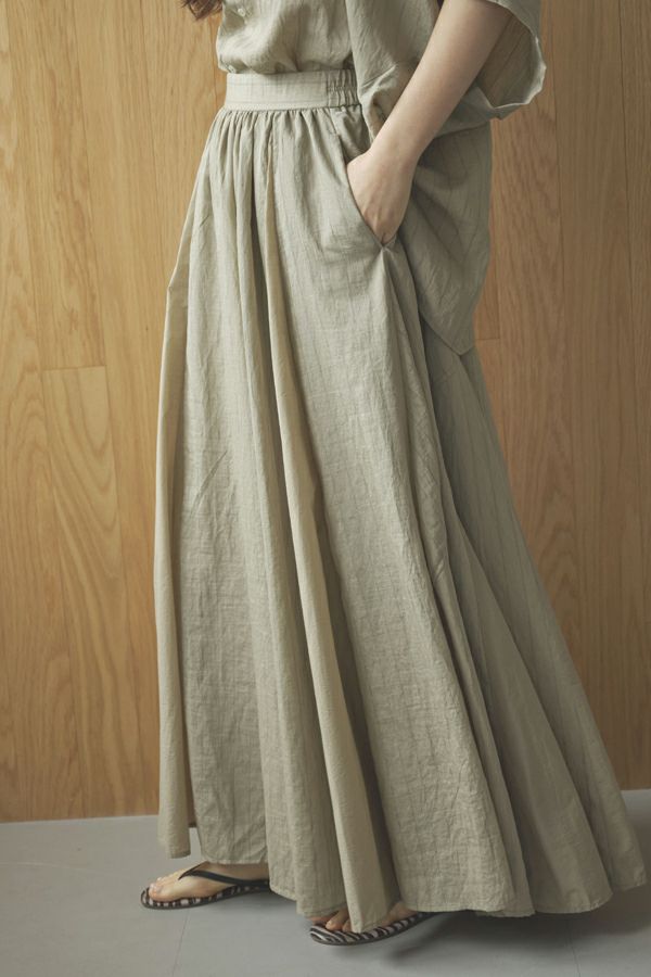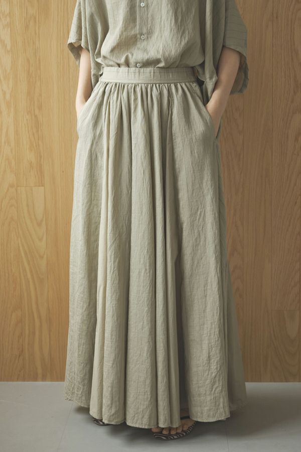 存在感抜群のボリュームで映えで確定、大人の雰囲気溢れるギャザースカート。 昨年に大好評のギャザースカートにストライプバージョンが登場です。 マチの部分は無地の素材を使用し、より表情が出るデザインとなりました。前ウエストはテンション(伸縮性)無しのため スッキリきれい見えし、後ろウエストにはしっかりゴムを入れアジャストも利くように仕上げています。 同素材のストライプポンチョシャツ(25163-4309P)とセットアップ着用でコンビネゾン見えにもなります。セットアップ着用もおすすめですが、Tシャツ合わせのカジュアルスタイルも良いですし、オケージョンスタイルでジャケットコーディネートなどマルチに活用できるスカートです。 ●手洗い可 ●同素材のストライプポンチョシャツ(25163-4309P)とセットアップ可