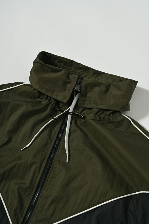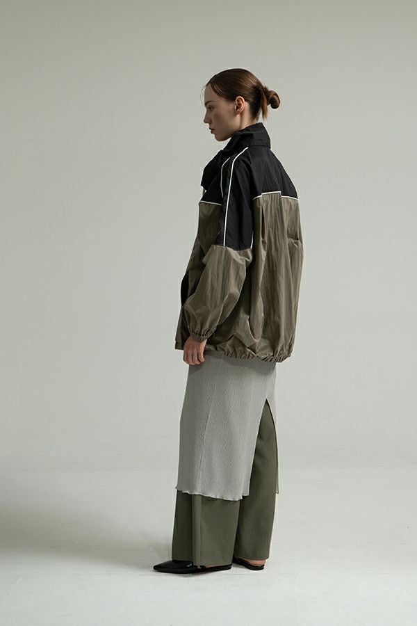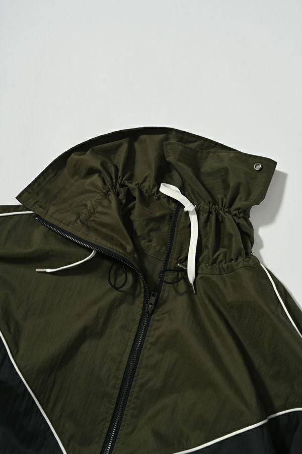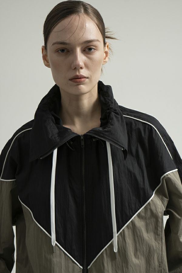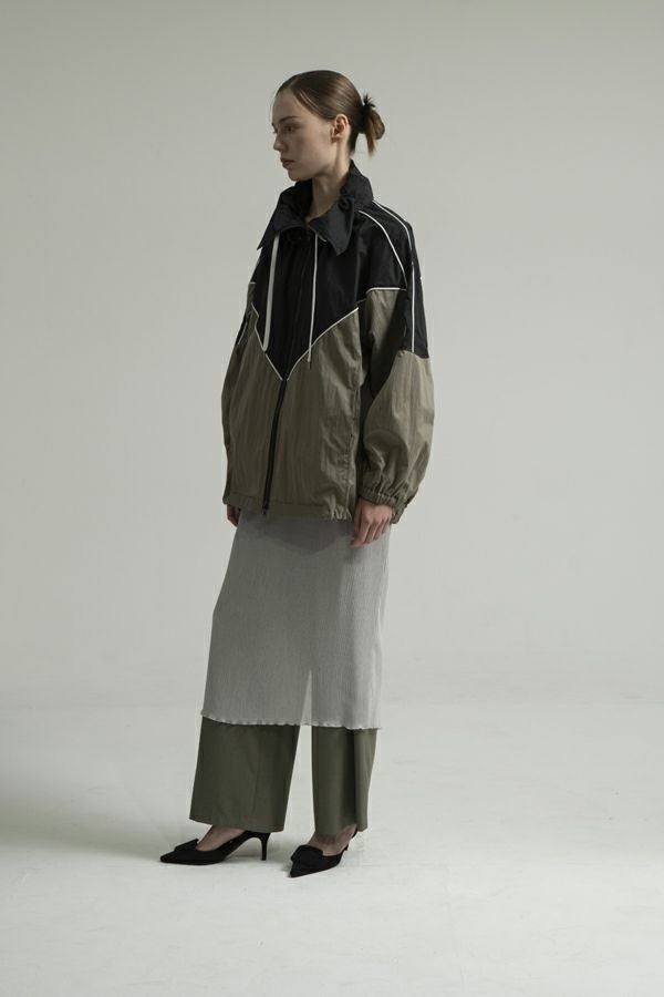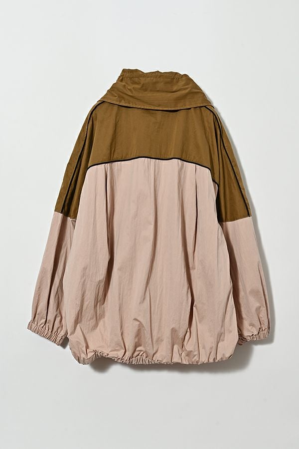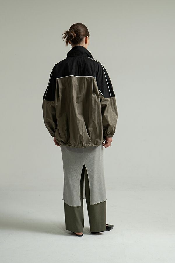 スポーティー&スタイリッシュなデザイン、ナイロンブロッキングブルゾン。 軽くて丈夫なナイロン素材を使用したこのブルゾンは、持ち運びにも便利で、乾きも早いので頻繁にお洗濯しても安心。季節の変わり目に最適なアイテムです。 ブロッキングによるカラーコンビネーションがアクセントとなり、スタイリッシュな印象を与えます。 トレンドを押さえた高さのある衿は、折り返したりコードで絞ったりとアレンジ可能。ダブルジップでさらにオリジナルな着こなしを楽しめます。スポーティーな要素にデザイン性が加わり、洗練されたアーバンカジュアルなスタイリングが完成します。スカート合わせで女性らしい装いを楽しむこともできますし、ワイドパンツやオールインワンなどアクティブなコーディネートの際には、小物やアクセサリーをうまく取り入れることで、より魅力的に仕上がります。
