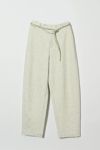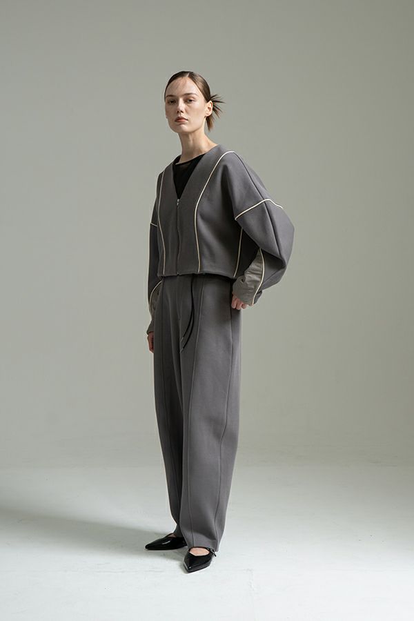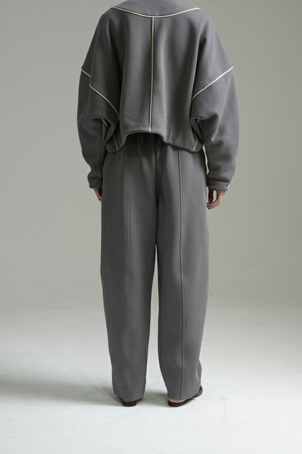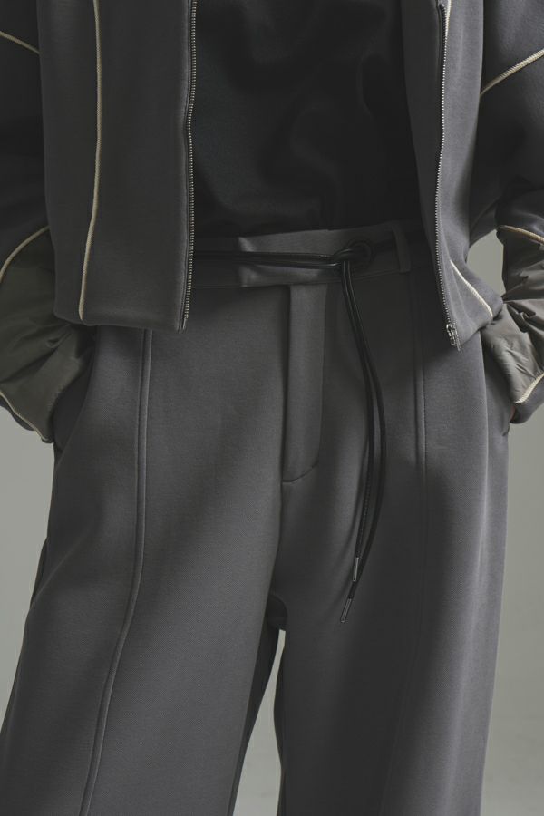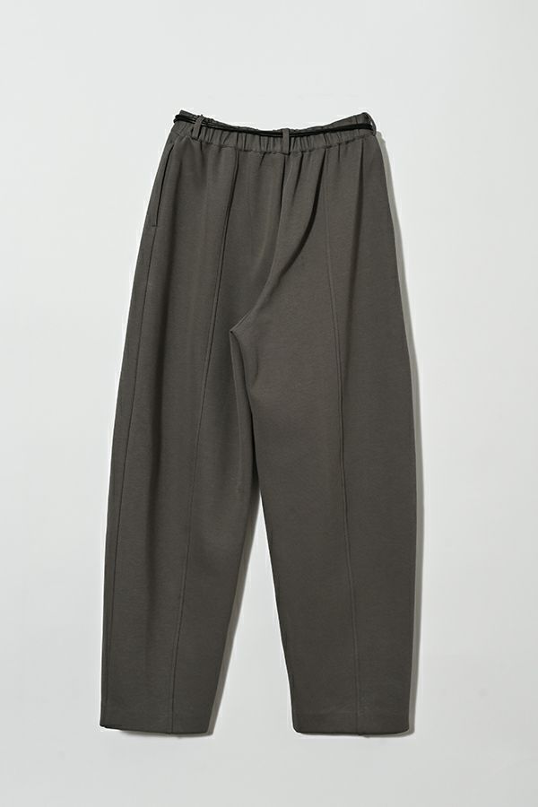 リラックス感とモードが融合、バナナカーブパンツ。 程よいハリ感とストレッチ性を兼ね備えたダンボールカットソー素材を使用した、バナナカーブシルエットは、個性的なフォルムながら、着用すると不思議とすっきりとした印象に仕上がる、計算されたデザインです。太もものラインに沿いながらも自然にカバーし、スラリと美しいレッグラインを演出。 シワになりにくく、ウエストゴム仕様でストレスフリーな着脱が可能。リラックス感とモードな雰囲気を両立させた、大人のための洗練された一本です。 【秋のニュートラルレイヤードスタイル】 ・足元はボリュームソールのブーツを合わせて、トレンド感をアップ。 ・上品にまとめるなら、ロングコート+華奢なパンプスで大人の印象に。