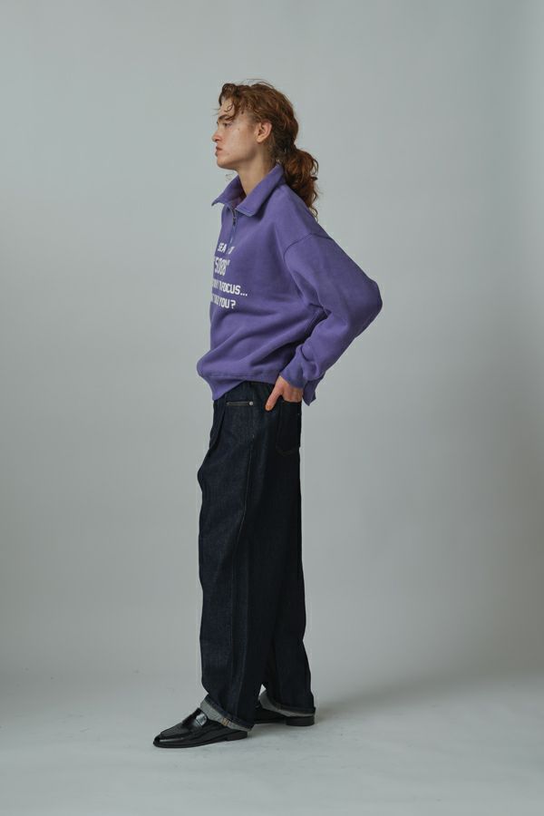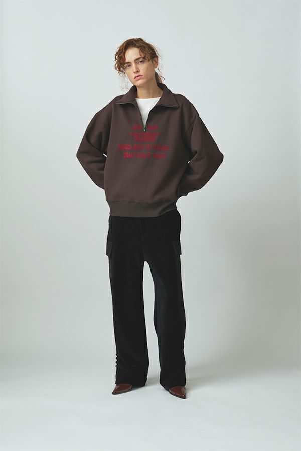 オフの感性、抜け感を操る大人スウェット。 柔らかな裏起毛とハーフジップのバランスが絶妙な、都会派スウェット。綿/ポリエステルの混紡素材は、綿100%に比べて速乾性があり、冬場のケアもスマートに。ふっくらとした肉感がありながら、軽やかで扱いやすいのも嬉しいポイントです。 胸元には、温もりのあるフロッキープリントで個性をひとさじ。 【SEARCH "5088" WHICH WAY TO FOCUS… WHAT CALLS YOU?】 というメッセージには、自分を中心に、広く世界を見渡した先で心が惹かれるものを探す…という意味が込められています。直感や衝動を大切にする、大人の感性に響く一着です。 カジュアルな印象のハーフジップも、ウールのワイドパンツやセンタープレス入りのきれいめボトムと合わせることで、洗練されたミックススタイルに昇華。ボトムにボリュームを持たせれば、力の抜けたこなれ感が自然と生まれます。フロッキーの色味に合わせた足元で、スタイリングに一貫性と奥行きを。 オンでは見せない表情を引き出してくれる、マインドフルなオフのための一枚。